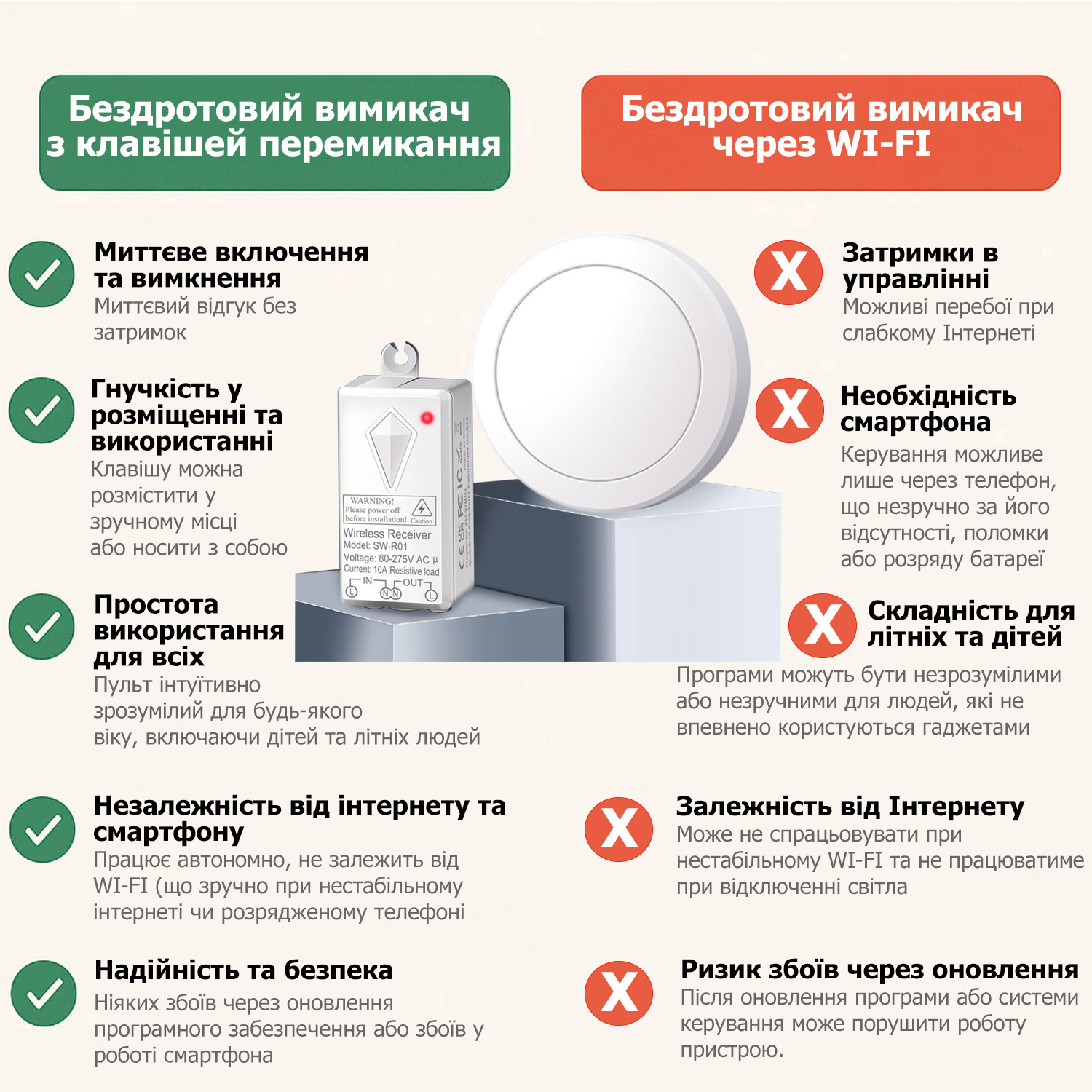 Зверніть увагу, що бездротовий вимикач працює тільки в парі з приймальним блоком (наведений в рекомендаціях до вимикача).