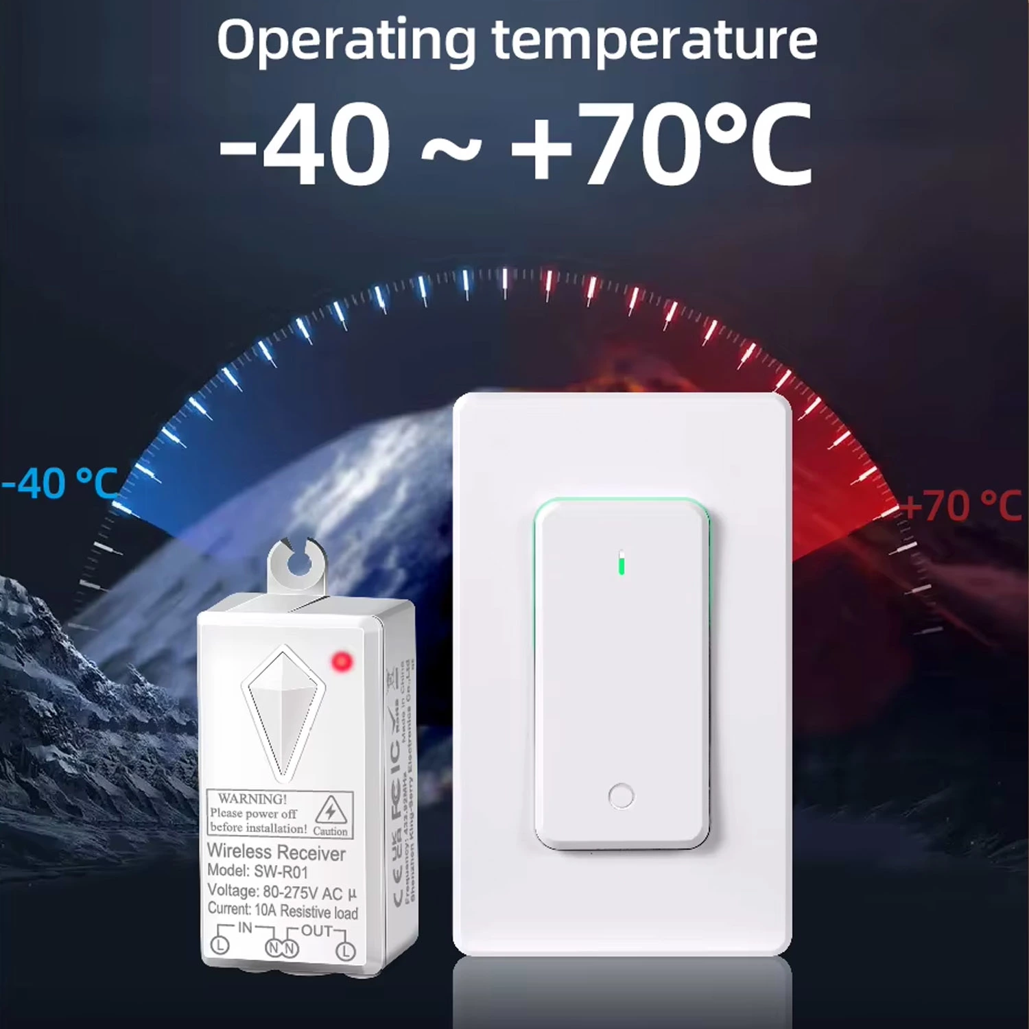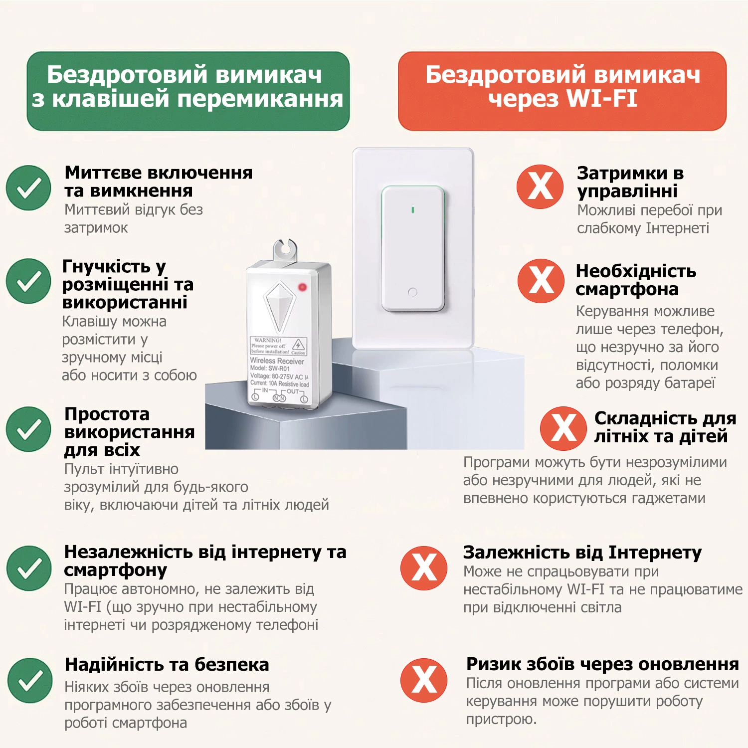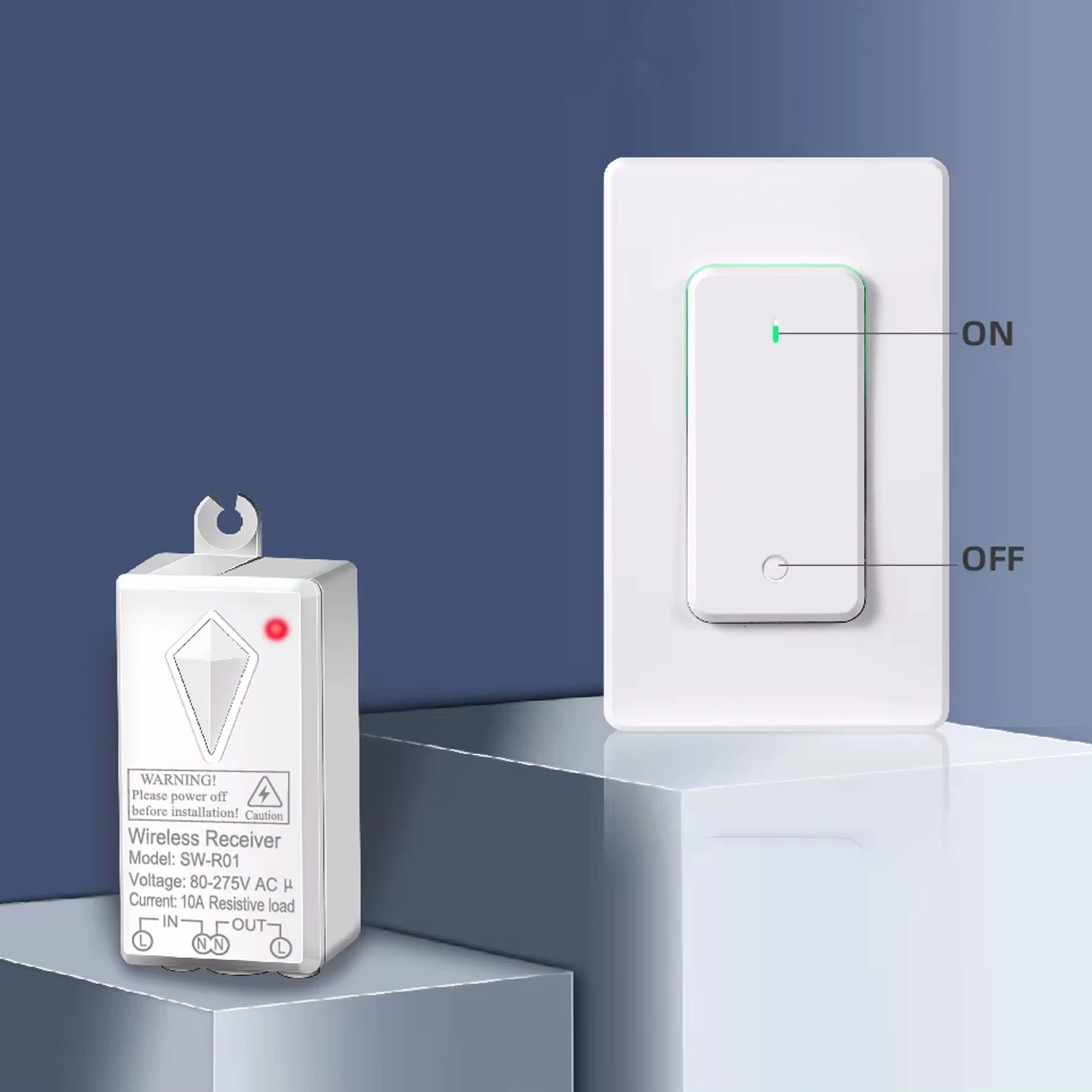 • Швидко та без штроблення встановити вимикач у будь-якому місці. Без проводів, ремонту та пилу – приймальний блок встановлюється у світильник, розетку або за стелею, а перемикач кріпиться у зручному місці: на стіні, меблях або носиться з собою.