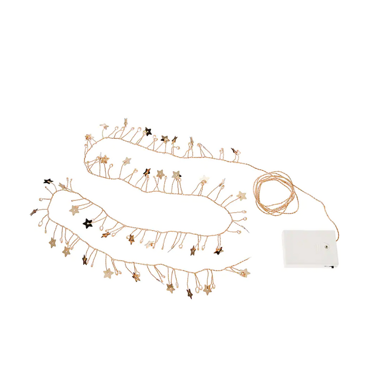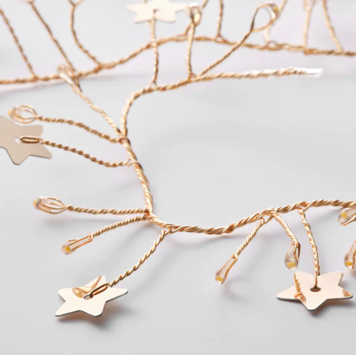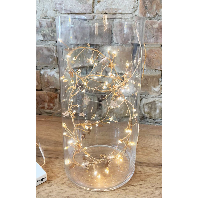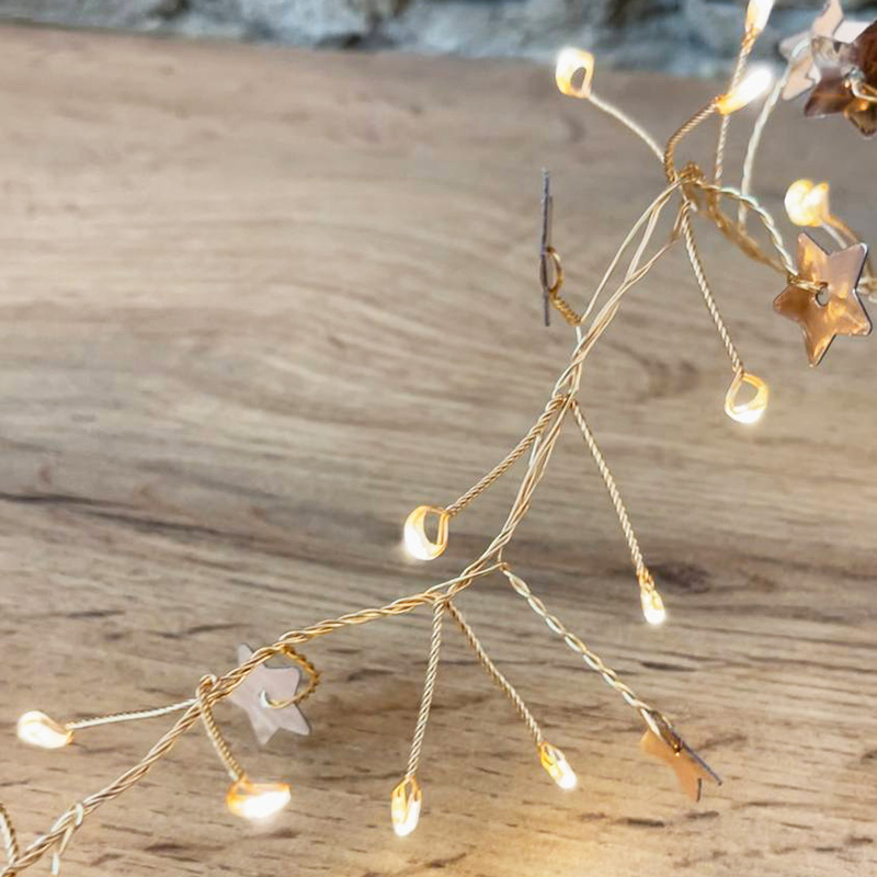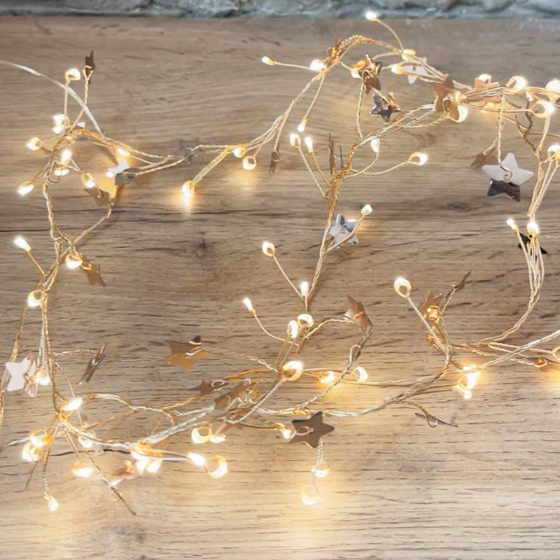 Гірлянда складається з дрібних світлодіодів в ізоляції у вигляді краплі на тонкому гнучкому дроті в поєднанні із золотими зірочками. Така прикраса – це не просто святкова ілюмінація, а й відмінний фон для фотозони або додатковий елемент декору.