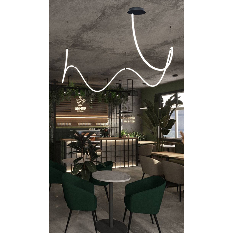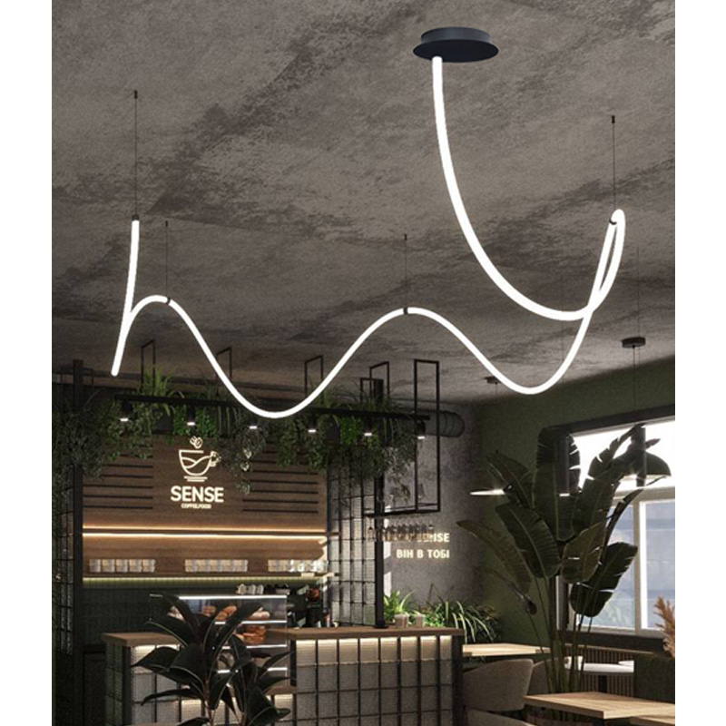 Оригінальна люстра Nordik F являє собою LED неон білого матового кольору 22 мм, всередині якого проходить світлодіодна стрічка, закріплена на підвісах. В результаті заломлення світла у включеному стані виходить яскрава неонова дуга, що рівномірно світиться, яка додасть Вашому інтер'єру сучасних фарб.