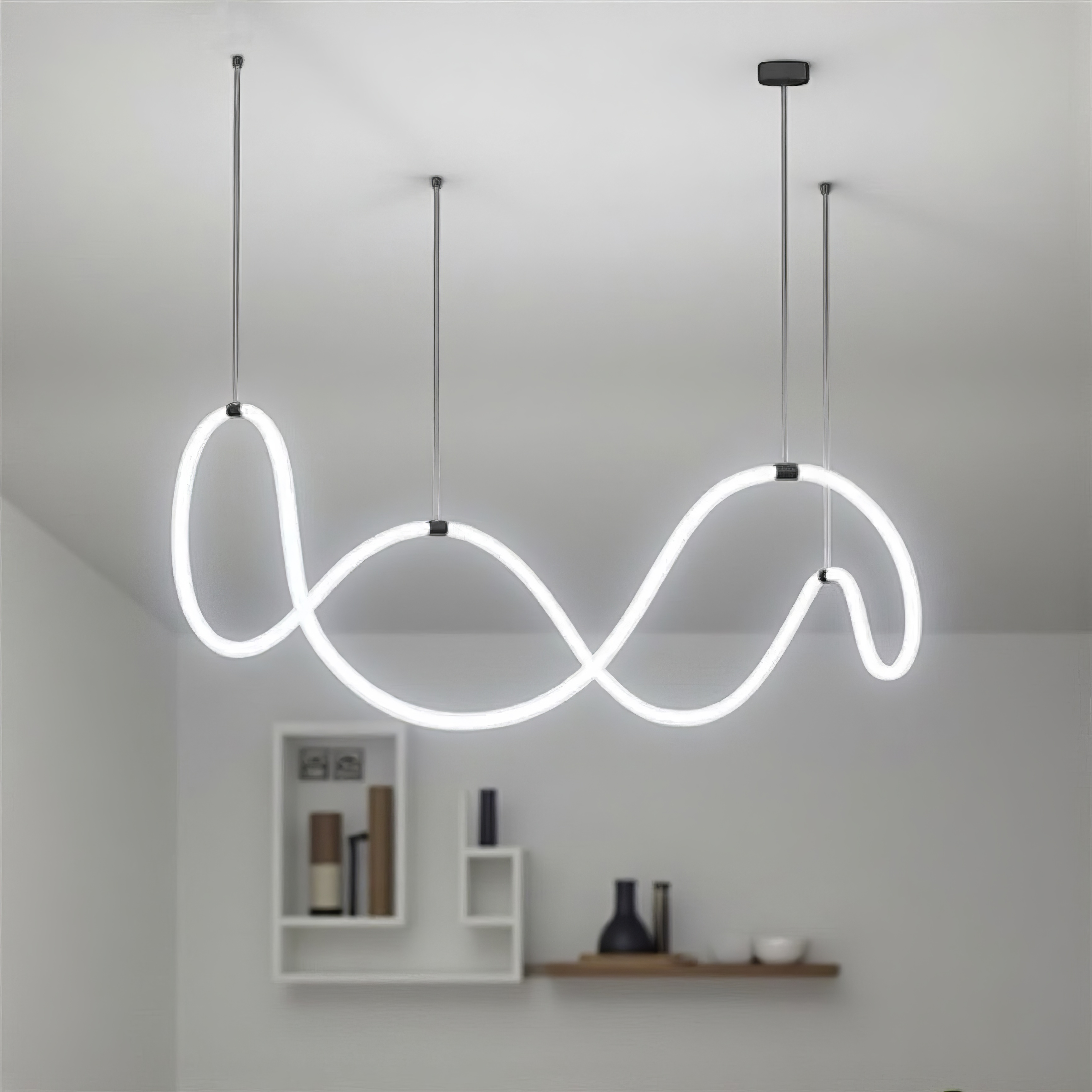 Оригінальна люстра Nordik S неон виготовлена з металевого трубчастого каркасу, до якого прикріплений круглий LED неон 22mm, білого матового кольору, всередині якого проходить світлодіодна стрічка. В результаті заломлення світла у включеному стані виходить яскрава неонова дуга, що рівномірно світиться.