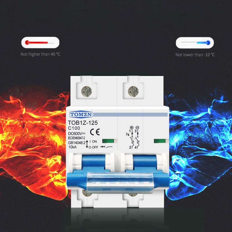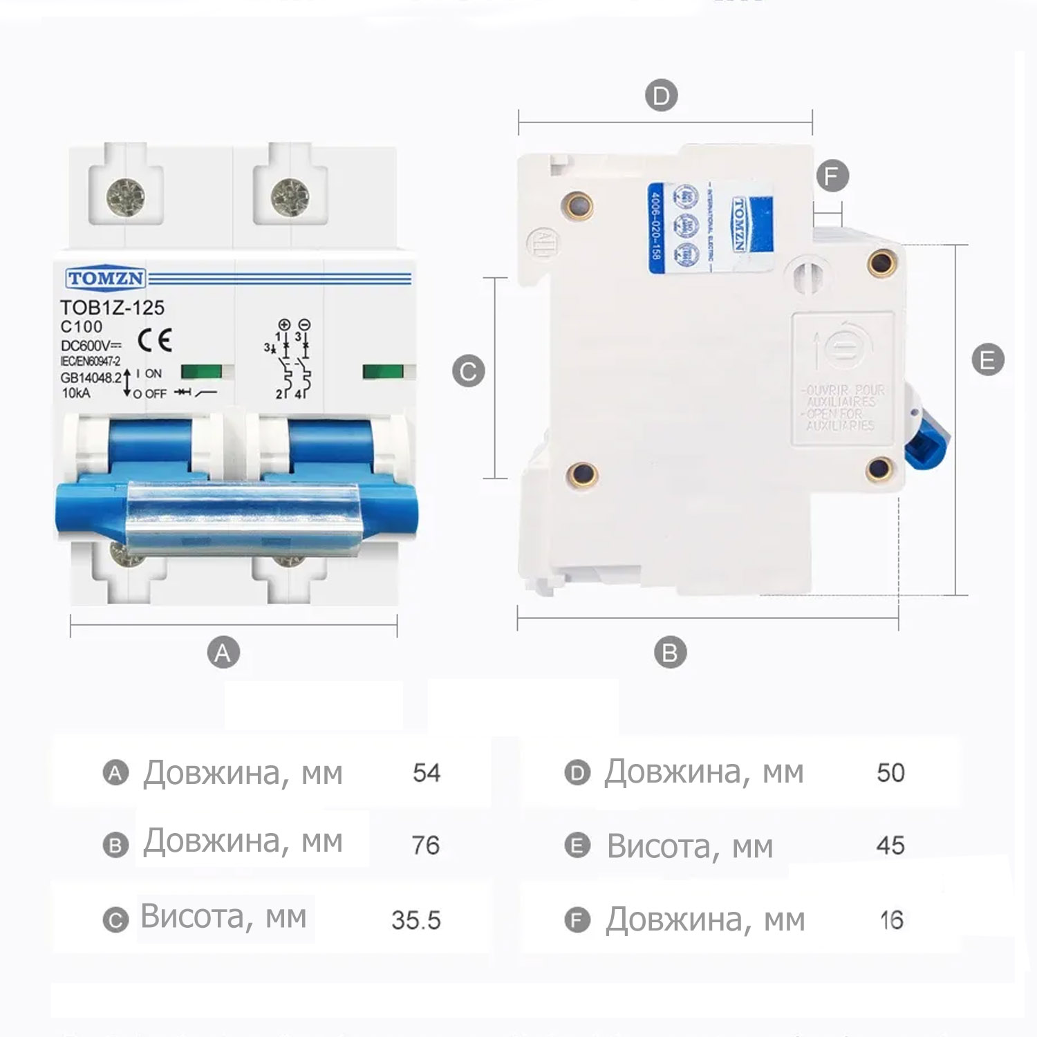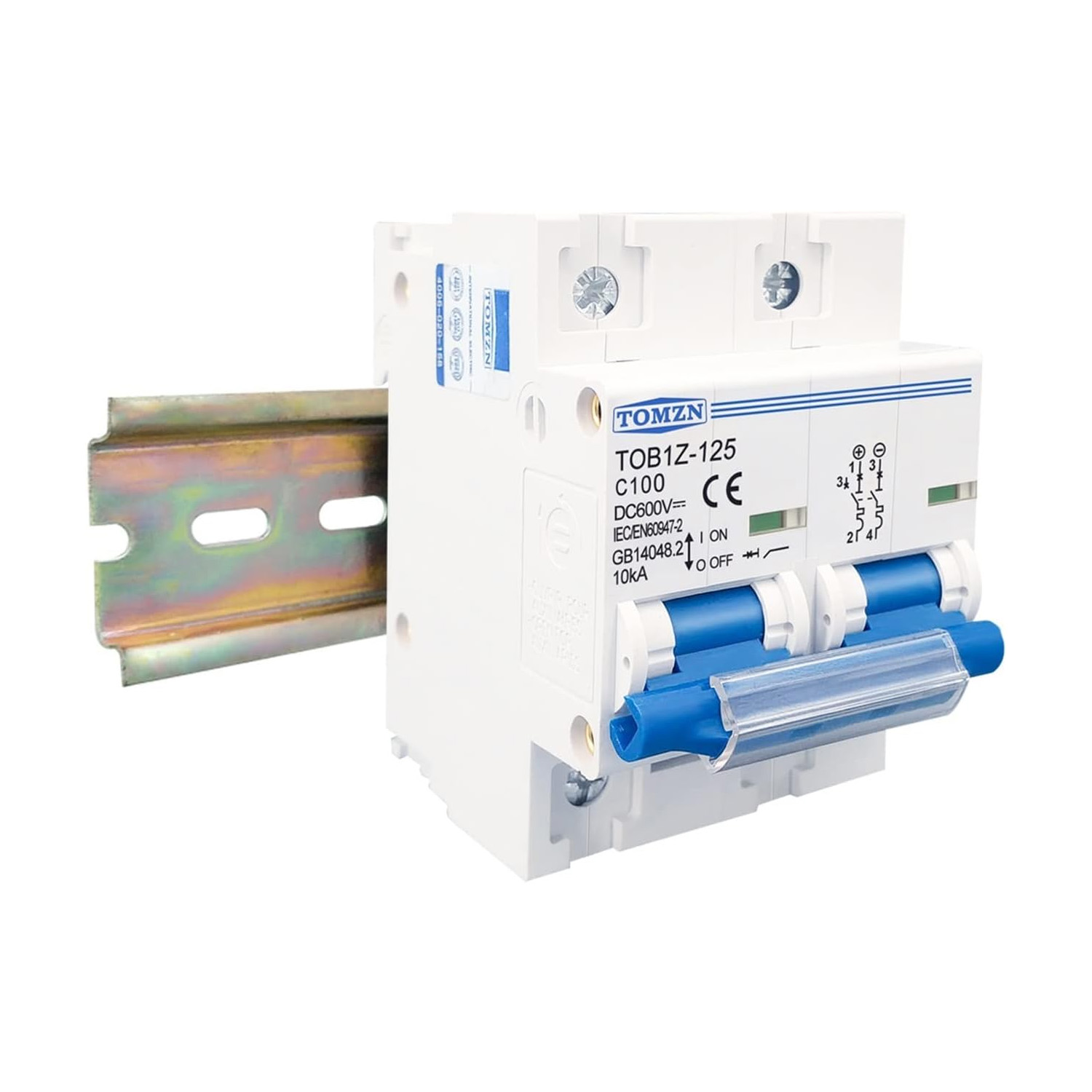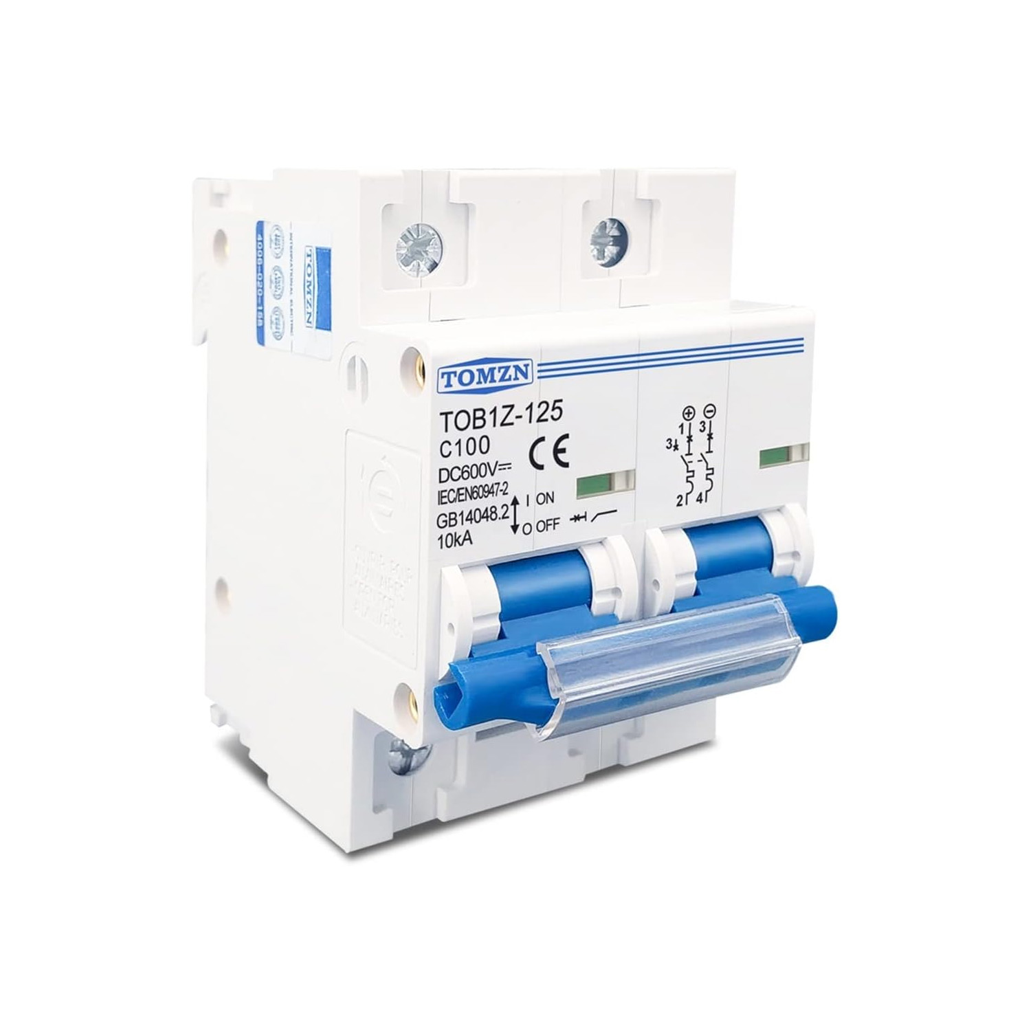 Автоматичний двополюсний вимикач TOMZN 2P 100A постійного струму для акумулятора TOB1Z-125 DC 600V 10kA TOMZN