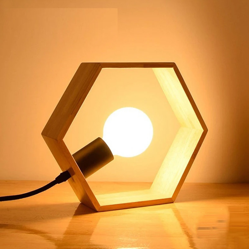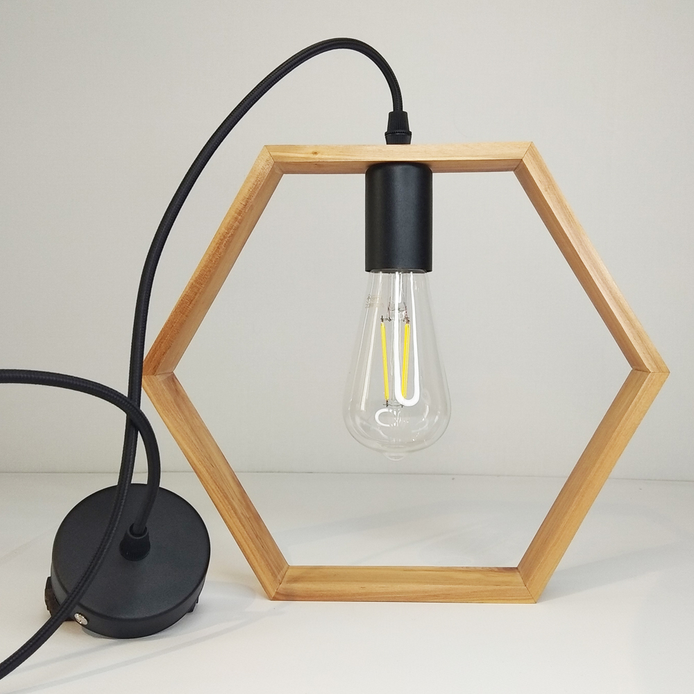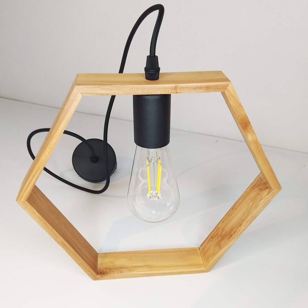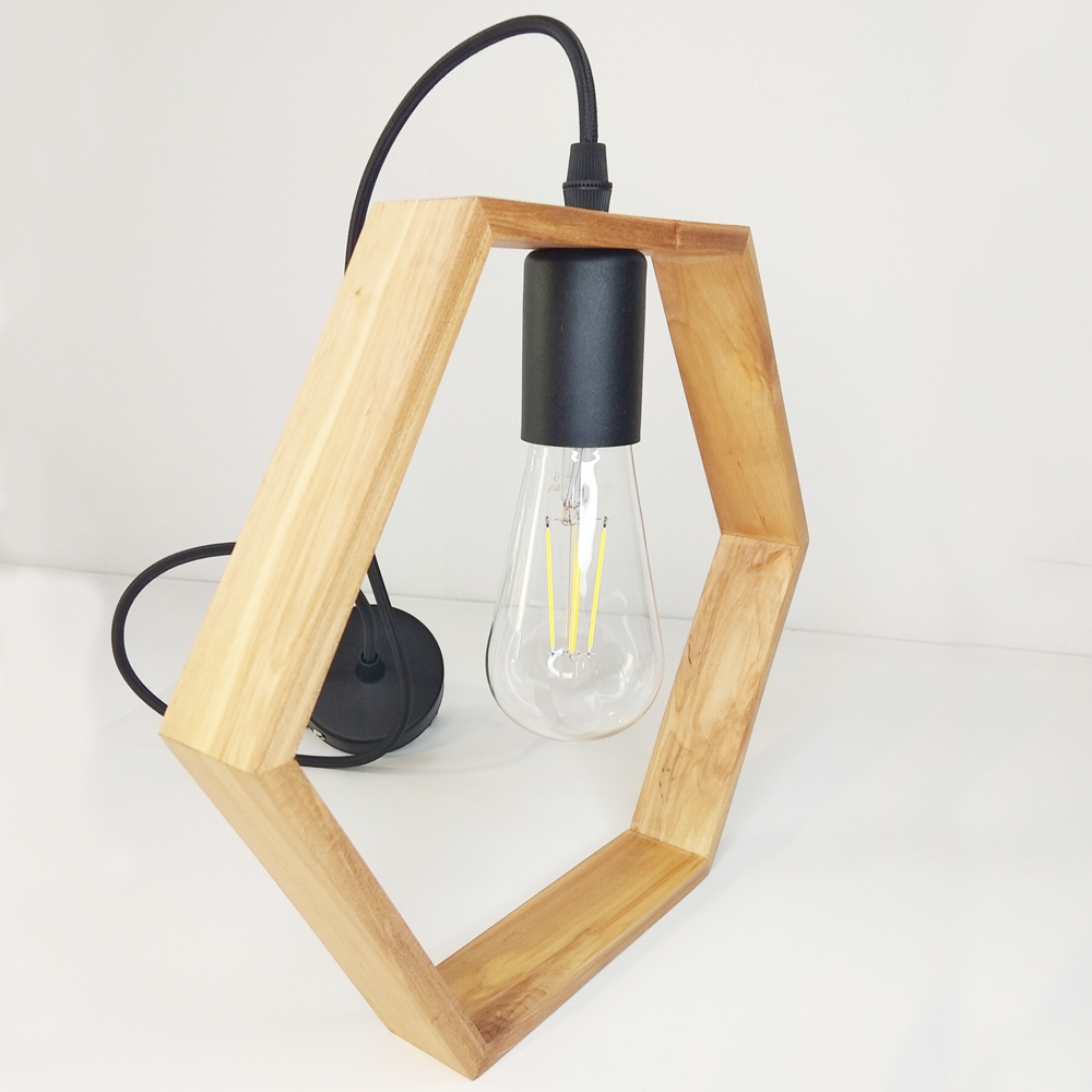 Світильник виготовлений у скандинавському стилі з дерев'яною рамкою з ясена у вигляді шестикутника, яка використовується замість традиційного плафона. Дерев'яні частини світильника оброблені на професійних верстатах та покриті якісним лаком. Комплектуючі з металу можуть використовуватись у чорному або білому кольорі за бажанням замовника.