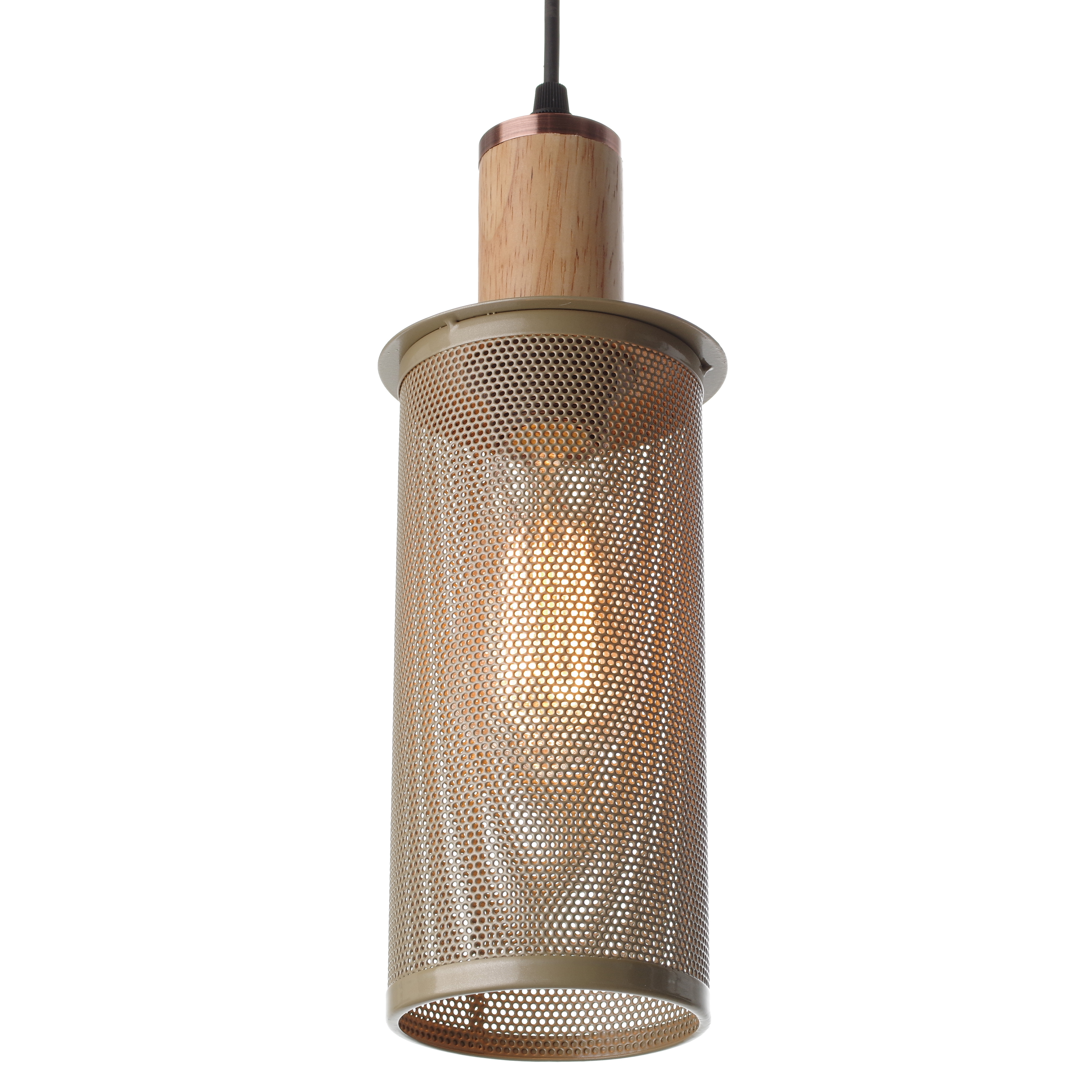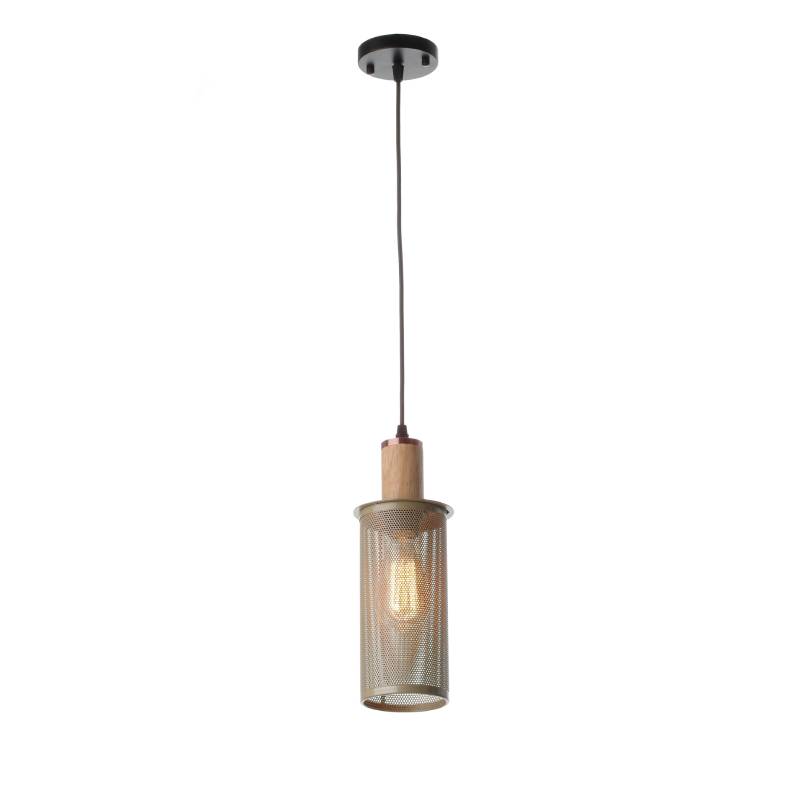 Світильник підвісний Leon з дерев'яним патроном зі вставкою із червоної бронзи й сітчастим абажуром з металу шамуа