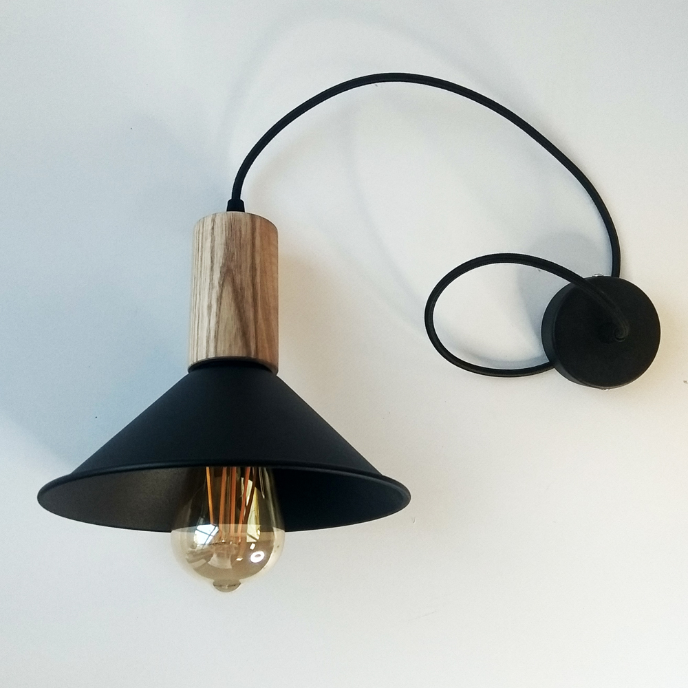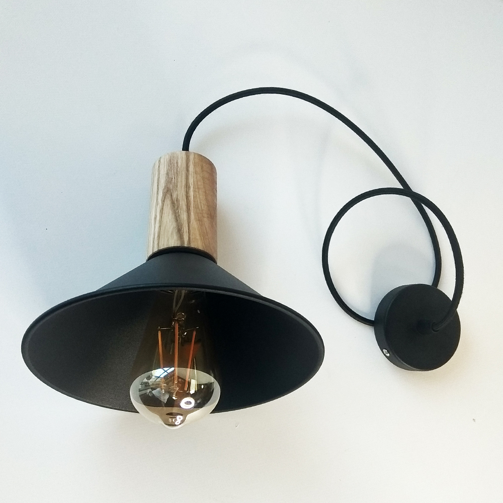 – це ефектне поєднання металу та дерева.Чорний дріт ПВХ метрової довжини, який входить у комплектацію, за бажанням замовника може бути замінений на провід будь-якого іншого кольору, виду та довжини. Абажури з металу використовуються в 35 варіаціях, але можна встановити будь-який з асортименту нашого магазину. Ціну із змінами комплектації уточнюйте у менеджера.
