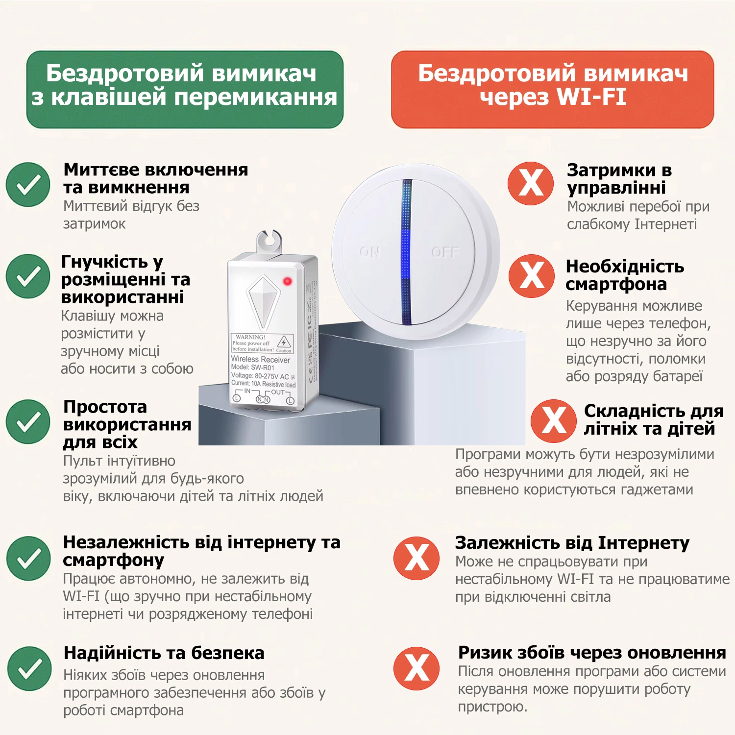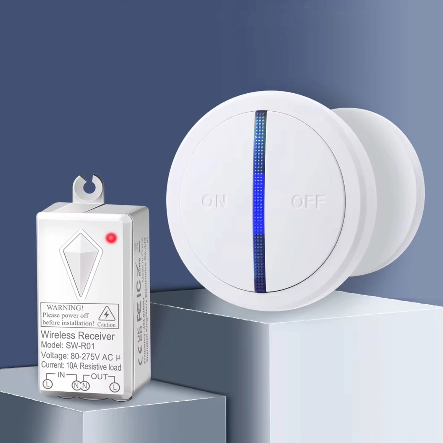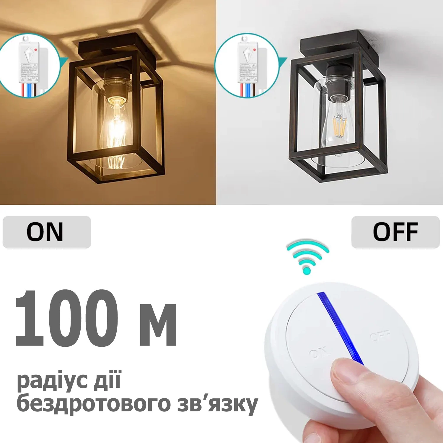 - Швидко та без штроблення встановити вимикач у будь-якому місці. Без проводів, ремонту та пилу – приймальний блок встановлюється у світильник, розетку або за стелею, а перемикач кріпиться у зручному місці: на стіні, меблях або носиться з собою.