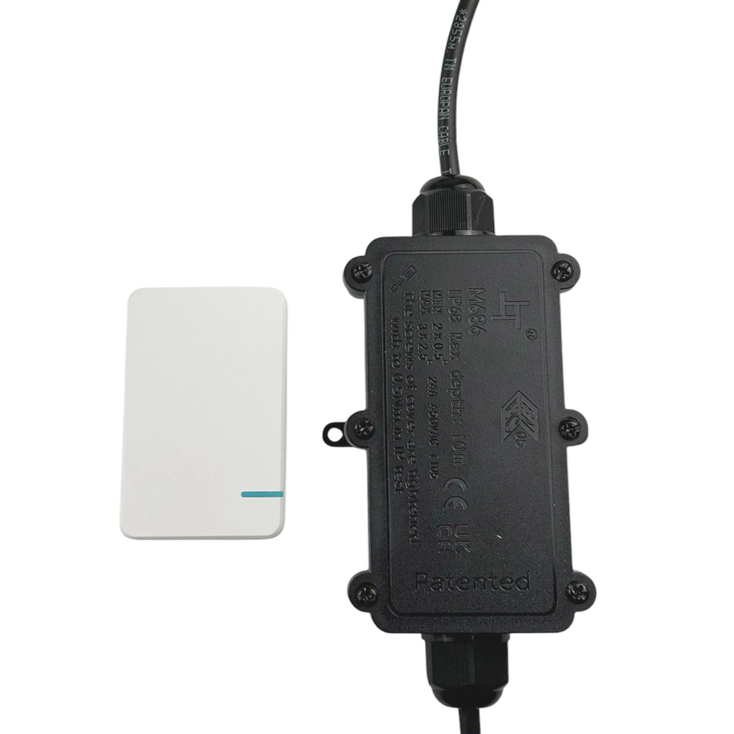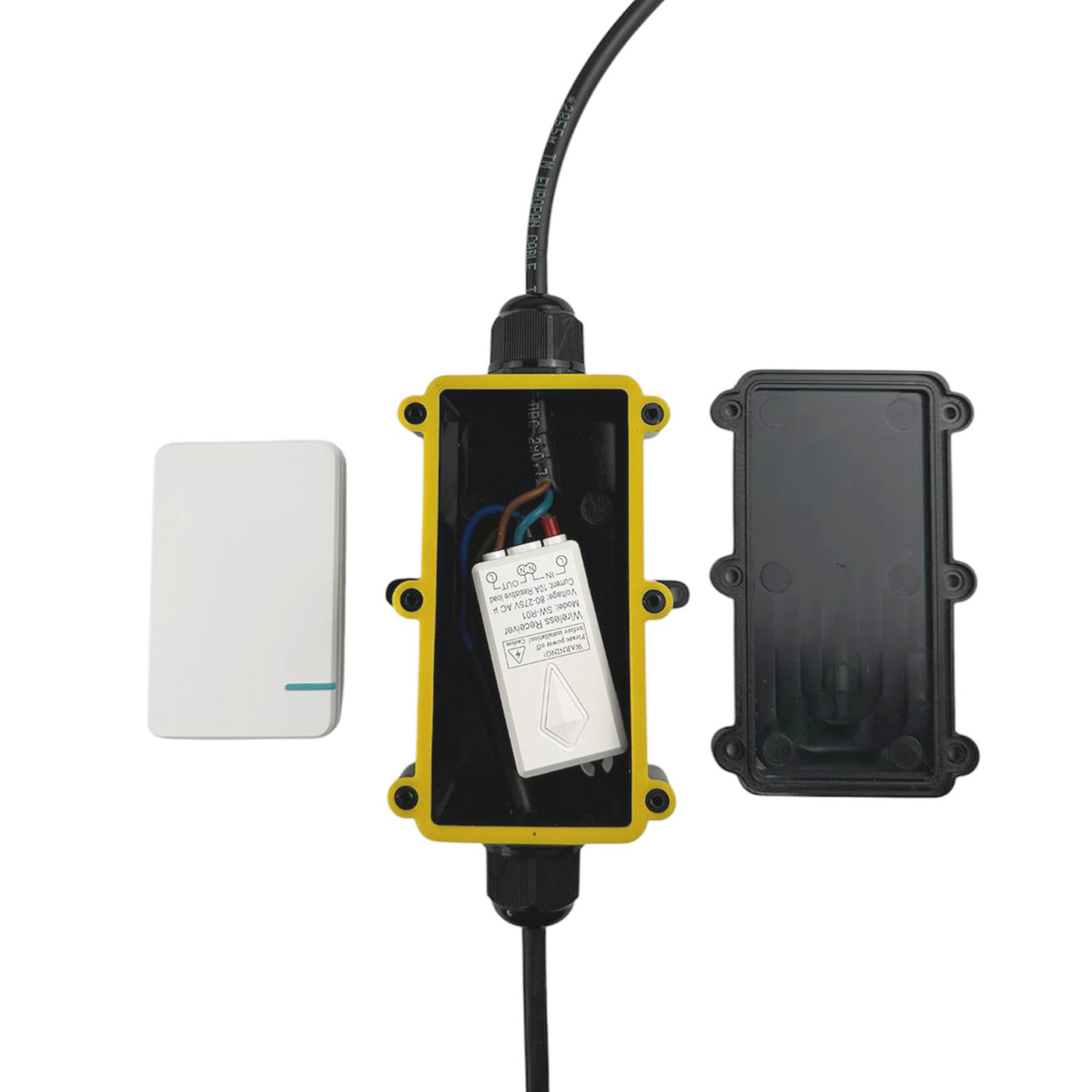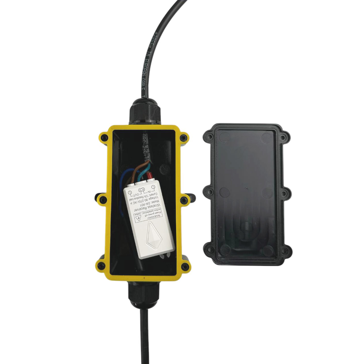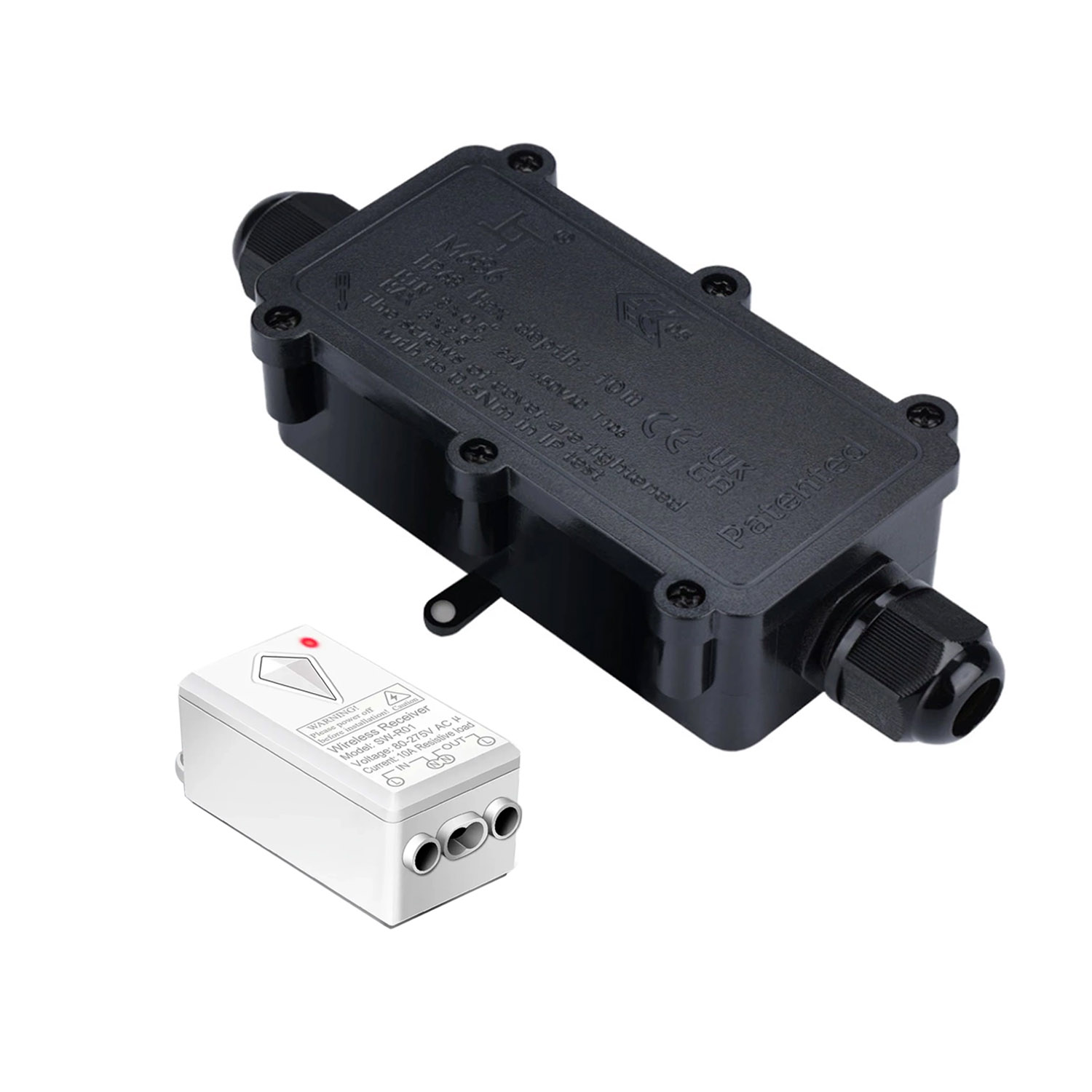 Приймальний блок з герметичною розподільною коробкою для бездротового вимикача. Використовується для вуличних гірлянд з метою управління роботою гірлянди за допомогою бездротового вимикача.