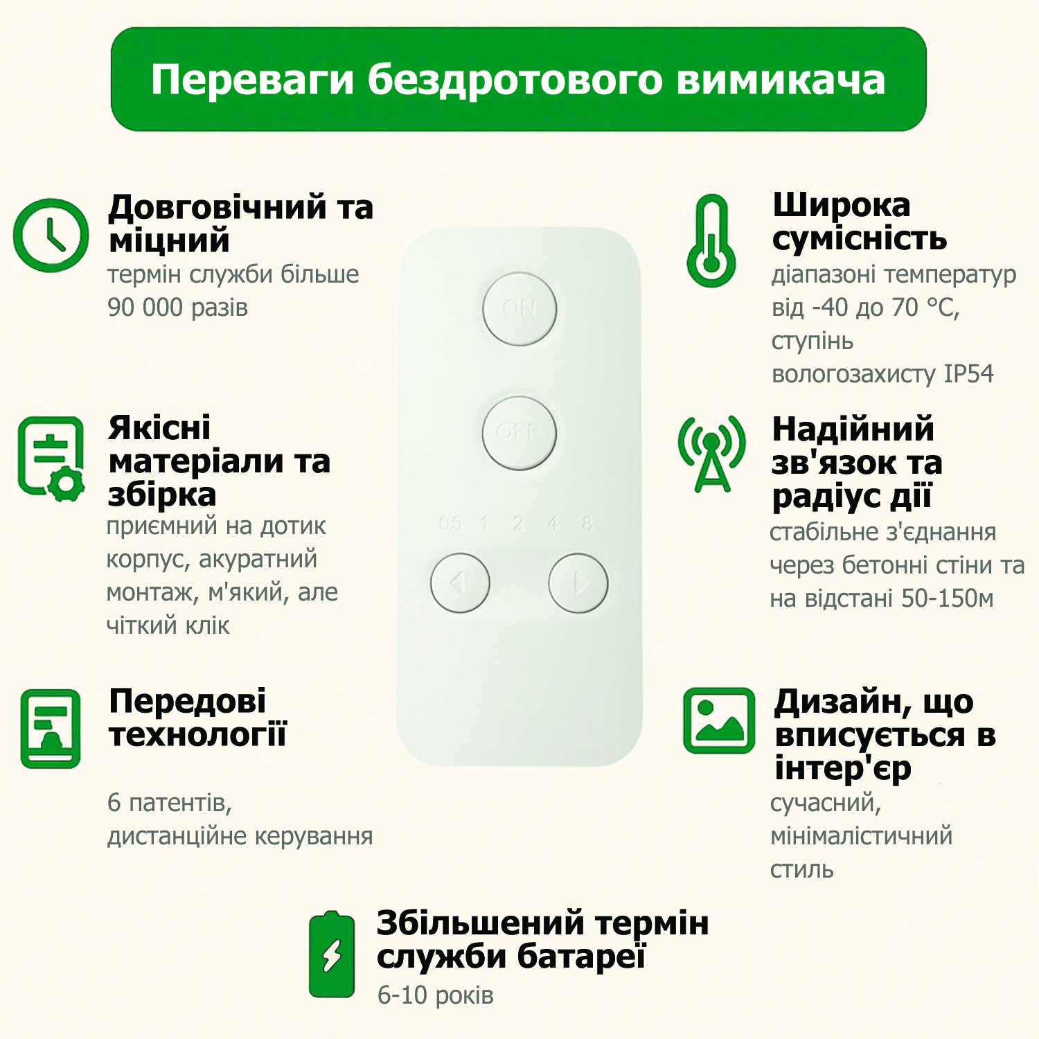 - Збільшений термін служби батареї: завдяки терміну служби батареї 6-10 років (при використанні однієї батареї CR2032) цей перемикач зводить до мінімуму витрати на обслуговування та заміну.