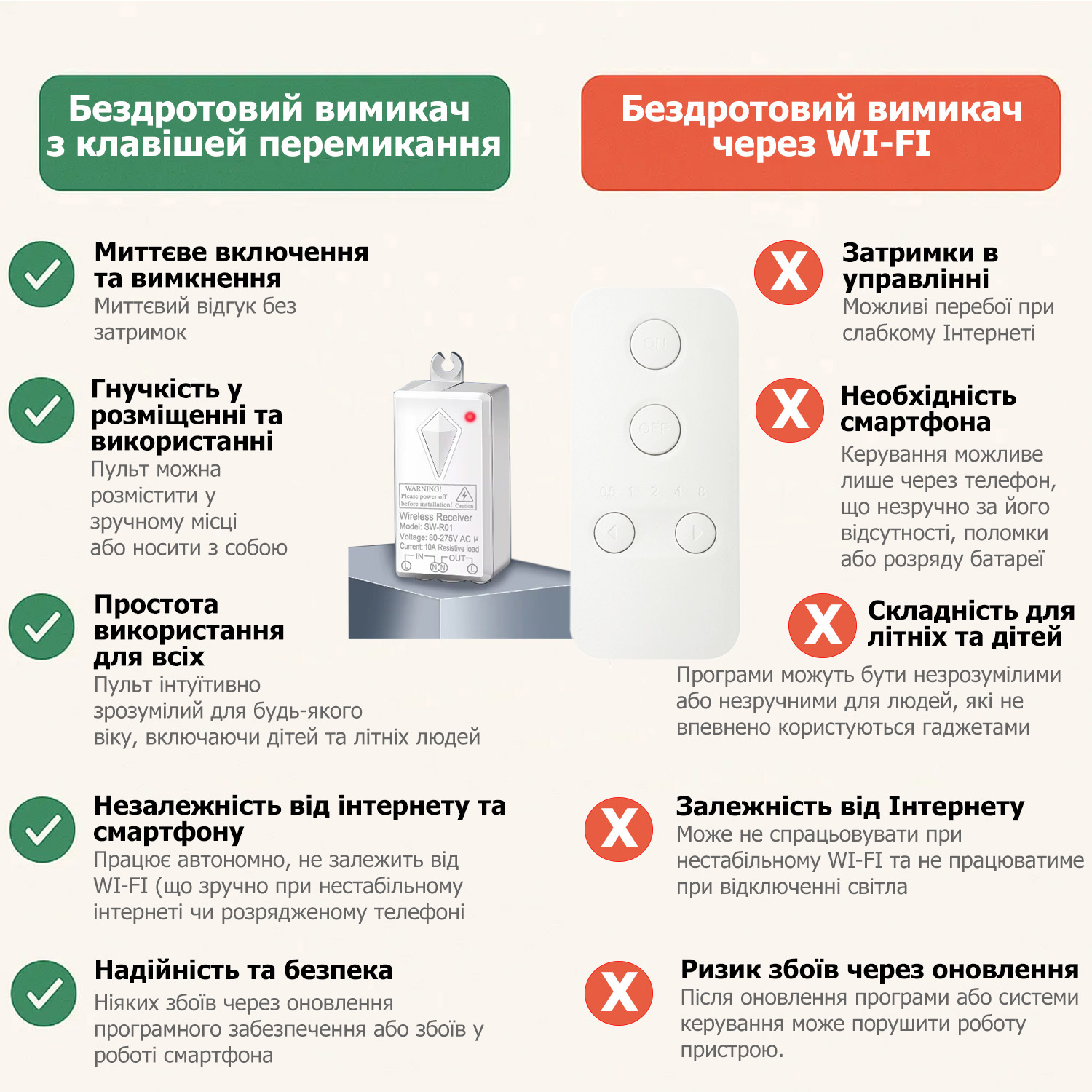 Без проводів, ремонту та пилу – приймальний блок встановлюється у світильник, розетку або за стелею, а перемикач кріпиться у зручному місці: на стіні, меблях або носиться з собою. - Додати додаткову точку керування світлом.