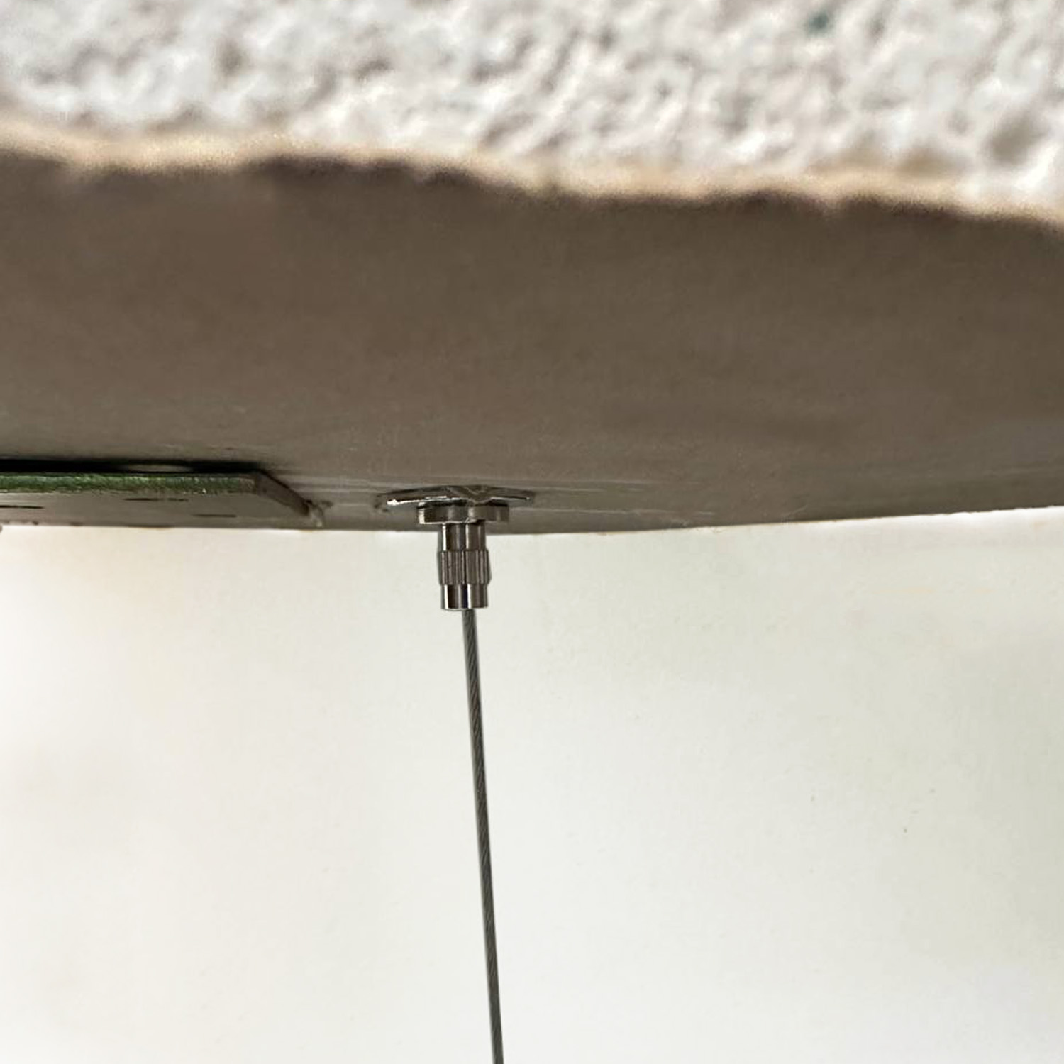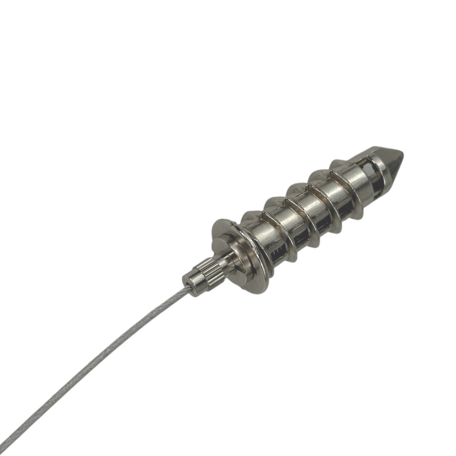 Спеціально розроблений для стель із гіпсокартону та акустичних стель, складається з трьох частин. З одного боку, шуруп, що вкручується в гіпсокартон. Трос можна вставити в тримач/затискач троса і прикрутити до шурупа для гіпсокартону. У верхній частині затягується запобіжний гвинт, щоб гарантувати, що нічого не ослабне. Такий шуруп для гіпсокартону із вбудованим фіксатором троса ідеально підходить для підвішування світильників, реклами чи прикрас.