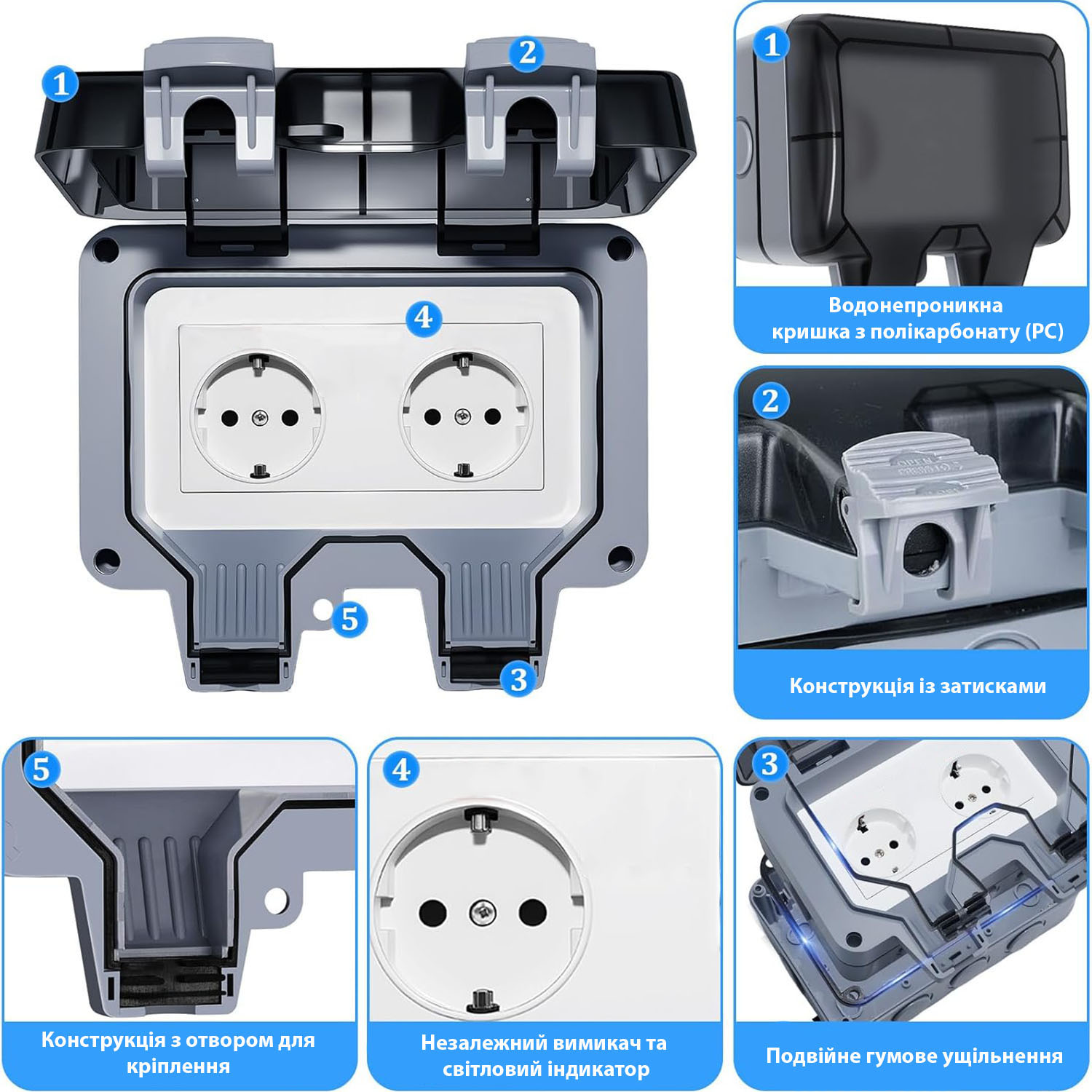 - Просте встановлення та експлуатація розетки, можливість напівприхованого або накладного монтажу.