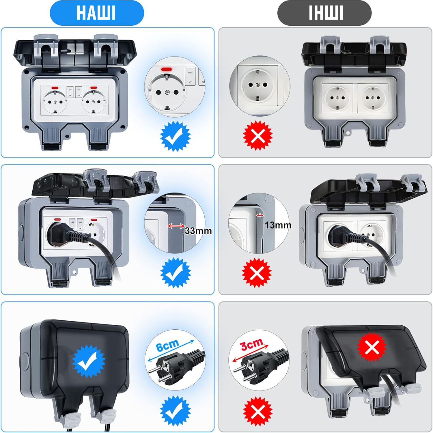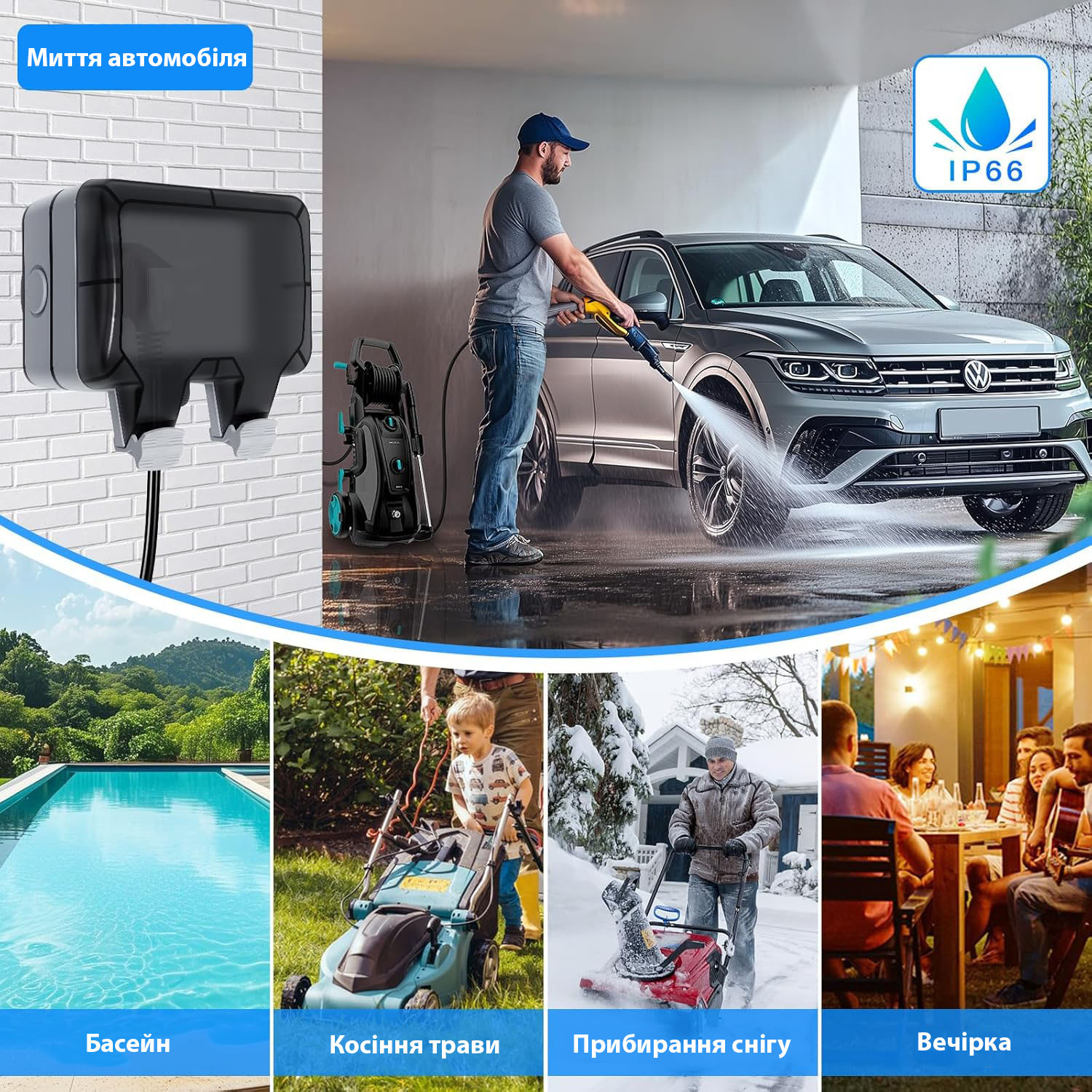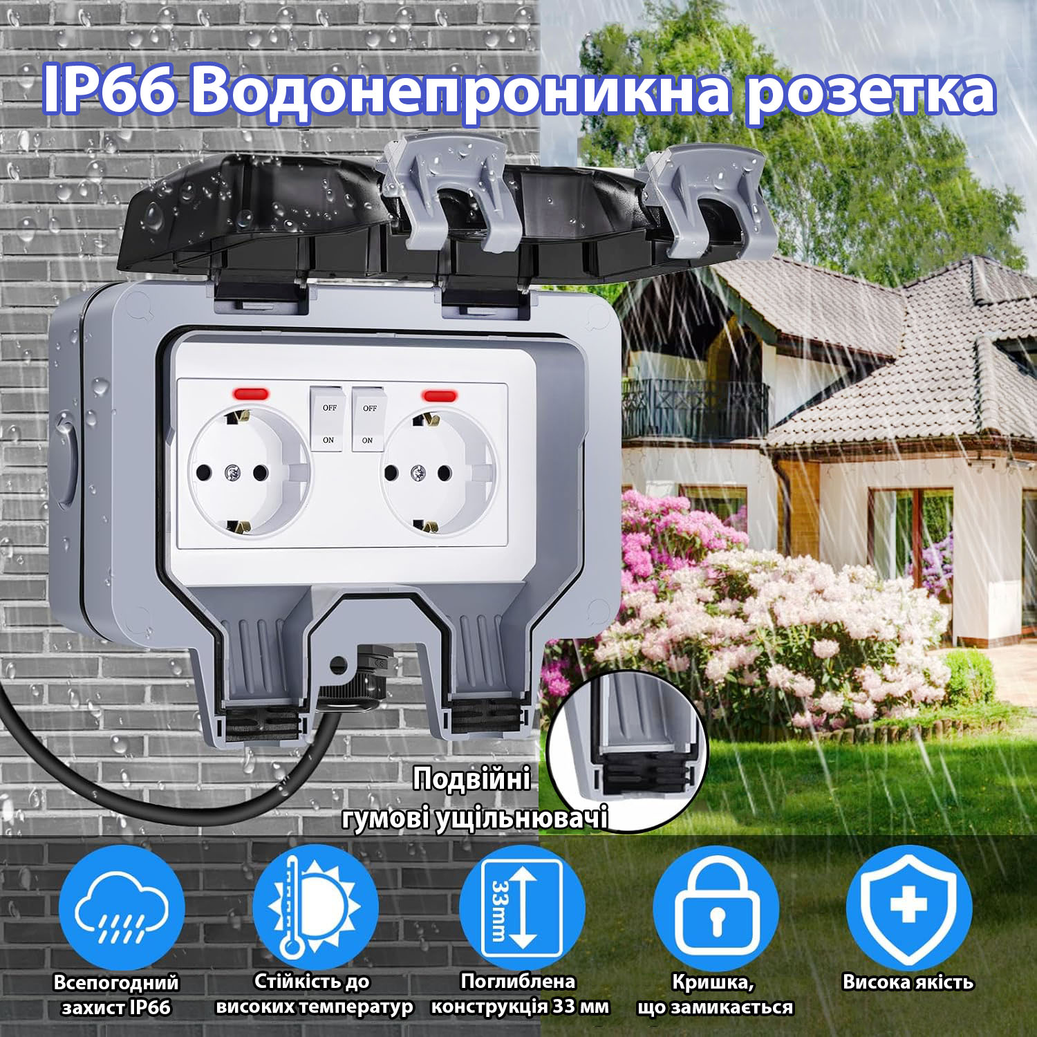 - Зручність та безпека. Забезпечує захист електропристроїв від негоди. Безпека використання навіть під час дощу (електровилка під напругою герметично закривається кришкою). Стійкість до високих та низьких температур.