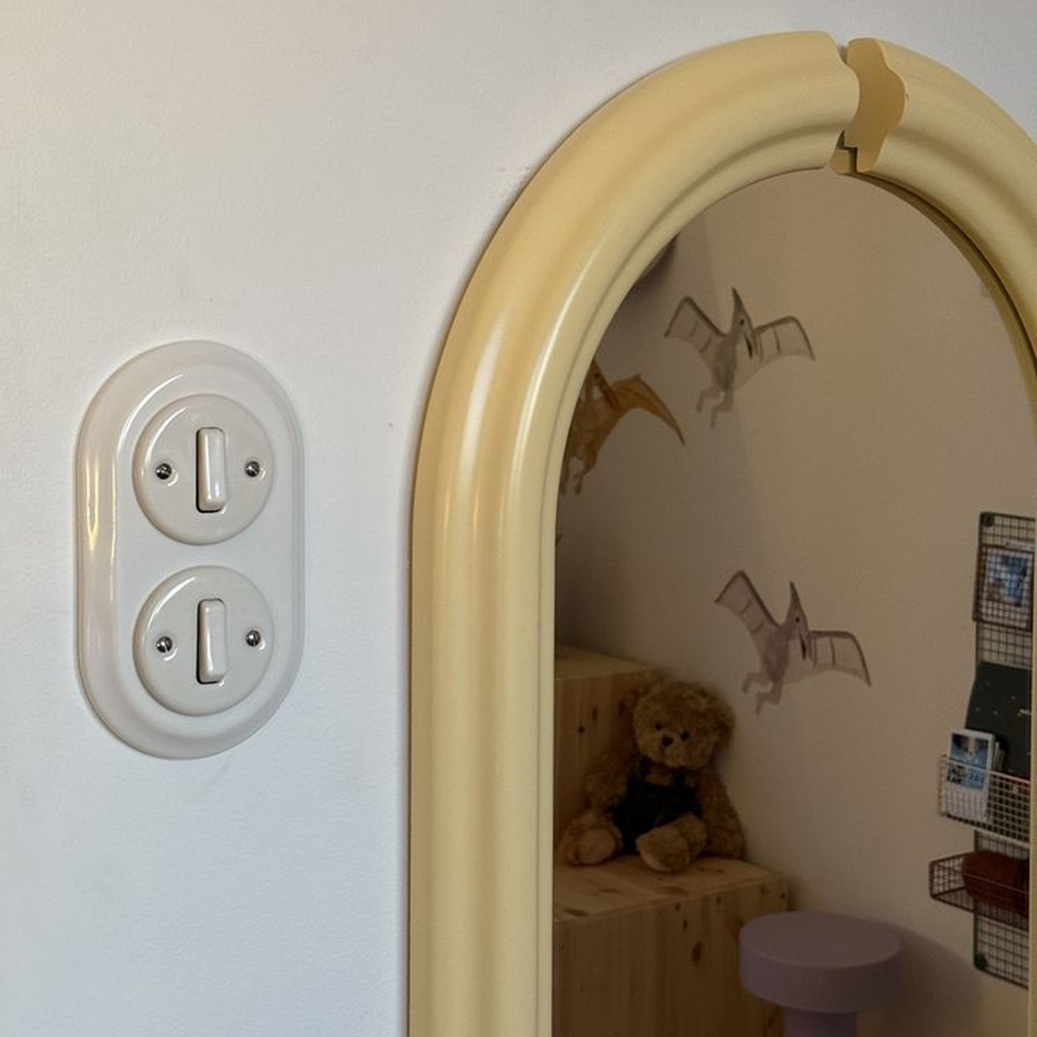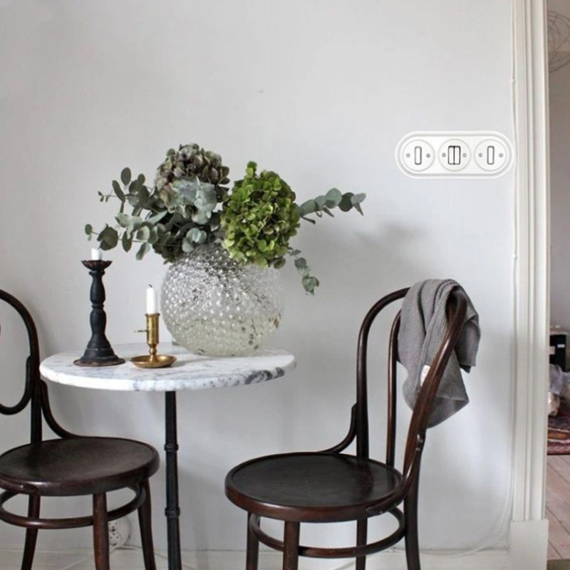 Рекомендація: для завершеного вигляду інтер’єру вимикач можна поєднувати з ретро проводкою, керамічними розетками та декоративними рамками в одному стилі.