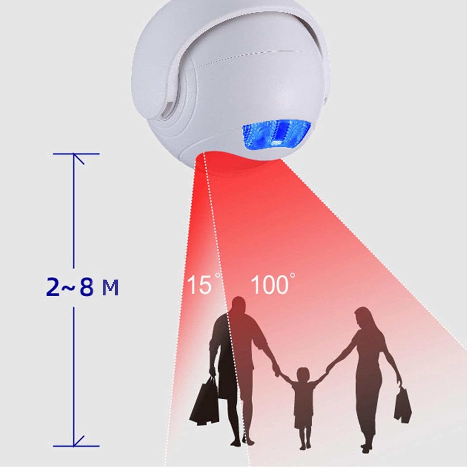4. Индукционное освещение. 100 градусов по горизонтали, 15 градусов по вертикали, широкий угол обнаружения, большое расстояние (2-8 метров). Датчик срабатывает на температуру тела около 34°С. Не рекомендуется устанавливать в зоне действия кондиционера или вентилятора.