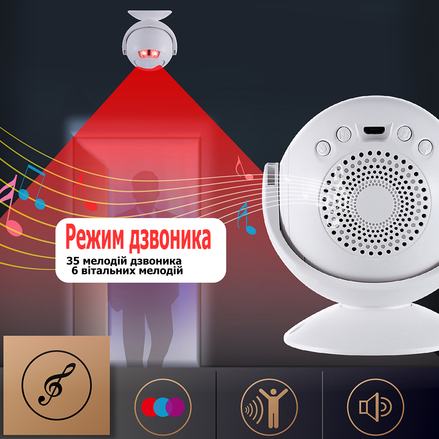 4 режима работы — добро пожаловать/дверной звонок/сигнализация/датчик движения