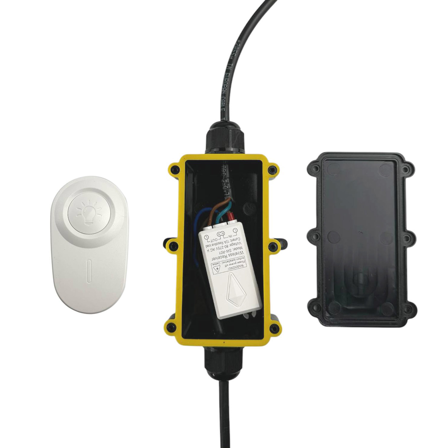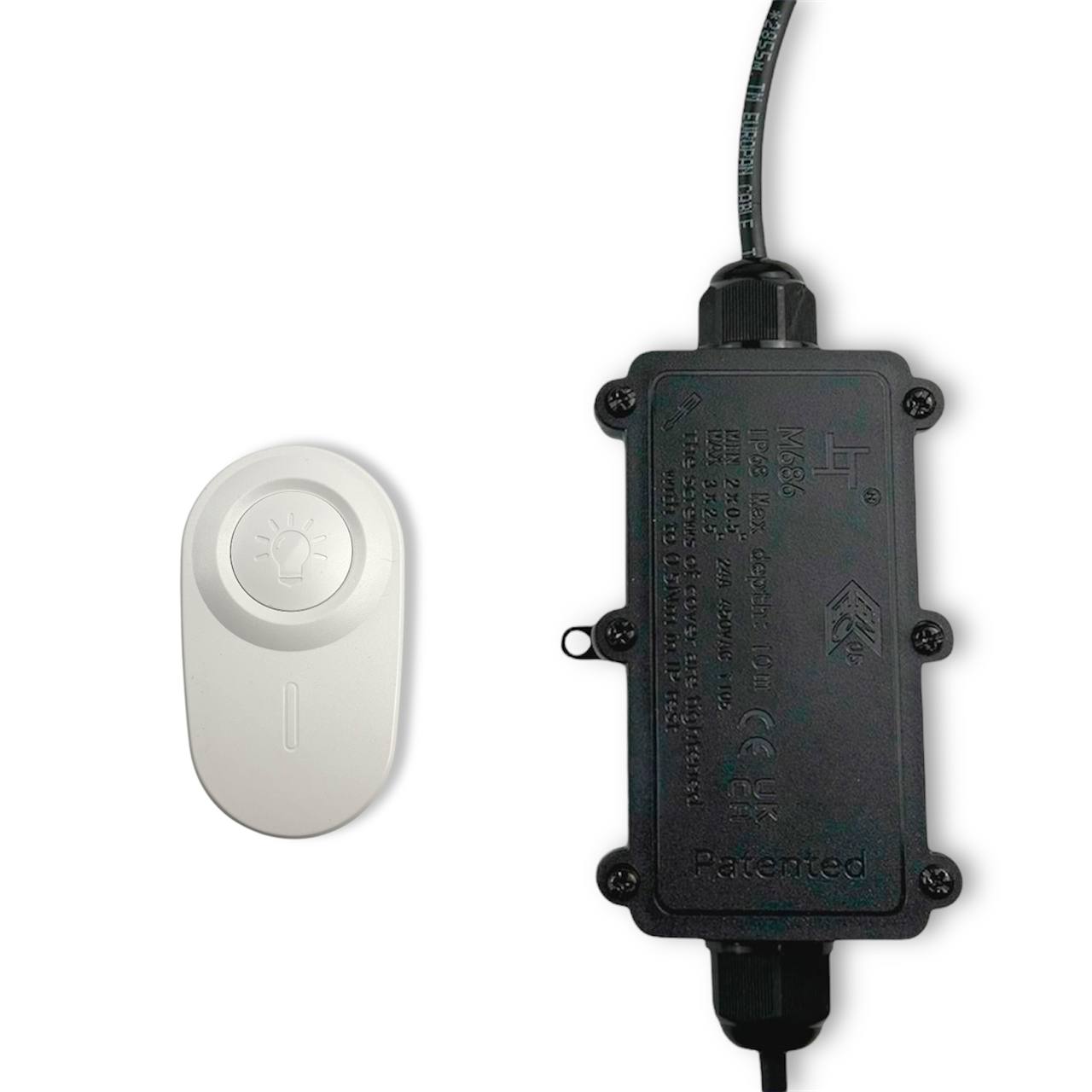 Беспроводной выключатель 1-канальный СK1 с приемным блоком в герметичном корпусе IP68. Используется для уличных гирлянд для управления работой гирлянды с помощью беспроводного выключателя.