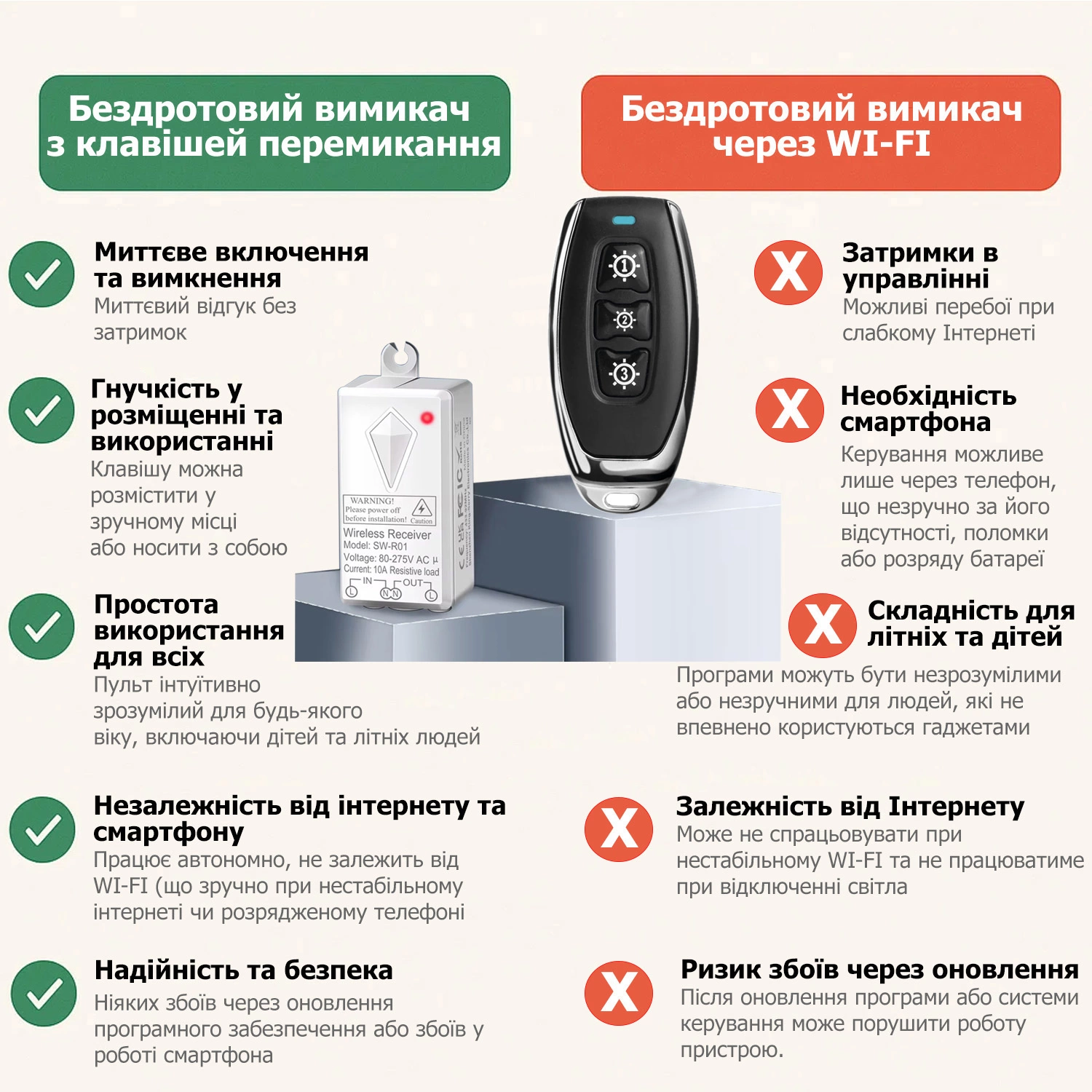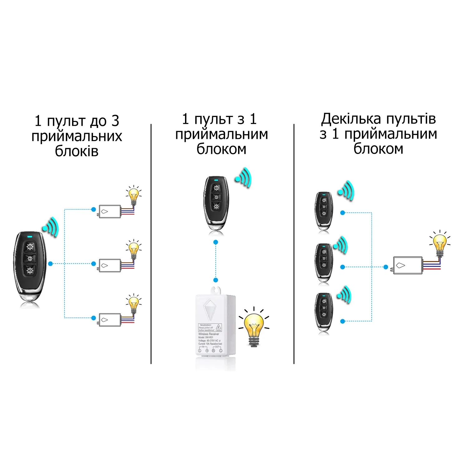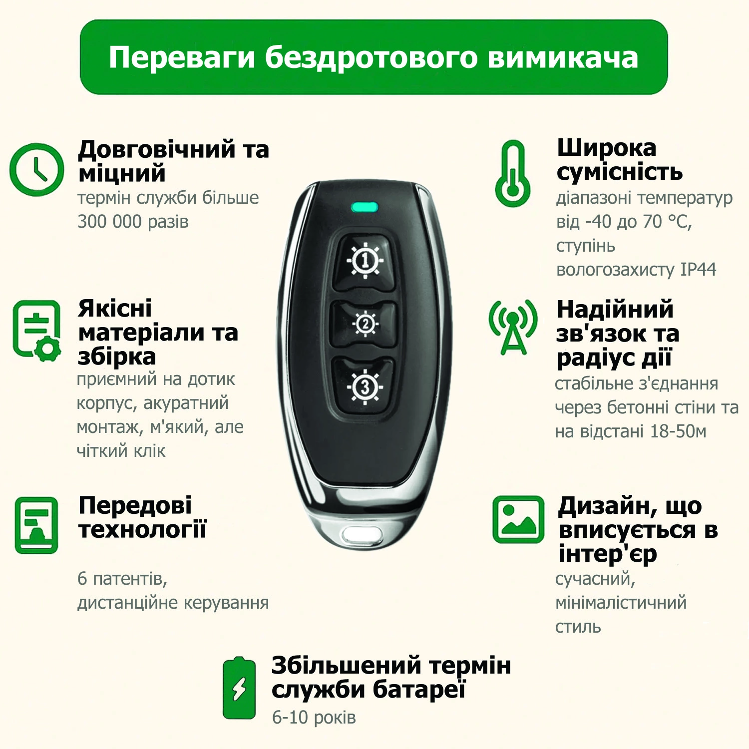 Готовый комплект беспроводного выключателя из пульта дистанционного управления и приемного блока – это удобство, свобода размещения при минимальных хлопотах. Отличное решение как для нового ремонта, так и для усовершенствования готового интерьера.