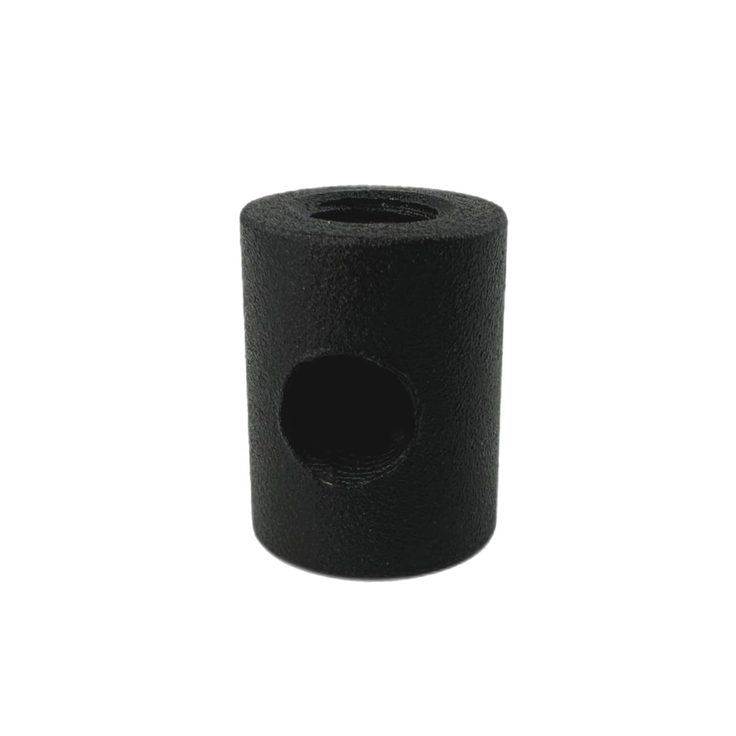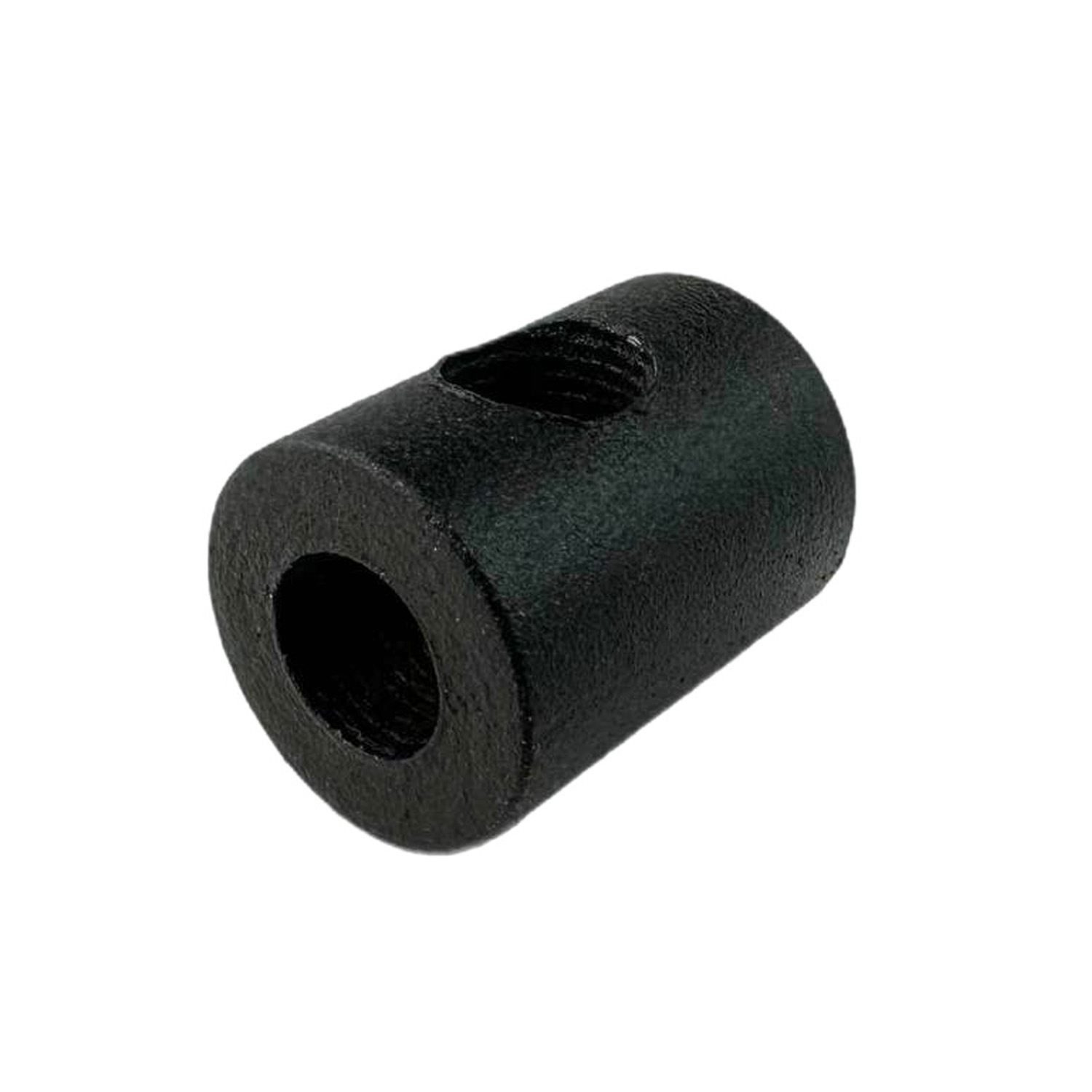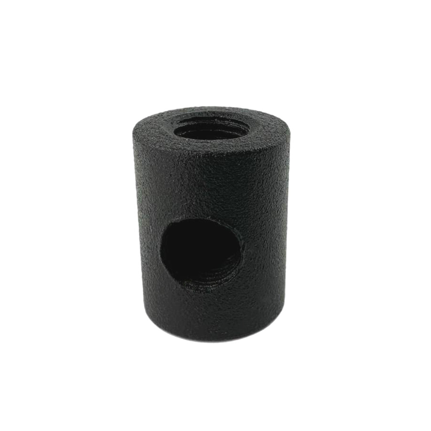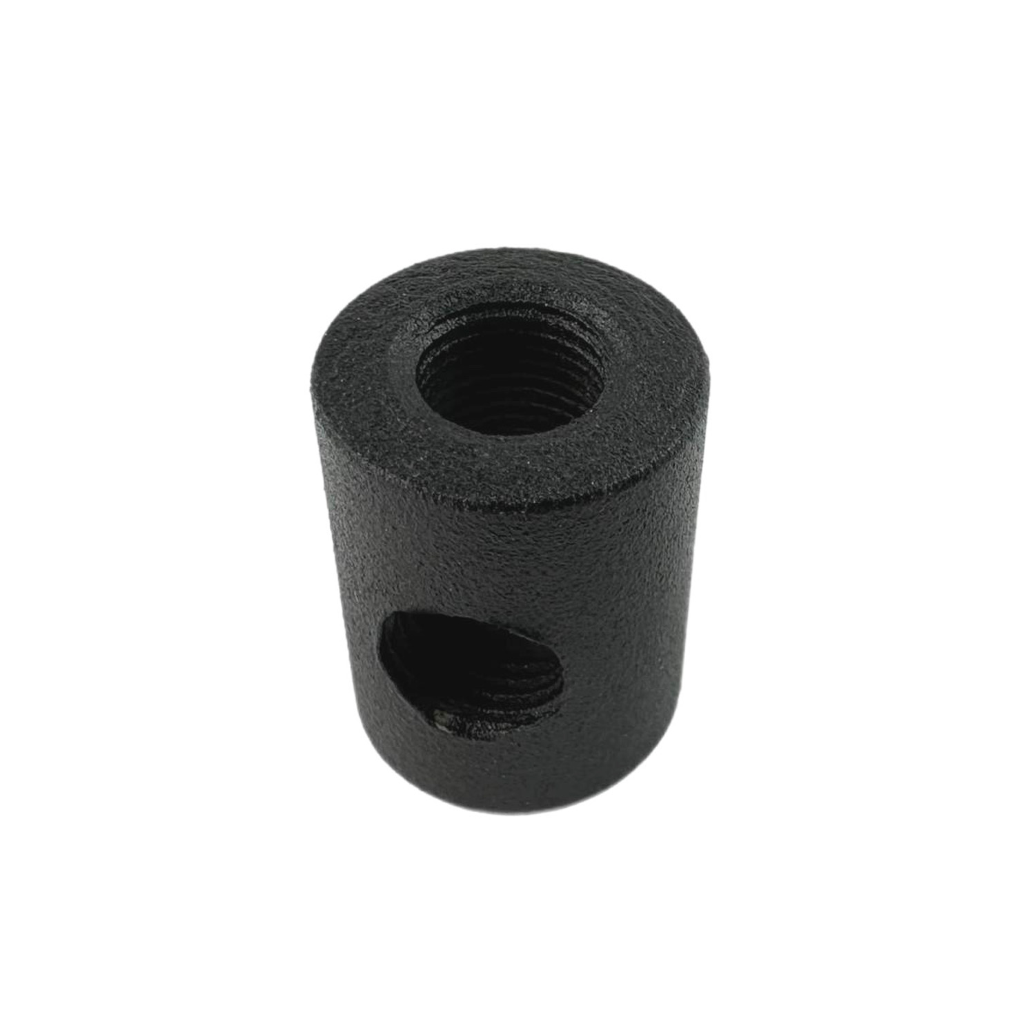 Металлический переходник-соединитель из толстого металла представляет собой стальной циллиндр со сквозным отверстием по высоте и бокорым отверстием на глубину радиуса основания. Отверстия имют резьбу M10x1.