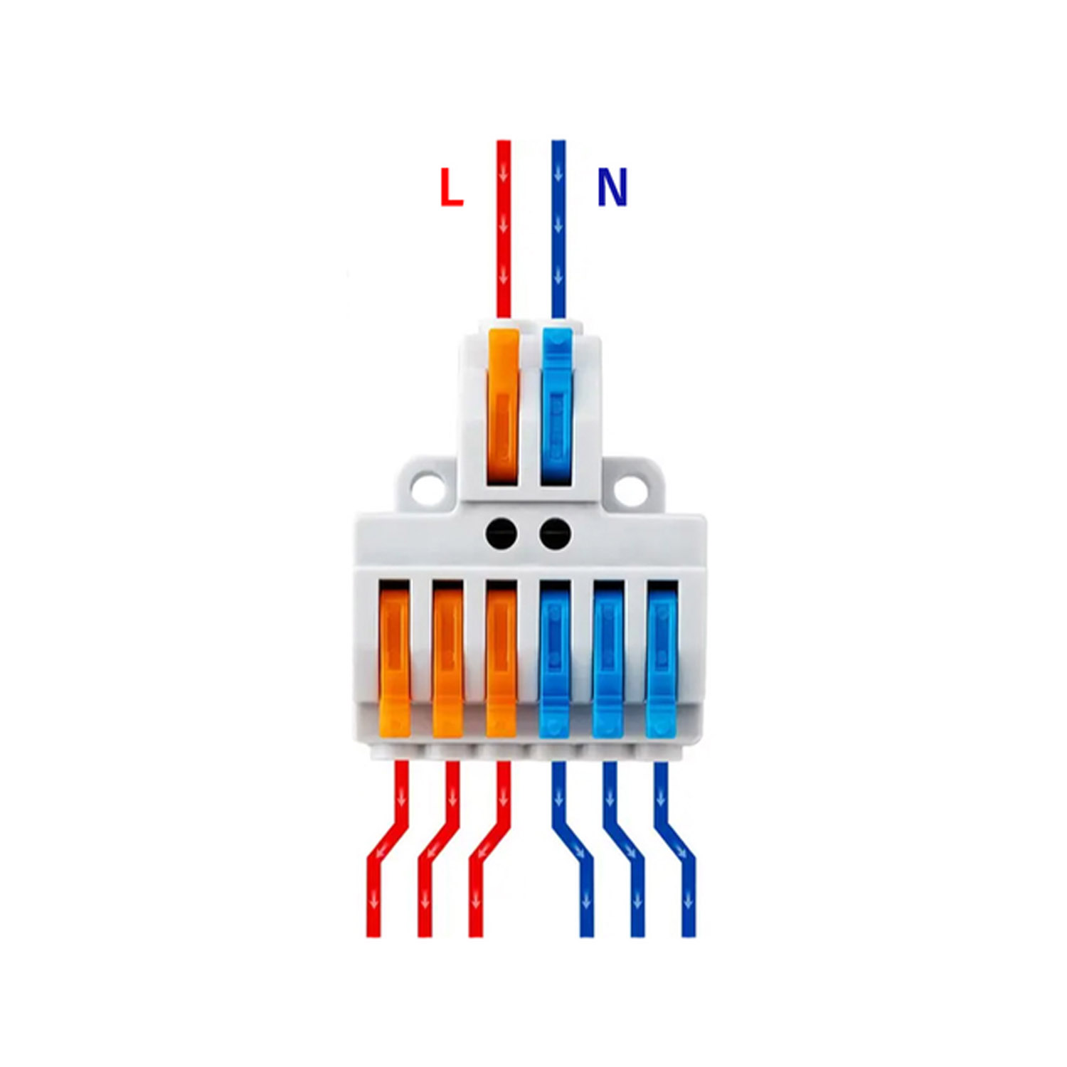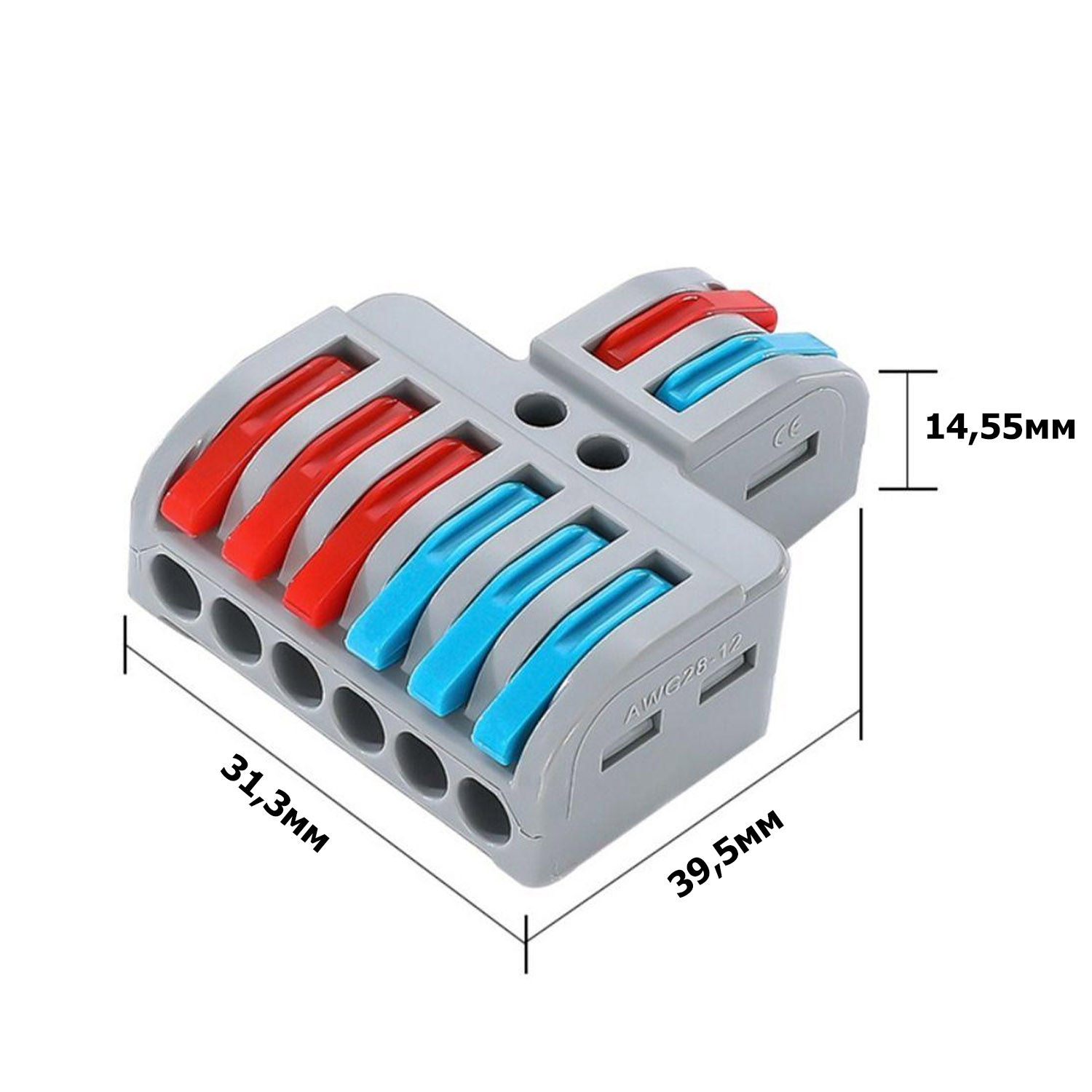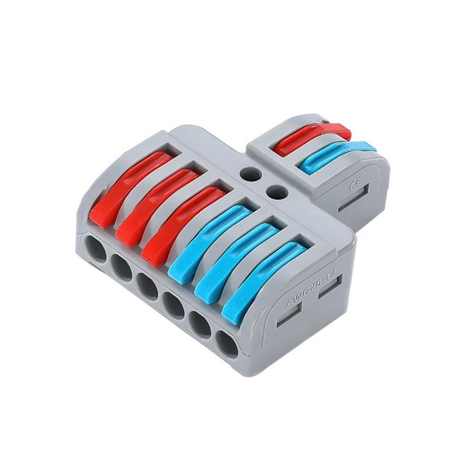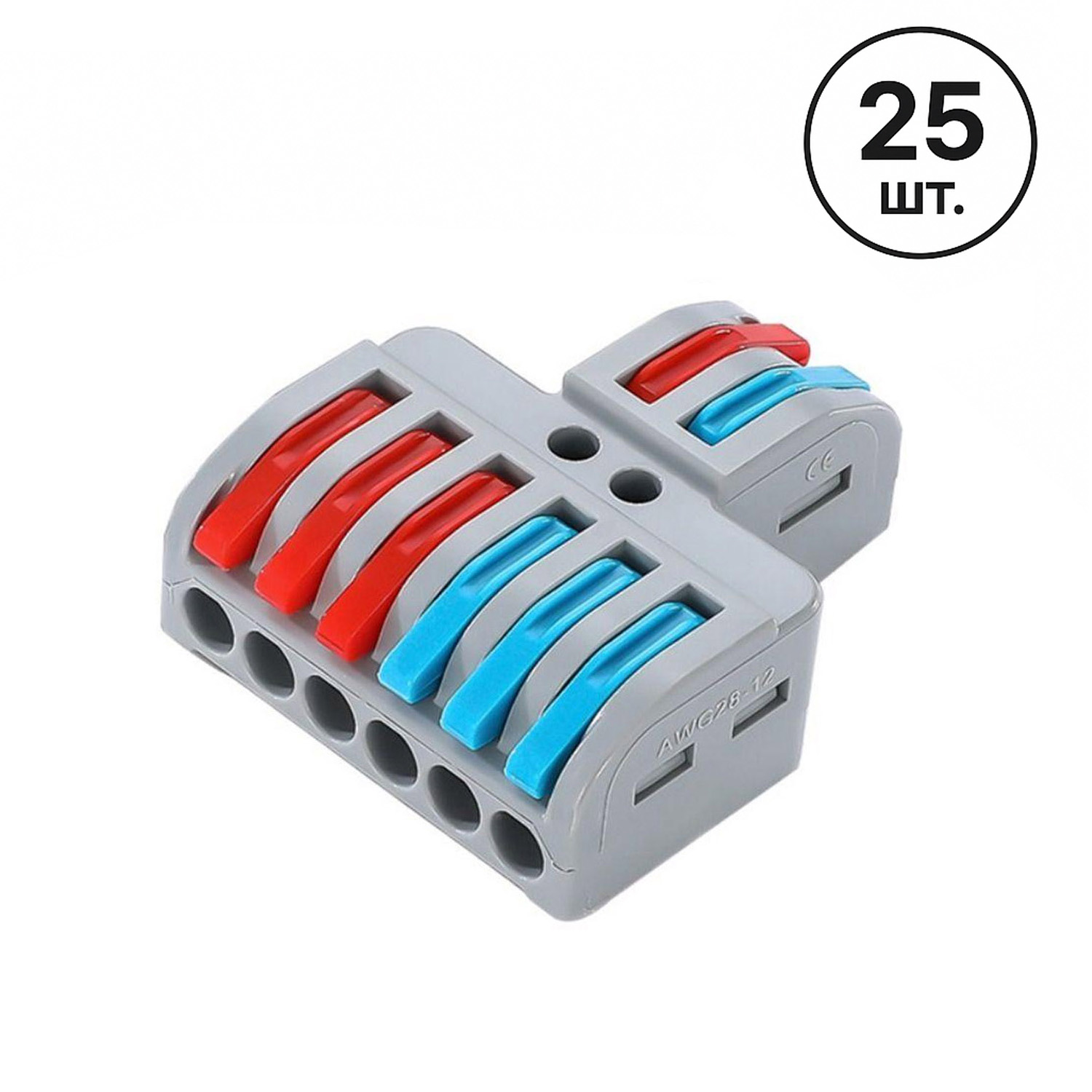 Набор 25 штук клемм разветвляющих типа WAGO 2 на 6 проводов, предназначенных для подключения одножильных и многожильных проводников диаметром от 0,08 мм2 до 4 мм2 (AWG28-12). Клемма разветвляющая с 2 на 6 проводов, с нажимными рычагами.