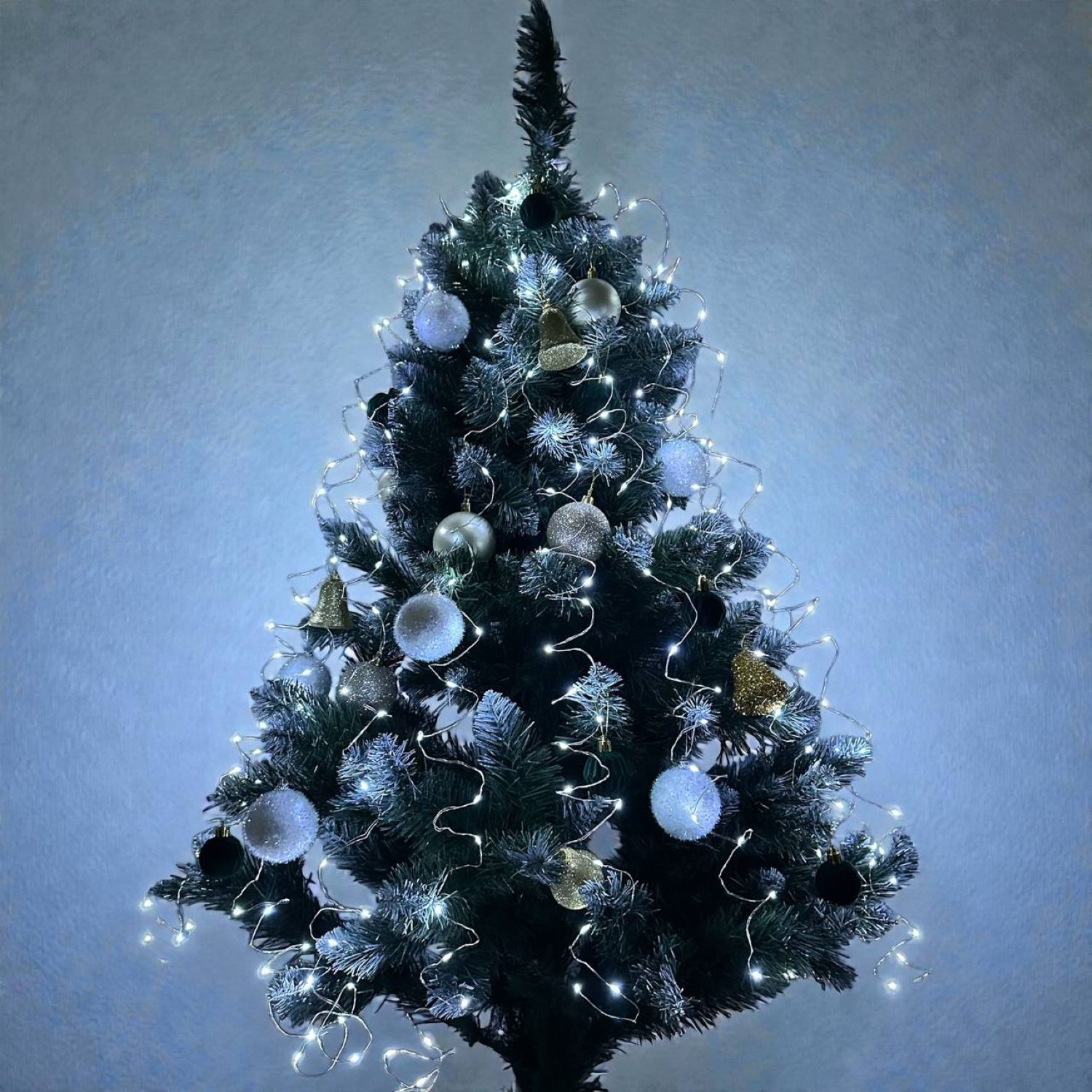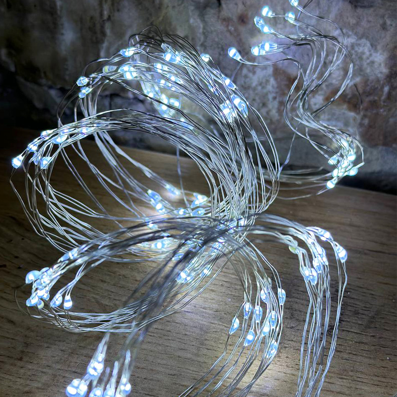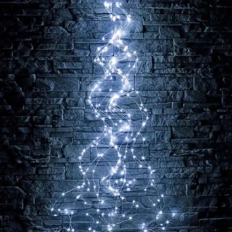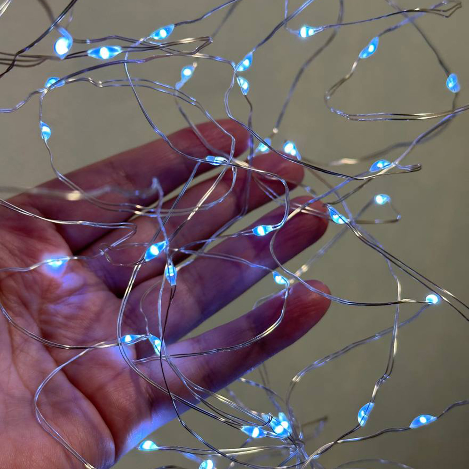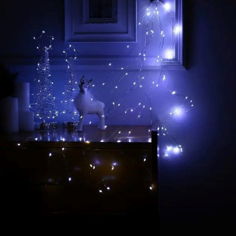 Гирлянда Конский хвост состоит из 10 тончайших нитей медной проволоки длиной 200 см. На каждой нити расположены мини светодиоды холодного белого цвета общим количеством 200 шт. по 20 штук на каждой нити. Гирлянда работает от USB или батареек 3хАА (в комплект не входят) .