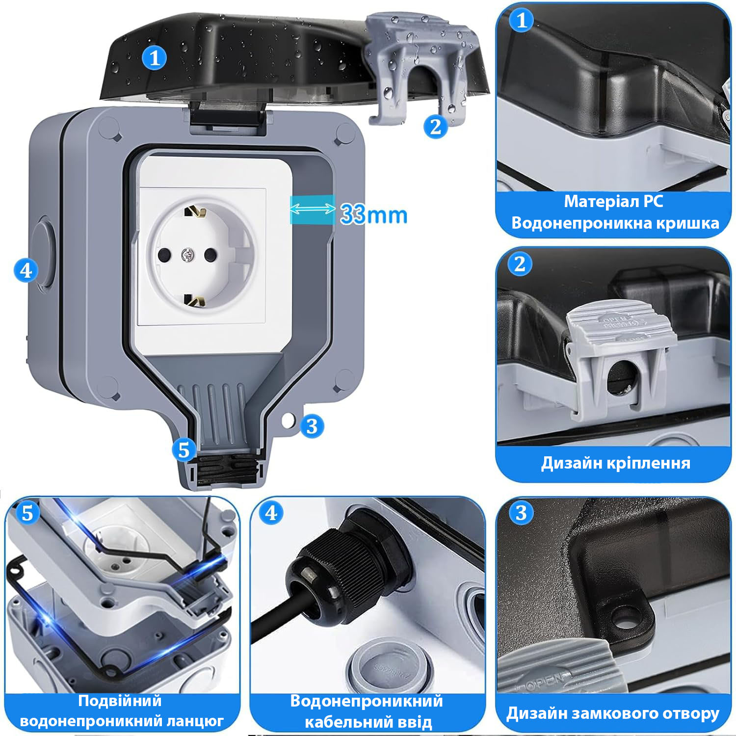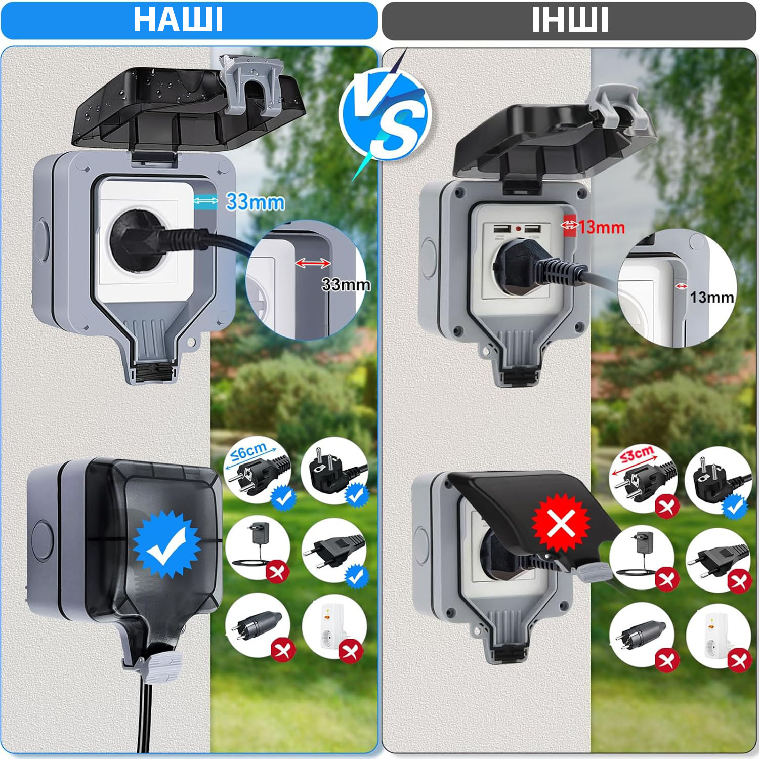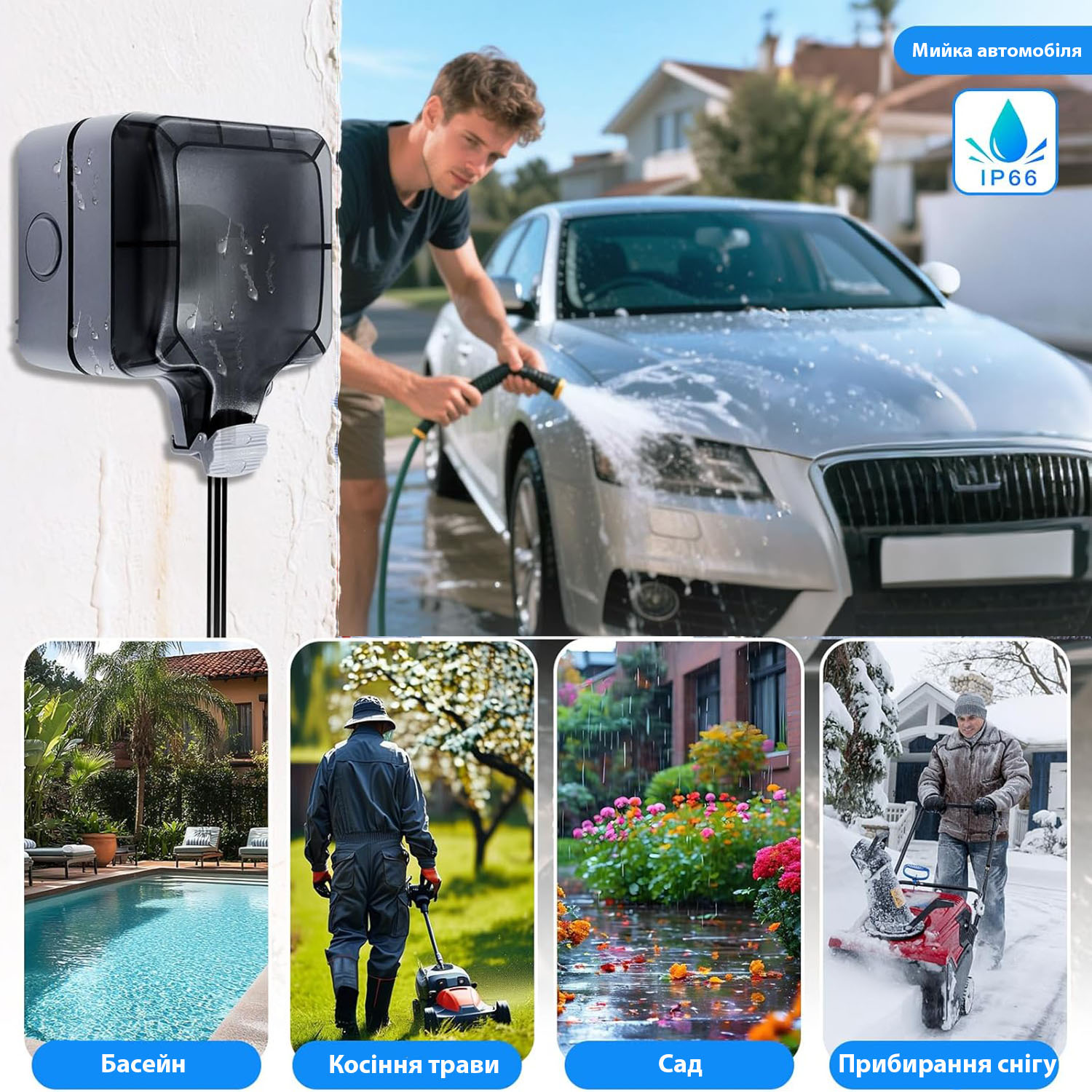 - Удобство и безопасность. Обеспечивает защиту электроустройств от непогоды. Безопасность использования даже во время дождя (электровилка под напряжением герметично закрывается крышкой). Устойчивость к высоким и низким температурам.