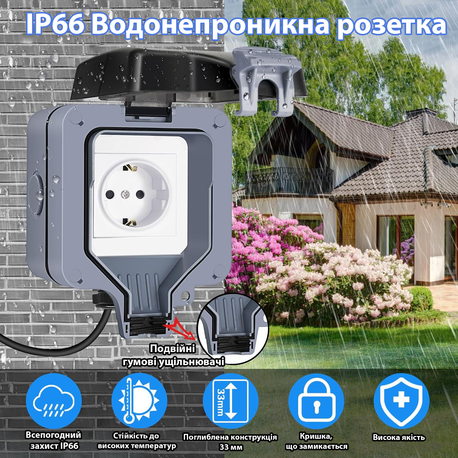 Эта розетка предназначена для использования в условиях, где необходима повышенная влагозащита. Она отлично подходит для установки на улице, в саду, на террасе, теплицах или других местах с повышенной влажностью. Благодаря высокому стандарту защиты IP66, розетка обеспечивает отличную защиту от воды и пыли.