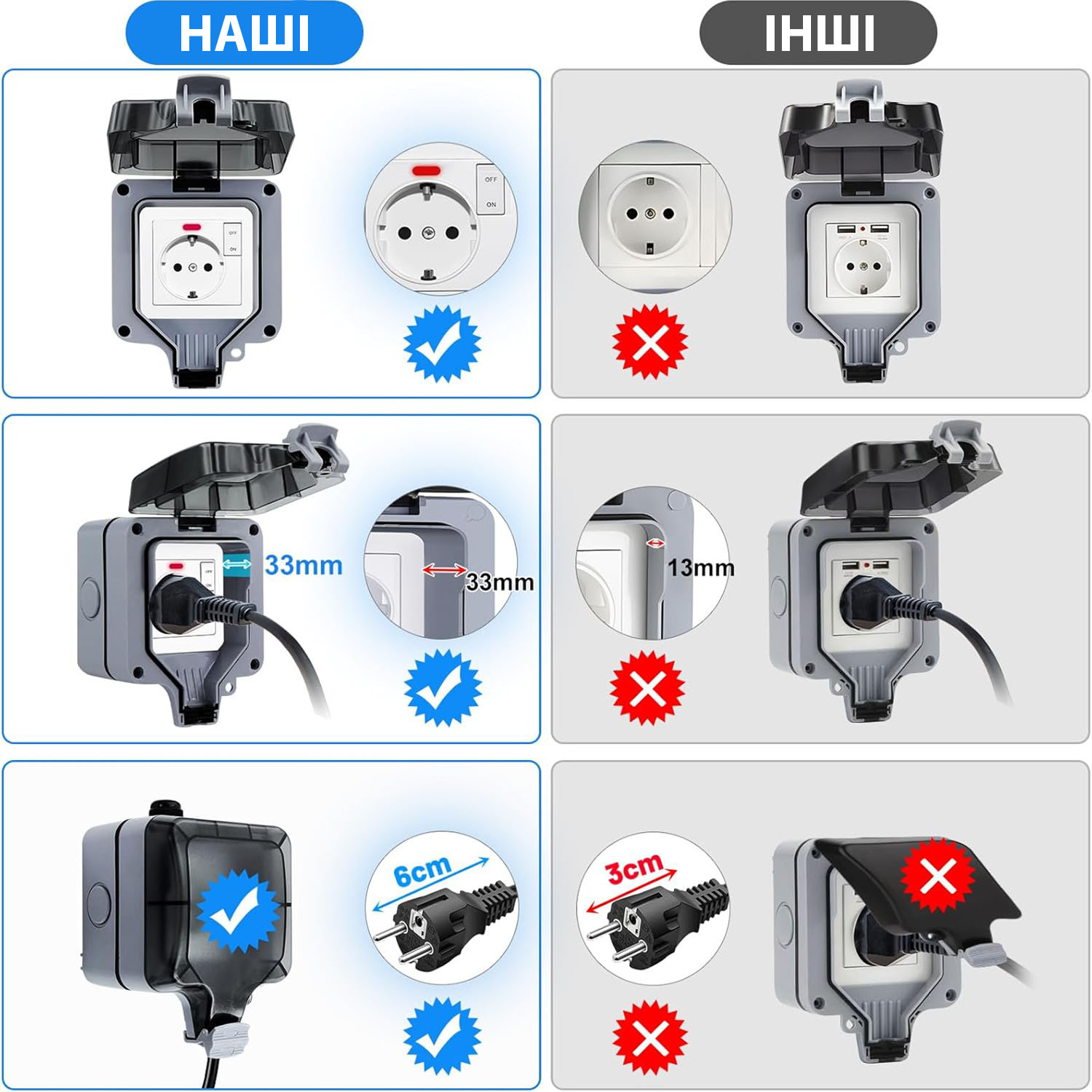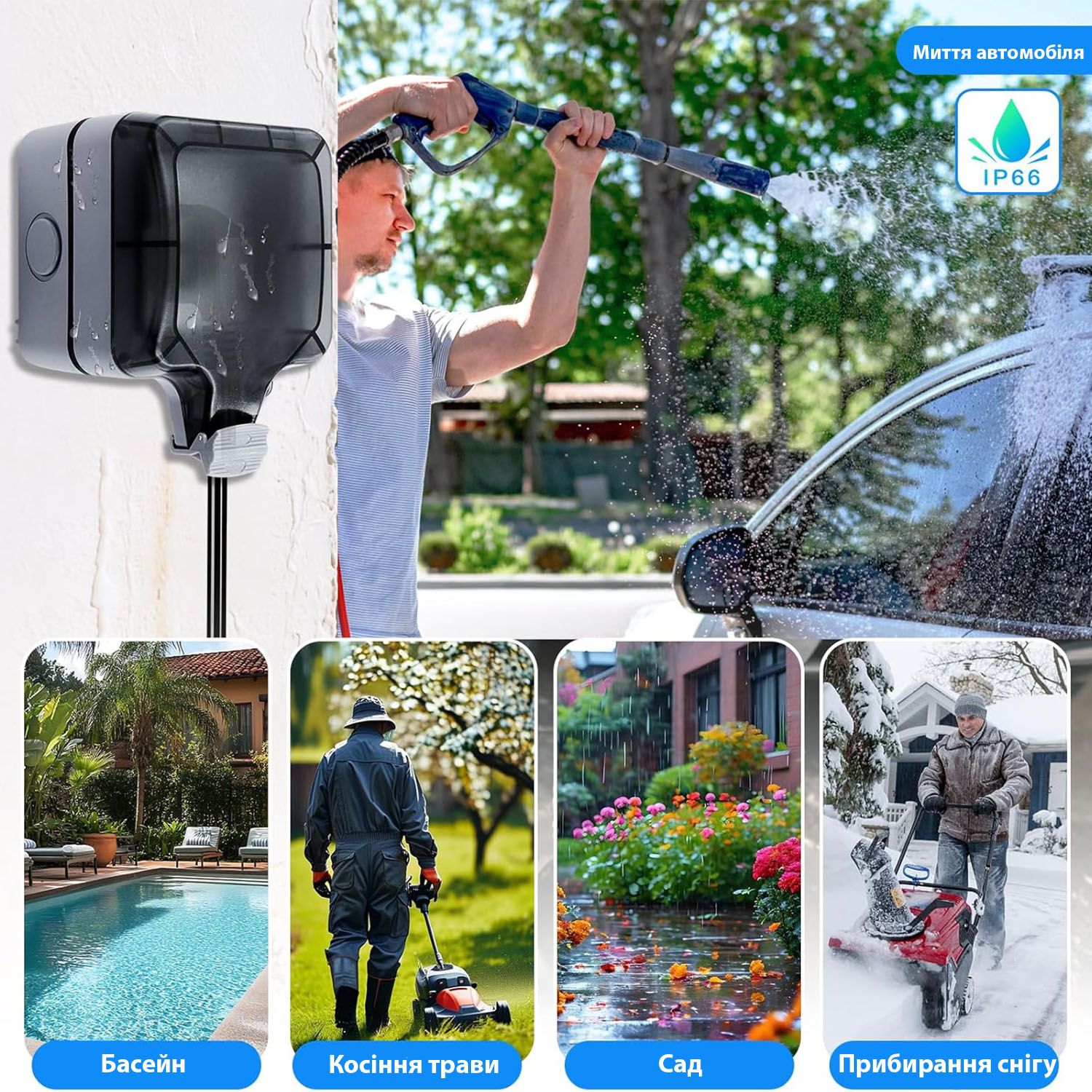 - Удобство и безопасность. Обеспечивает защиту электроустройств от непогоды. Безопасность использования даже во время дождя (электровилка под напряжением герметично закрывается крышкой). Устойчивость к высоким и низким температурам.