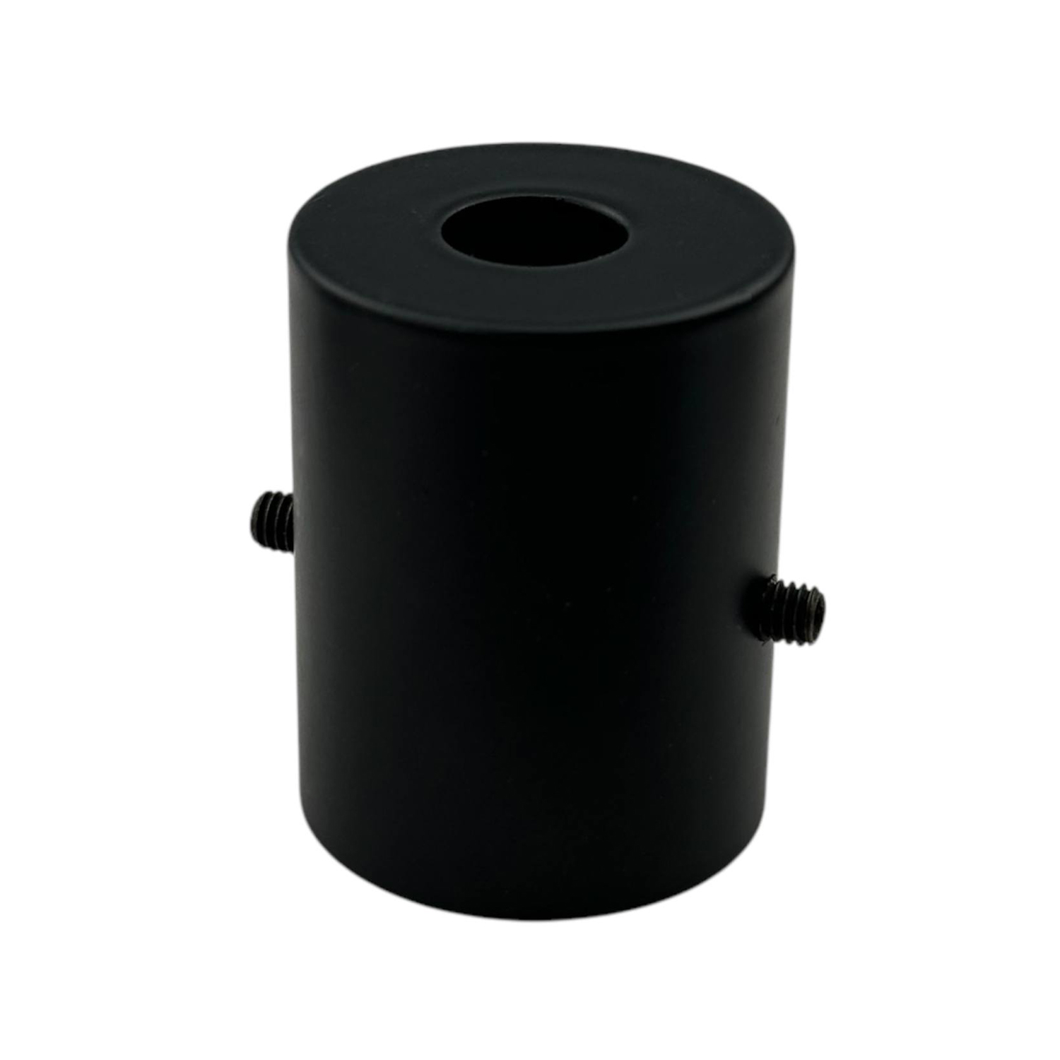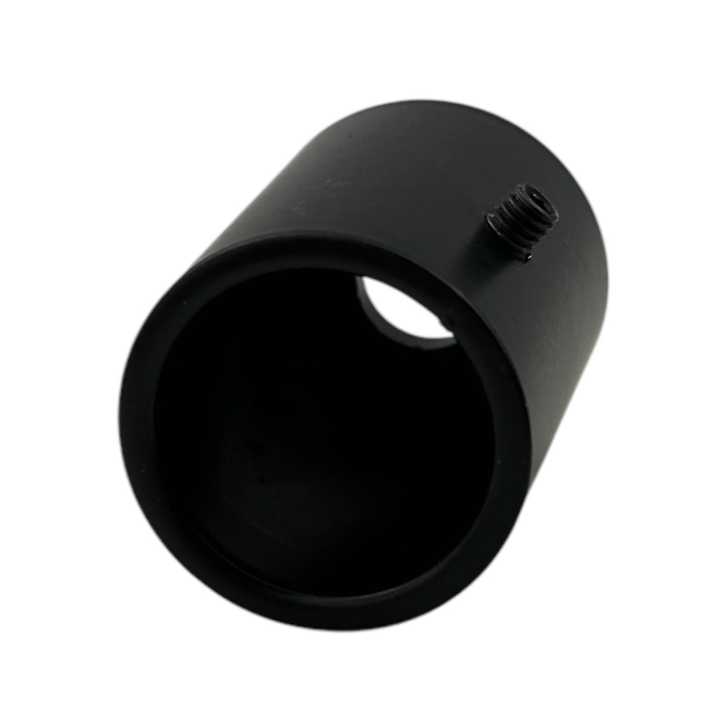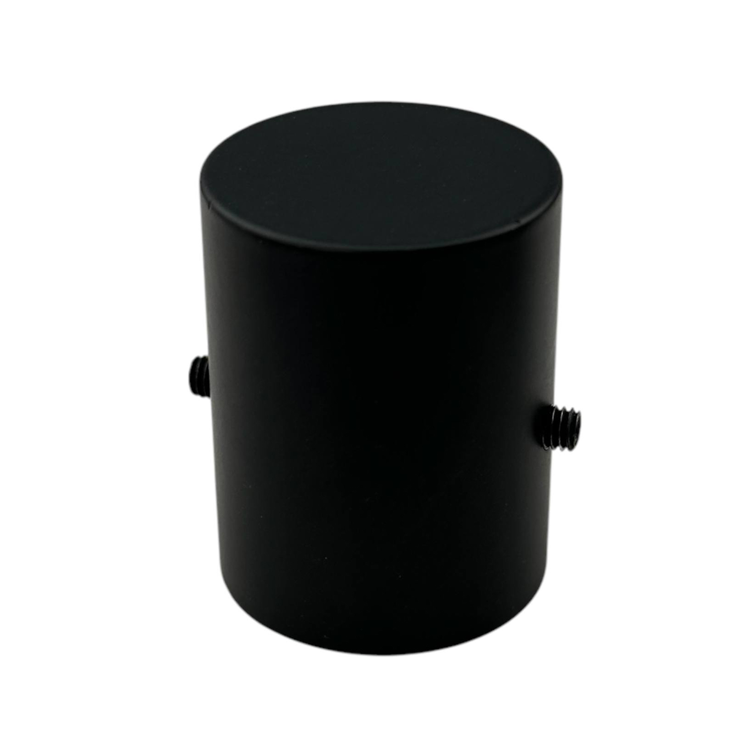 Набор из двух заглушек черного цвета. Заглушки представляют собой гильзы цилиндрической формы из толстого металла с отверстиями для шурупов по стенкам цилиндра. Одна из заглушек с отверстием сверху под шпильку. Используются при сборке люстр как связующий и декоративный элемент светильника. Могут использоваться в качестве держателей для гибкого неона диаметром 25 мм.