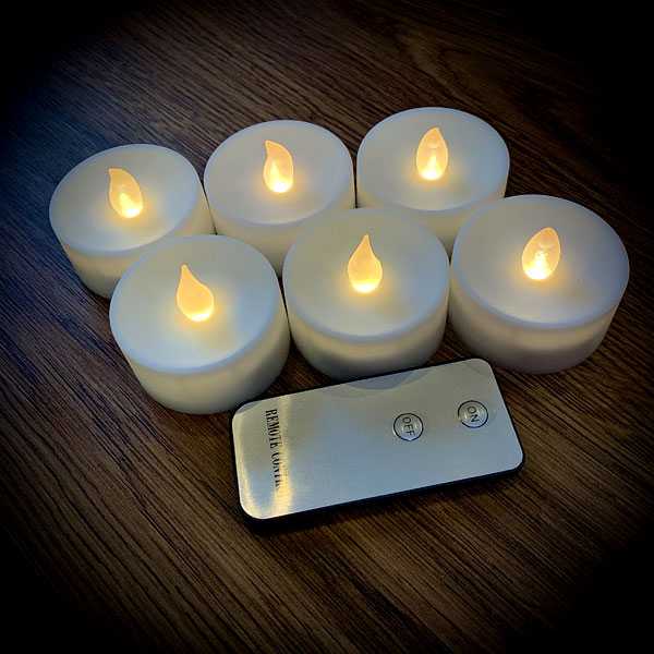 В наборе 6 свечей в комплекте с пультом ДУ позволяющим одновременно управлять всеми чайными LED свечами данного типа.