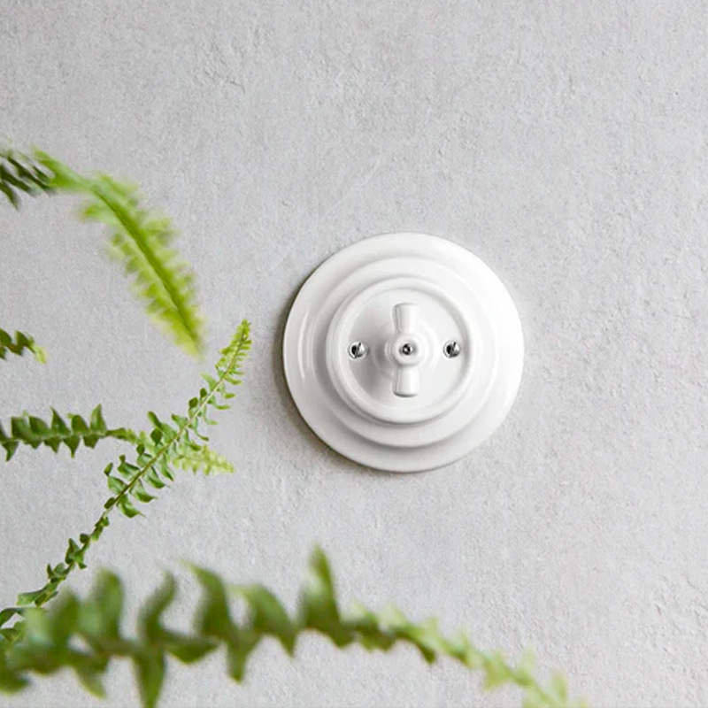 Керамический ретро выключатель Keruida в классическом белом цвете — это гармоничное сочетание винтажной эстетики, натуральных материалов и надежной электрофурнитуры. Поворотный механизм и лаконичная форма делают его выразительным элементом интерьера, который отлично дополняет пространства в стилях лофт, ретро, индастриал, кантри или скандинавский минимализм.