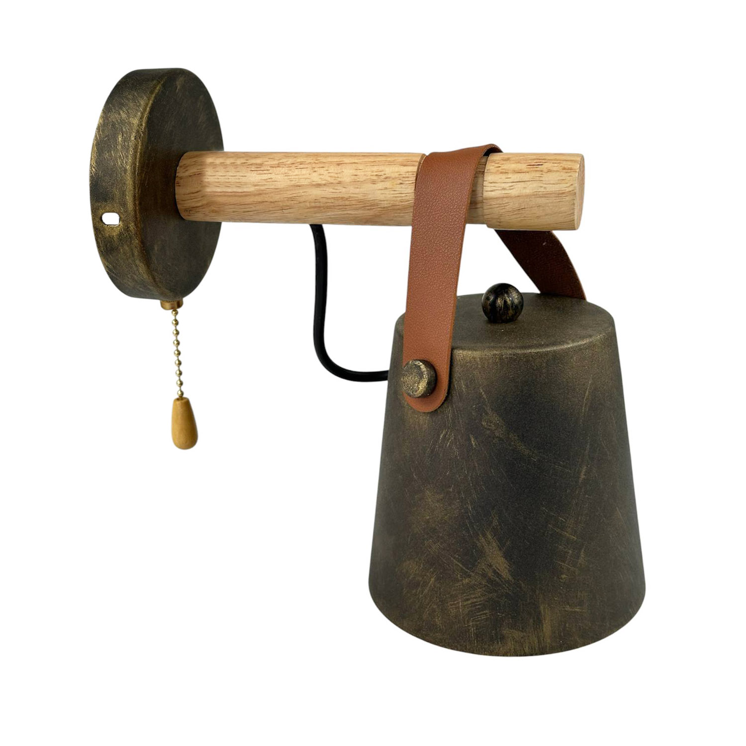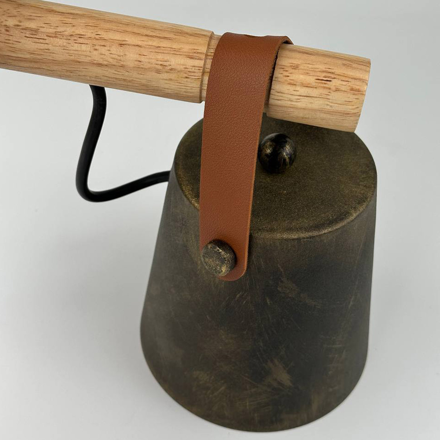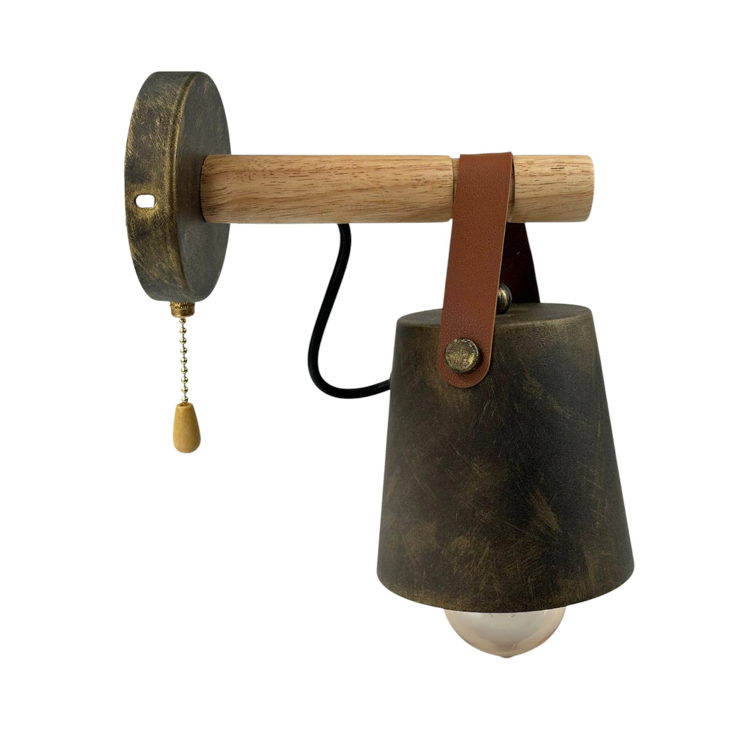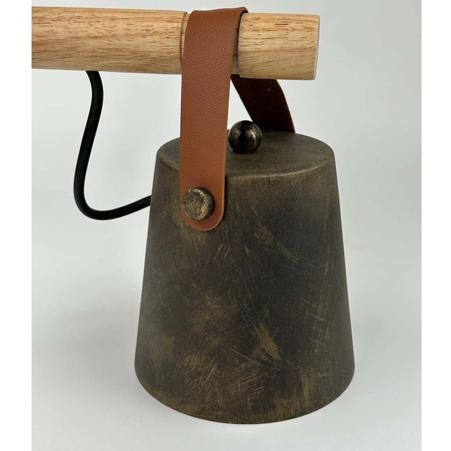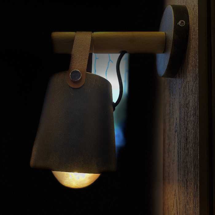 Светильник Scan- бра в скандинавском стиле с проводом в двойной изоляции и металлическим плафоном в виде усеченного конуса прикрепленноно на деревянной направляющей при помощи кожаного ремня.