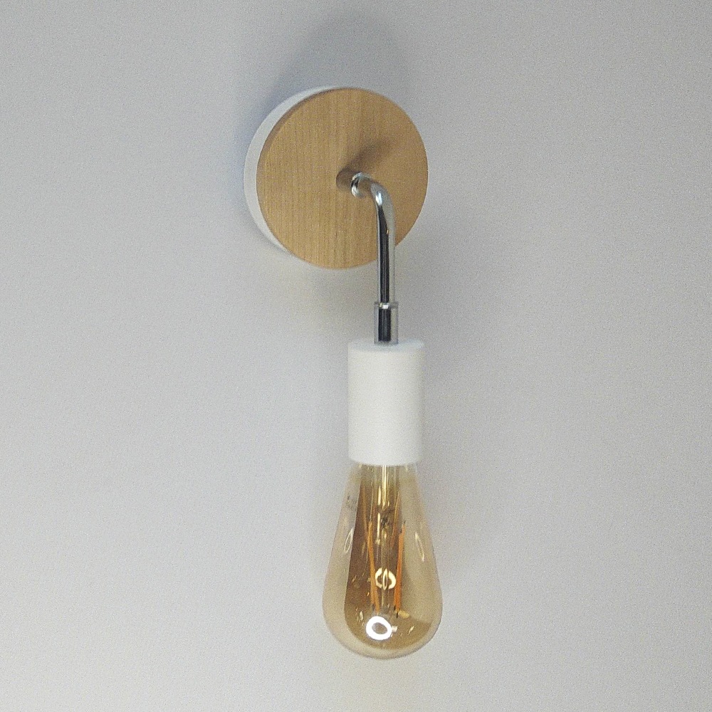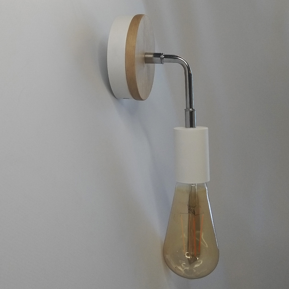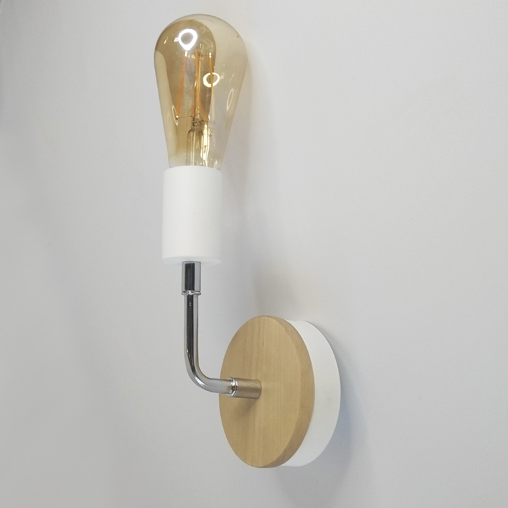 Настенный светильник, бра в стиле модерн Wood b-1 белое на хромированной гиб трубке с деревянной накладкой на настенном креплении очень стильный и лаконичный светильник. Гармонично смотрится в симбиозе с лампочкой Эдисона. Можно размещать как вверх патроном, так и вниз.