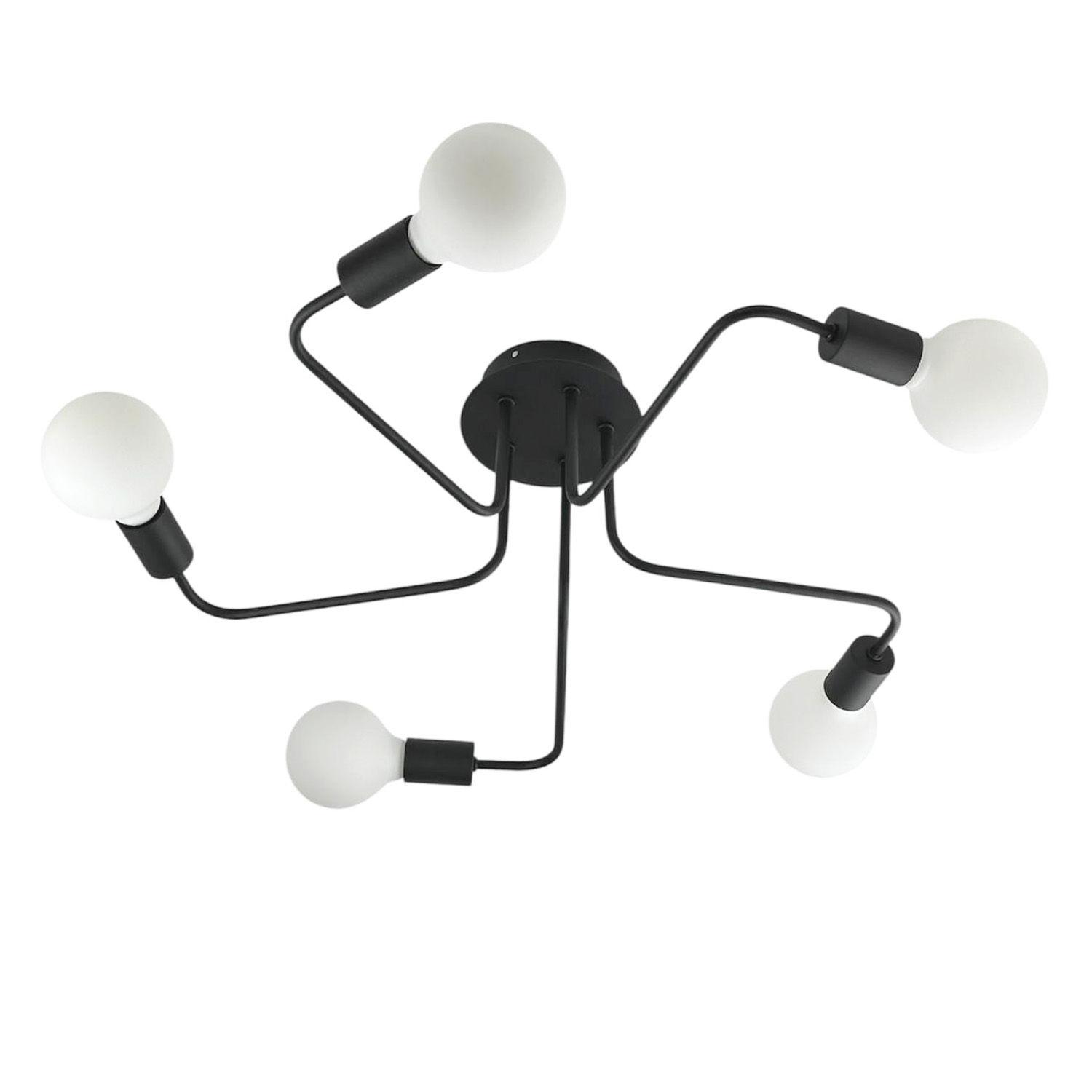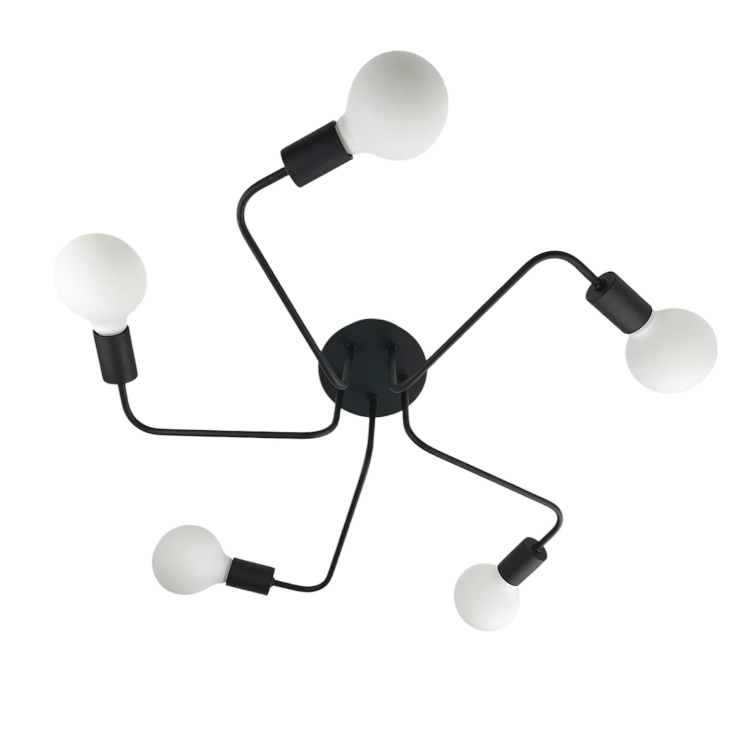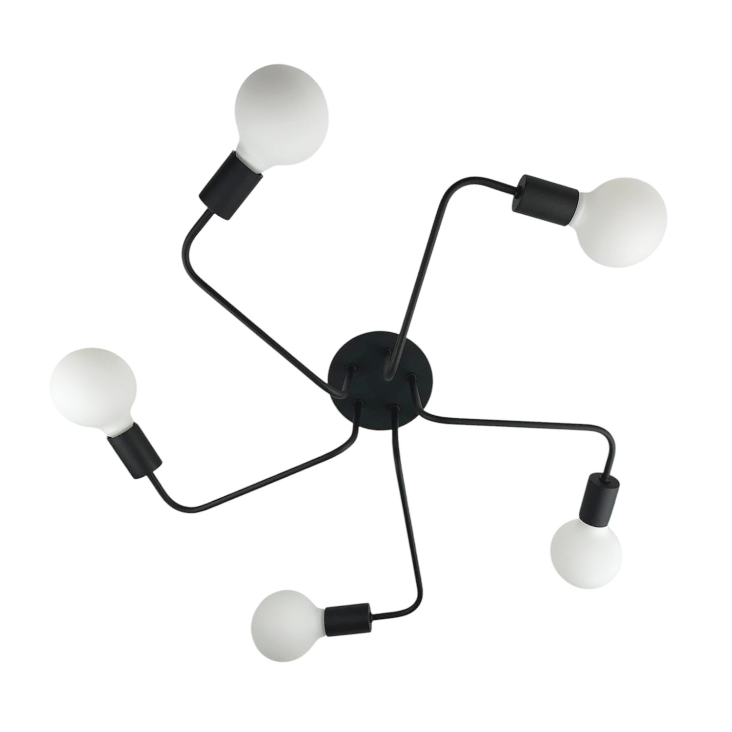 Современная и лаконичная люстра на 5 ламп – стильное решение для интерьера в стиле лофт, индастриал или минимализм. Черное металлическое основание с 5 плавно изогнутыми «лапами» заканчивается открытыми патронами под лампы с цоколем E27. Благодаря открытому дизайну свет распределяется максимально эффективно, создавая яркую, функциональную атмосферу.
