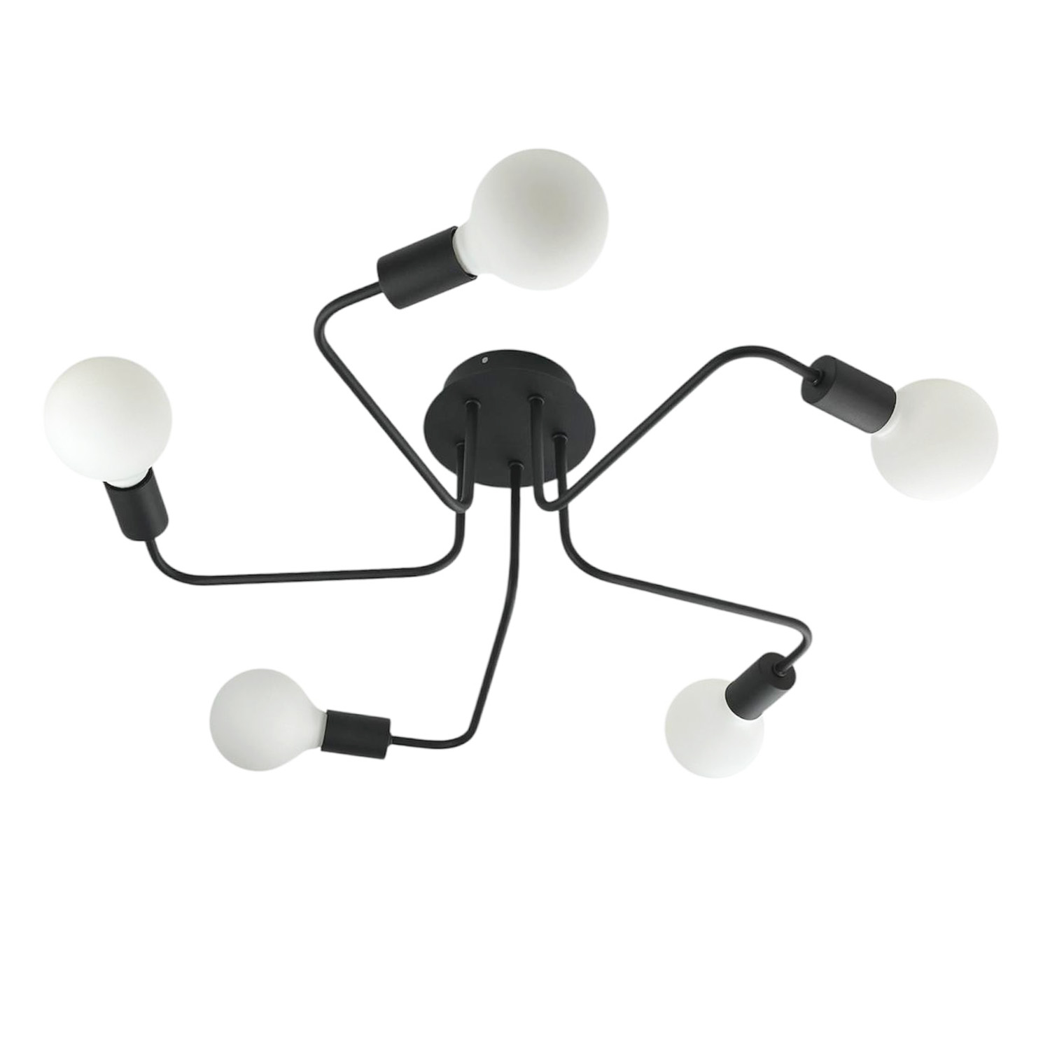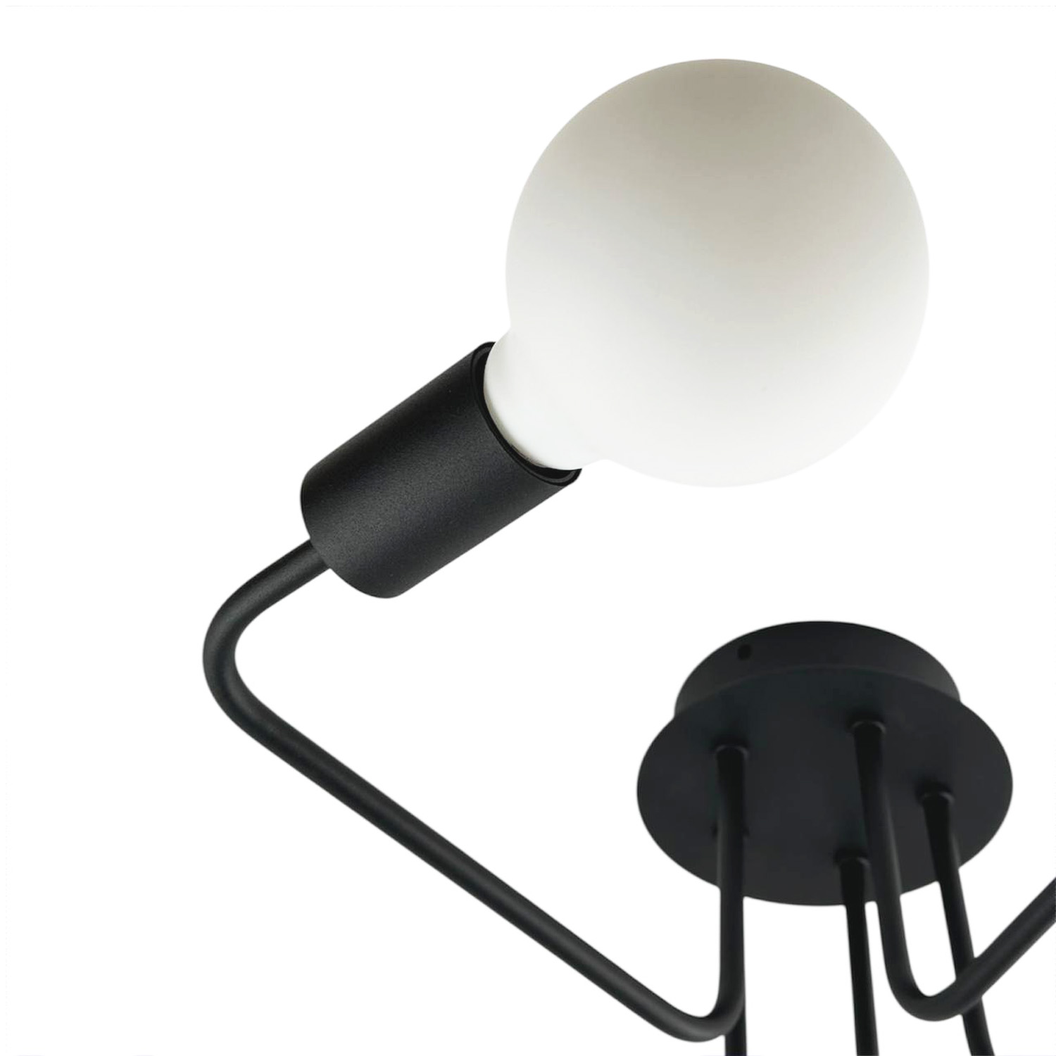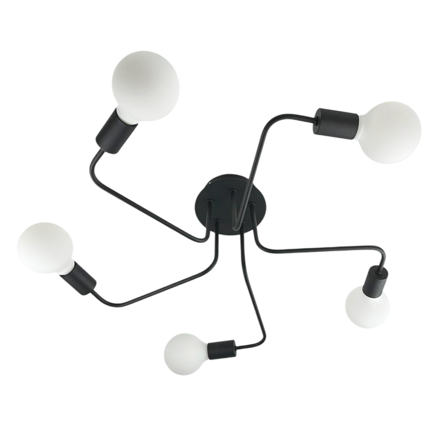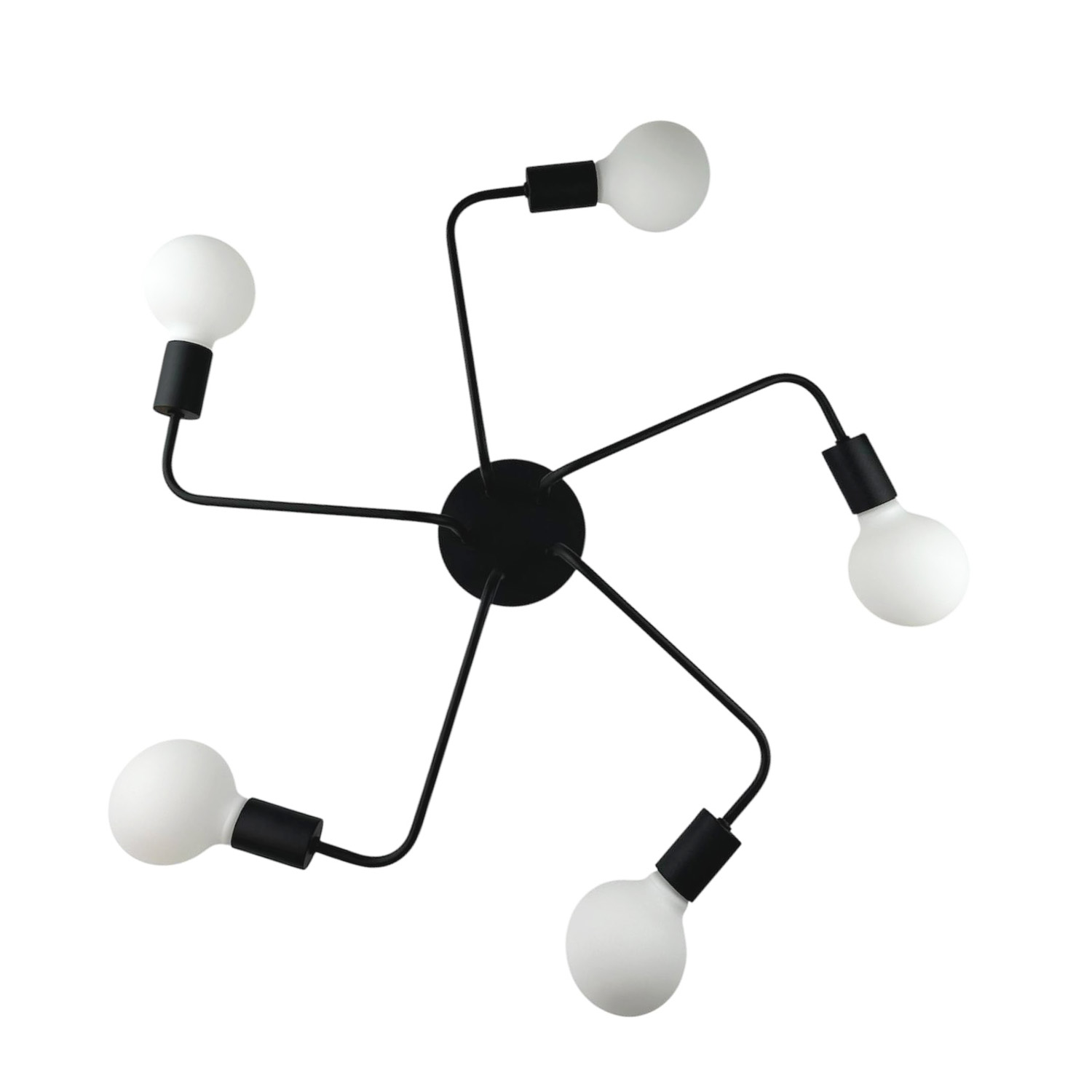 Современная и лаконичная люстра на 5 ламп – стильное решение для интерьера в стиле лофт, индастриал или минимализм. Черное металлическое основание с 5 плавно изогнутыми «лапами» заканчивается открытыми патронами под лампы с цоколем E27. Благодаря открытому дизайну свет распределяется максимально эффективно, создавая яркую, функциональную атмосферу.