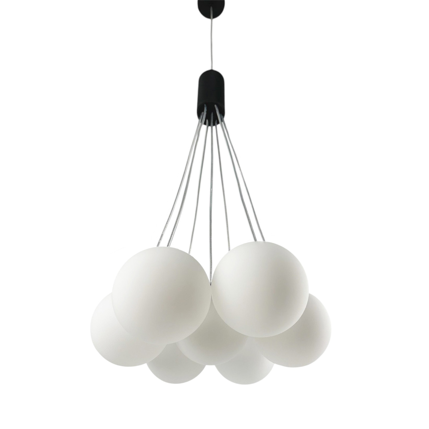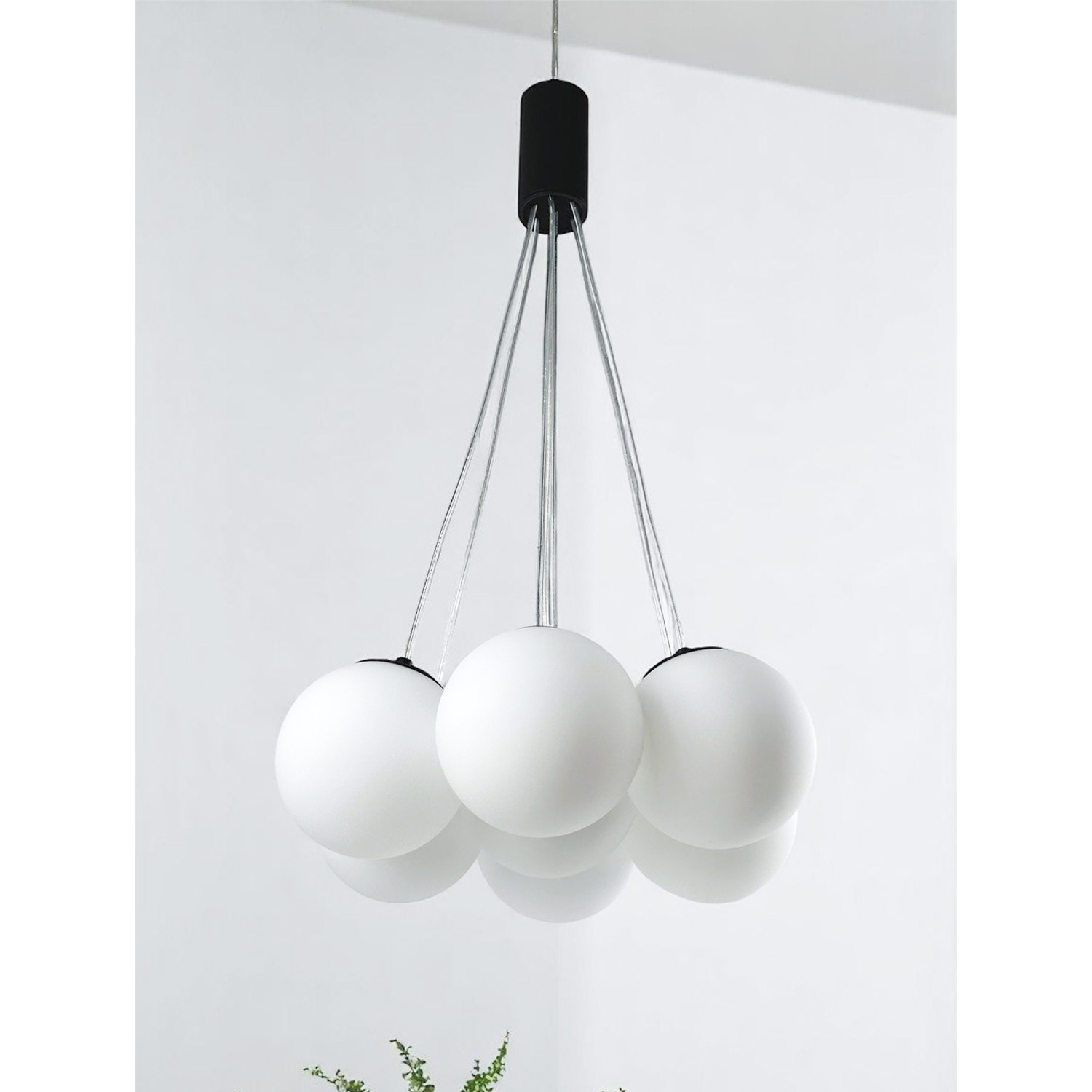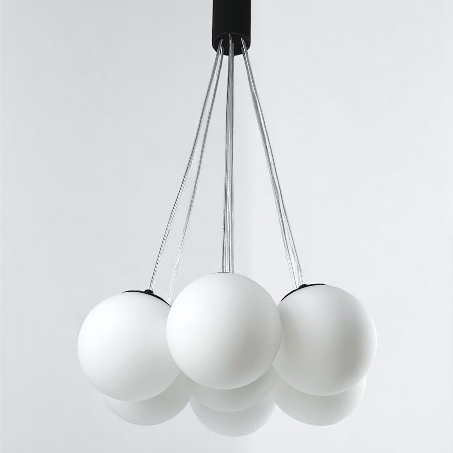 Современная дизайнерская люстра с семью стеклянными шарами создаёт ощущение лёгкости и невесомости благодаря прозрачным проводам. Шары образуют гармоничную композицию, которая подходит как для просторных гостиных, так и для стильных холлов или столовых зон. Диаметр одного плафона — 130 см, что делает люстру заметным акцентом в интерьере.