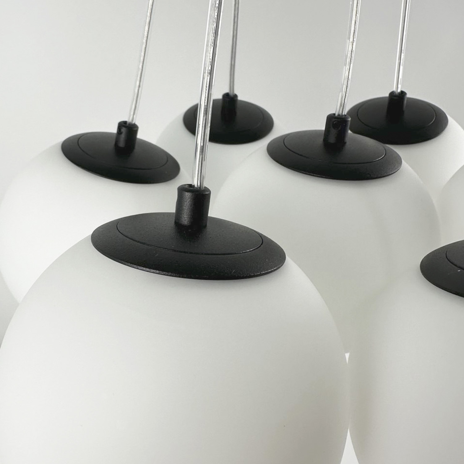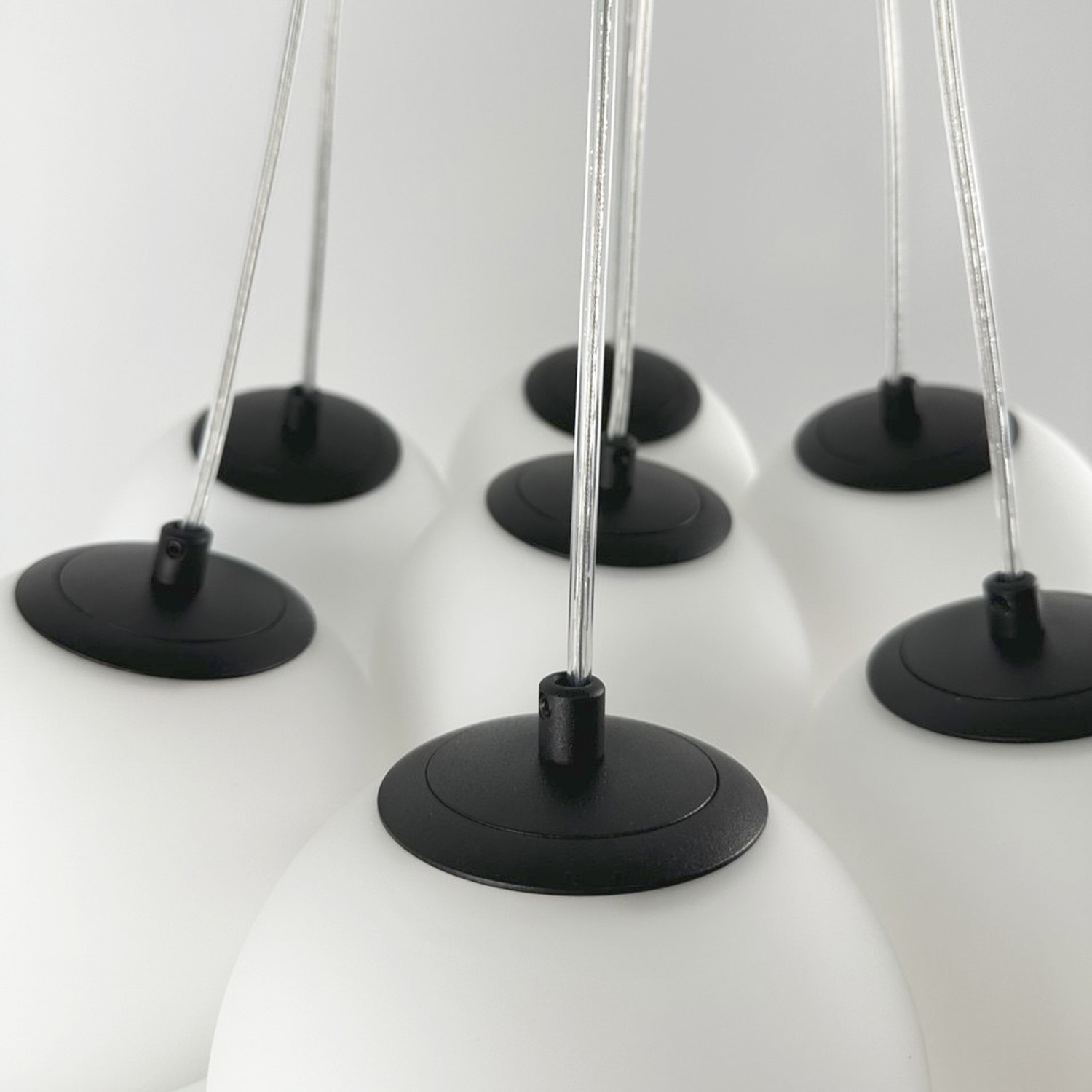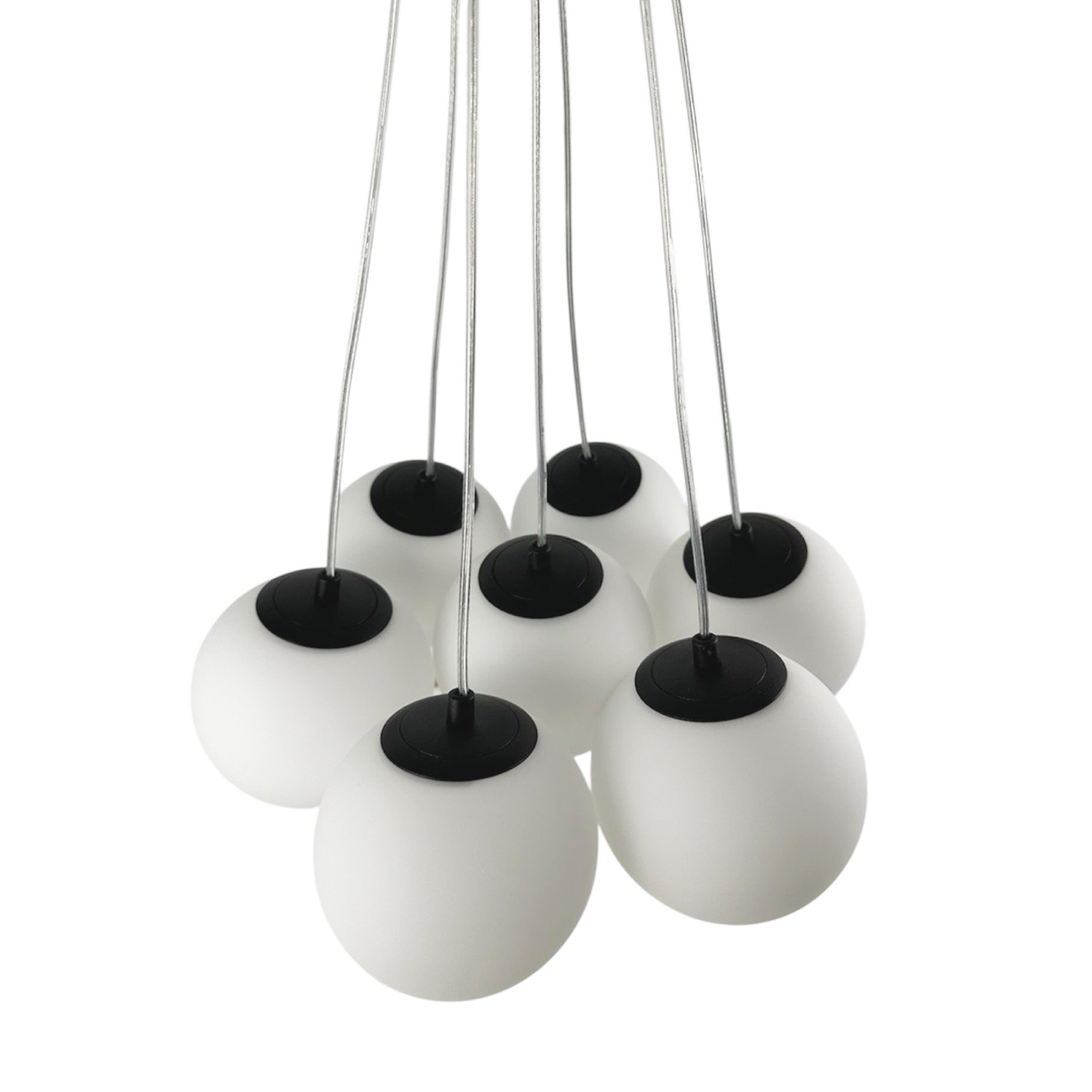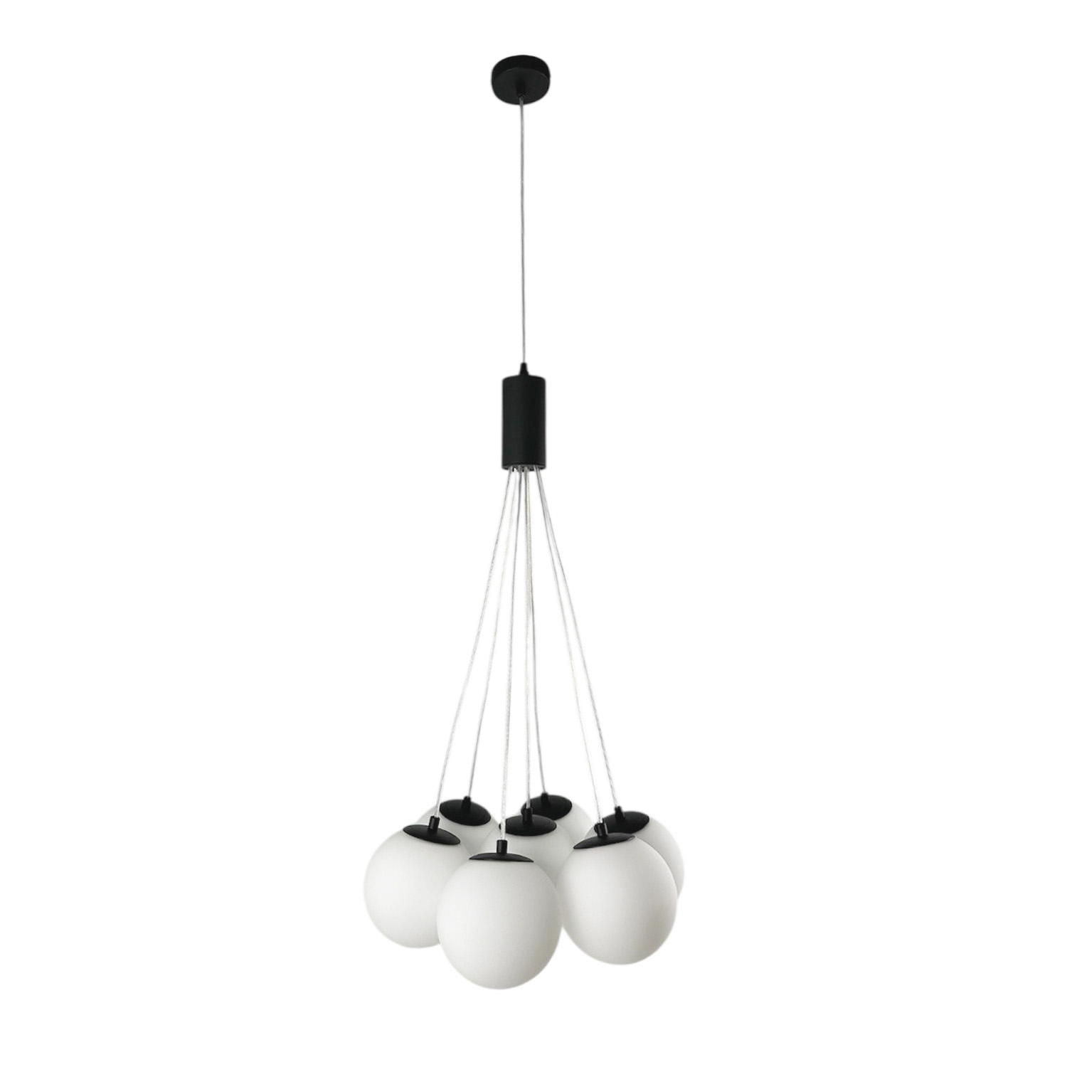 Современная дизайнерская люстра с семью стеклянными шарами создаёт ощущение лёгкости и невесомости благодаря прозрачным проводам. Шары образуют гармоничную композицию, которая подходит как для просторных гостиных, так и для стильных холлов или столовых зон. Диаметр одного плафона — 130 см, что делает люстру заметным акцентом в интерьере.