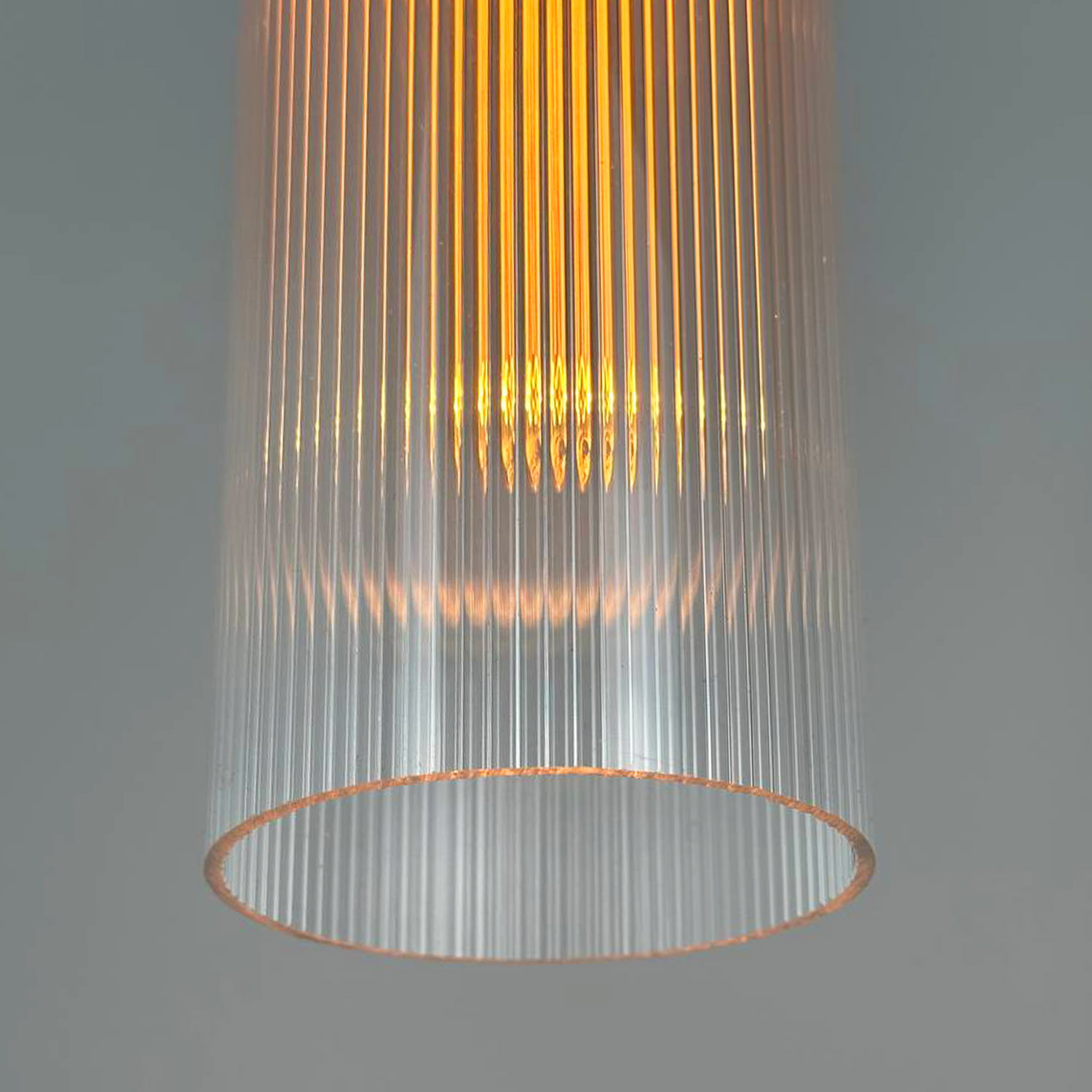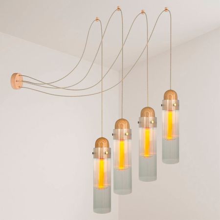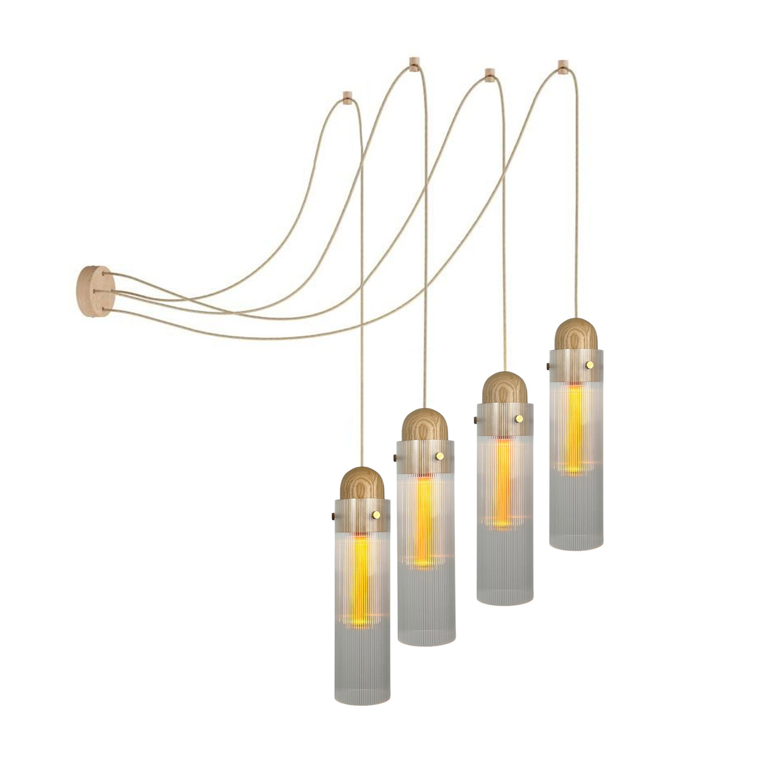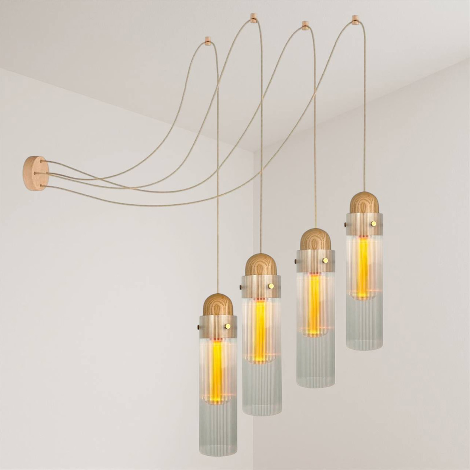 Этот светильник в минималистическом стиле станет ярким акцентом современного интерьера. Его изящная конструкция с изогнутыми кабелями придают люстре легкости и динамики. Четыре цилиндрических плафона с рифленой поверхностью из прозрачного стекла создают мягкое и рассеянное освещение.