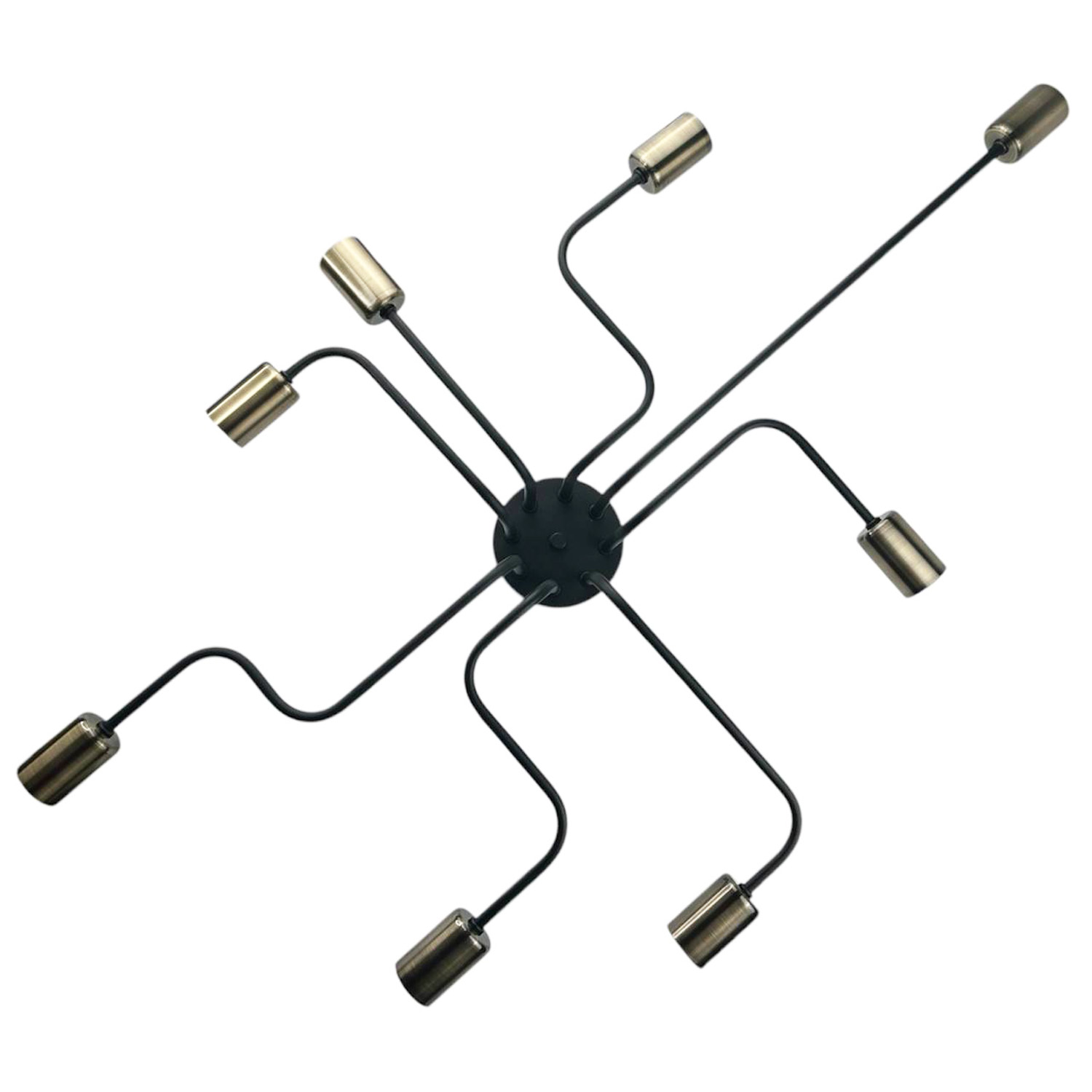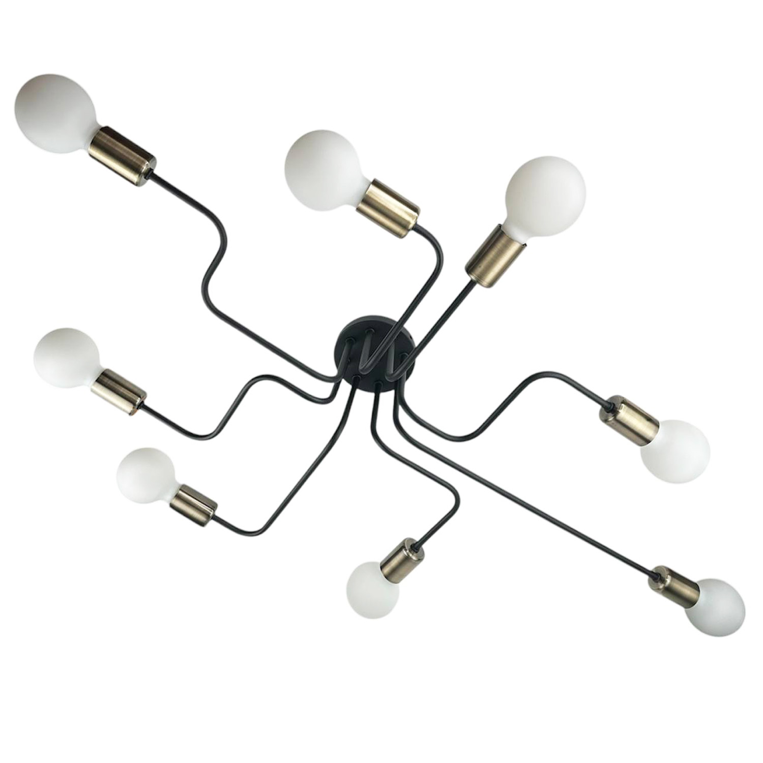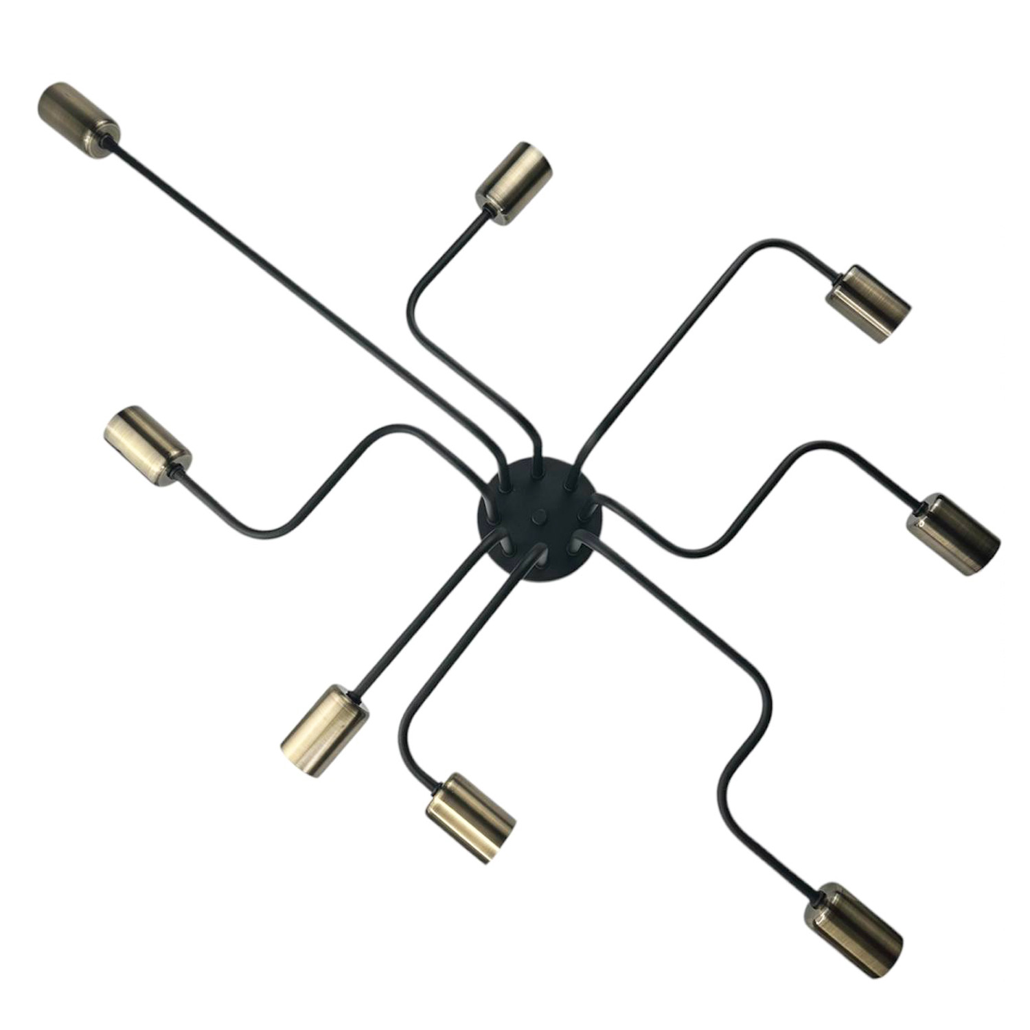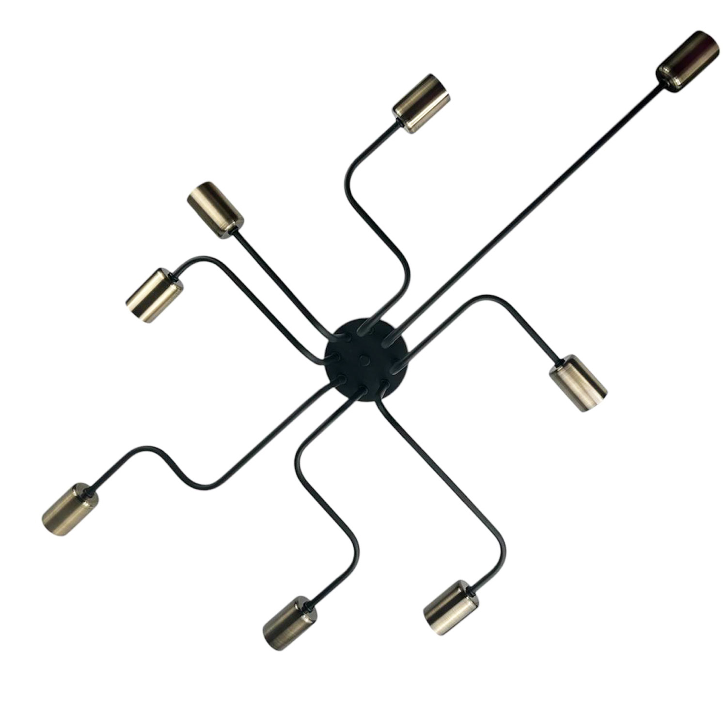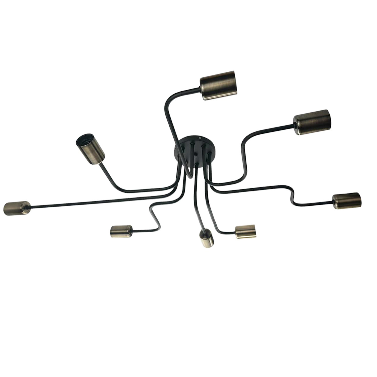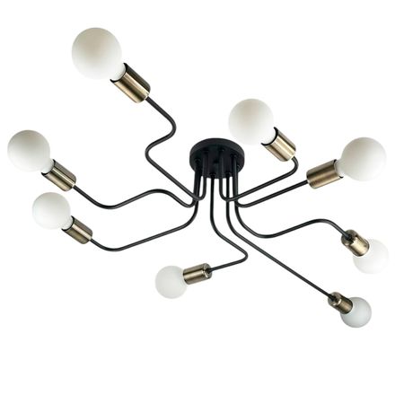 Оригинальный потолочный светильник, выполненный в индустриальном стиле. Композиция из черного металлического основания и восьми расходящихся в разные стороны трубок с бронзовыми патронами