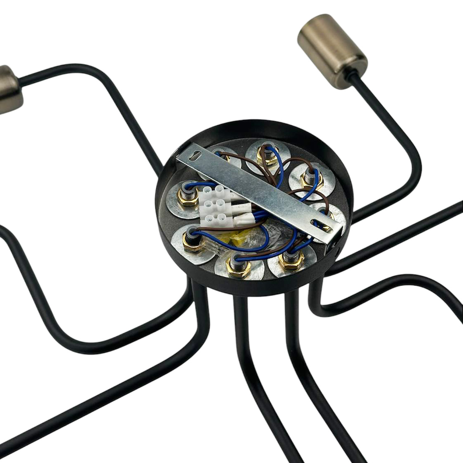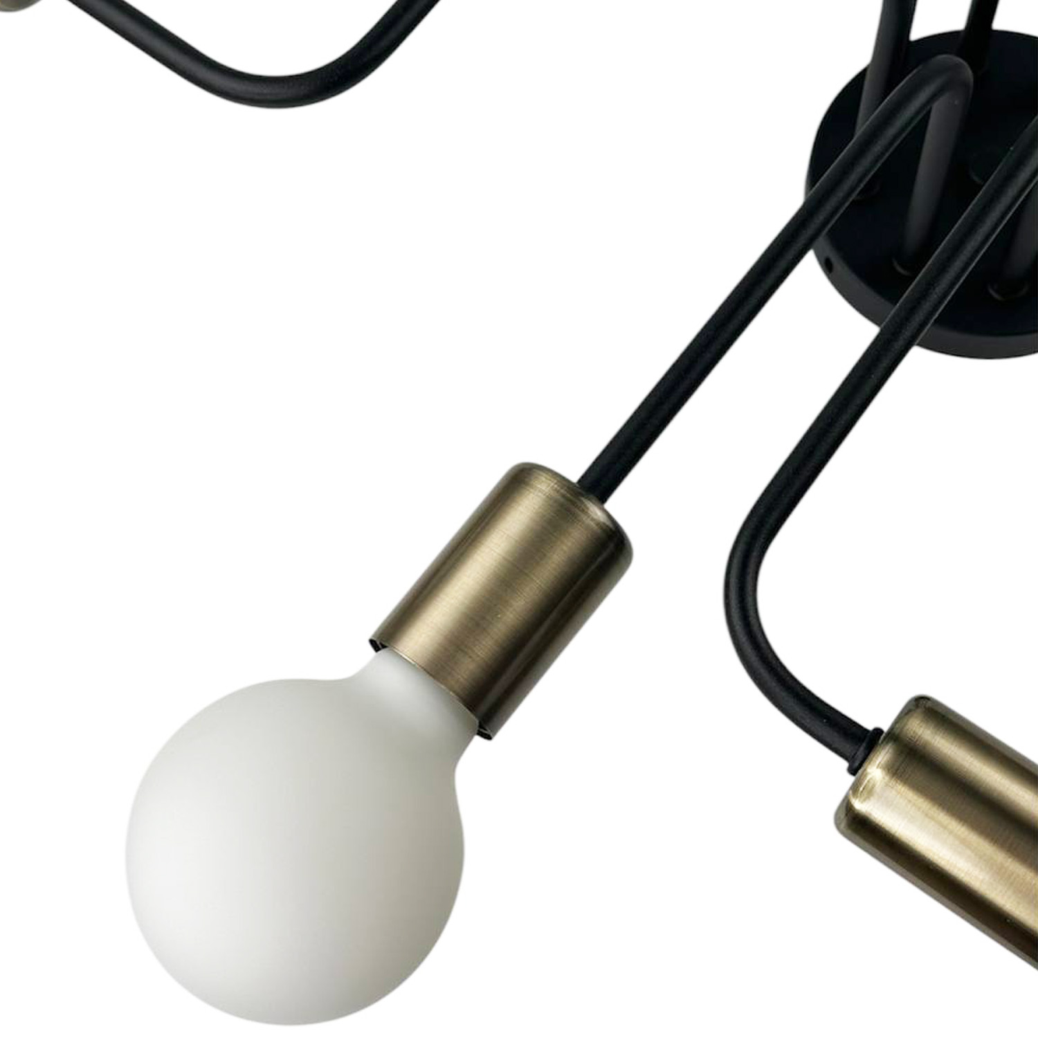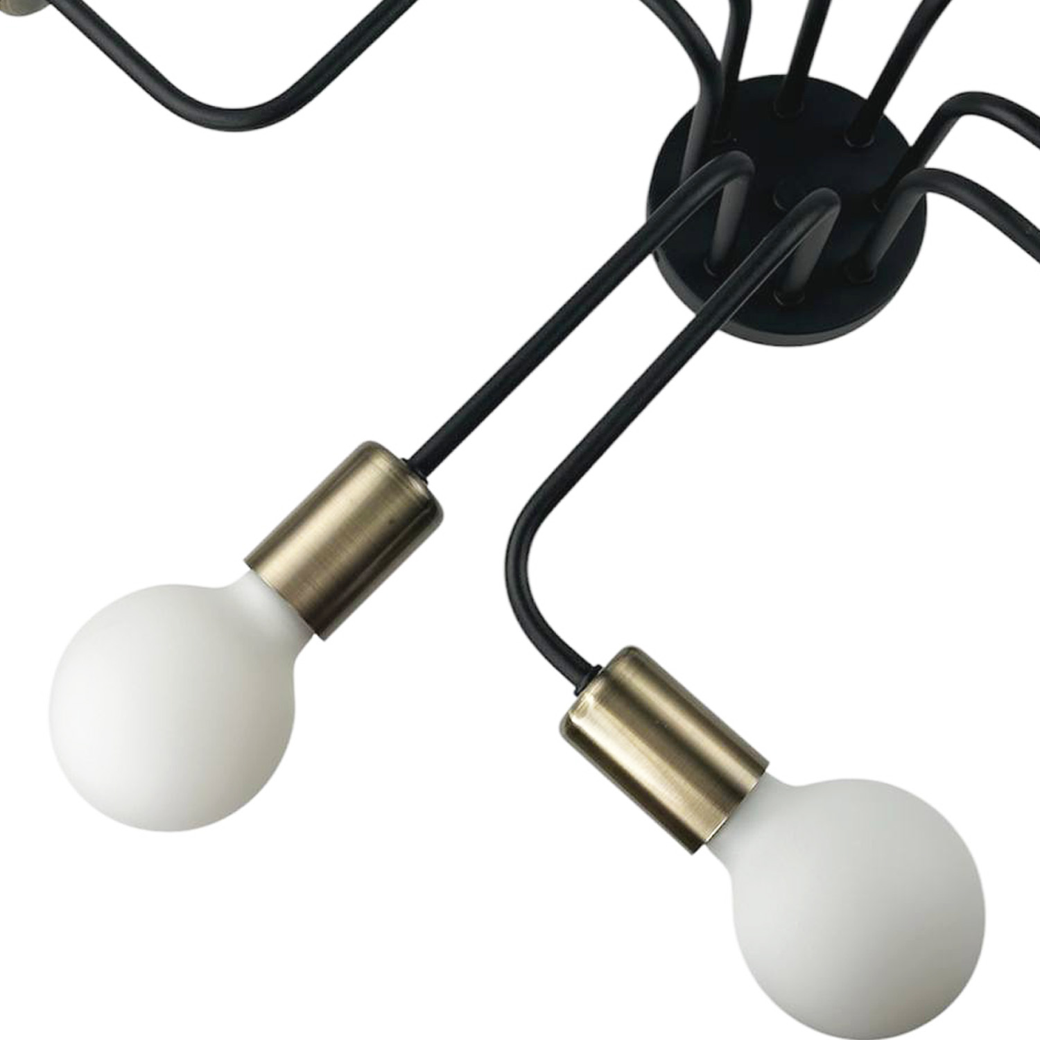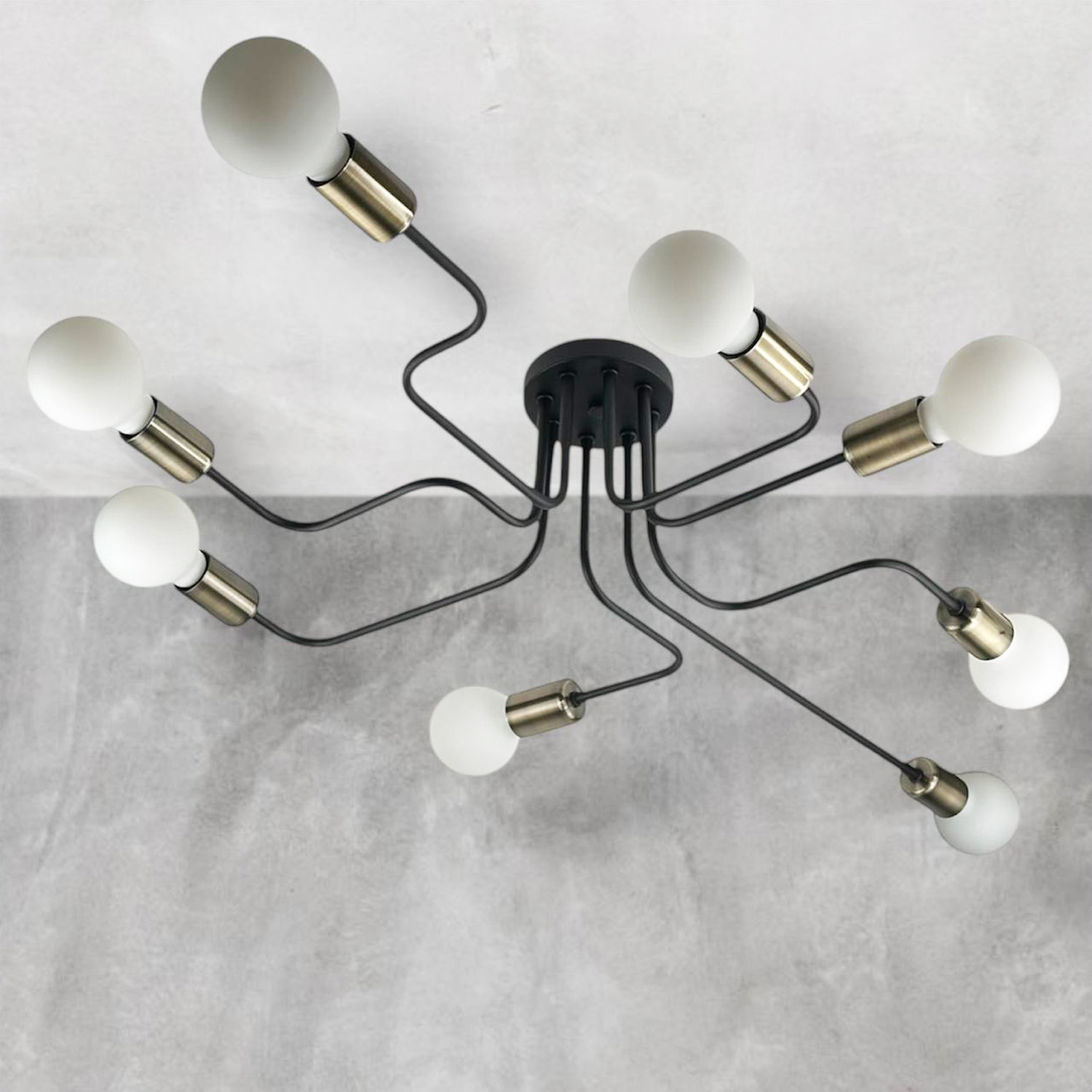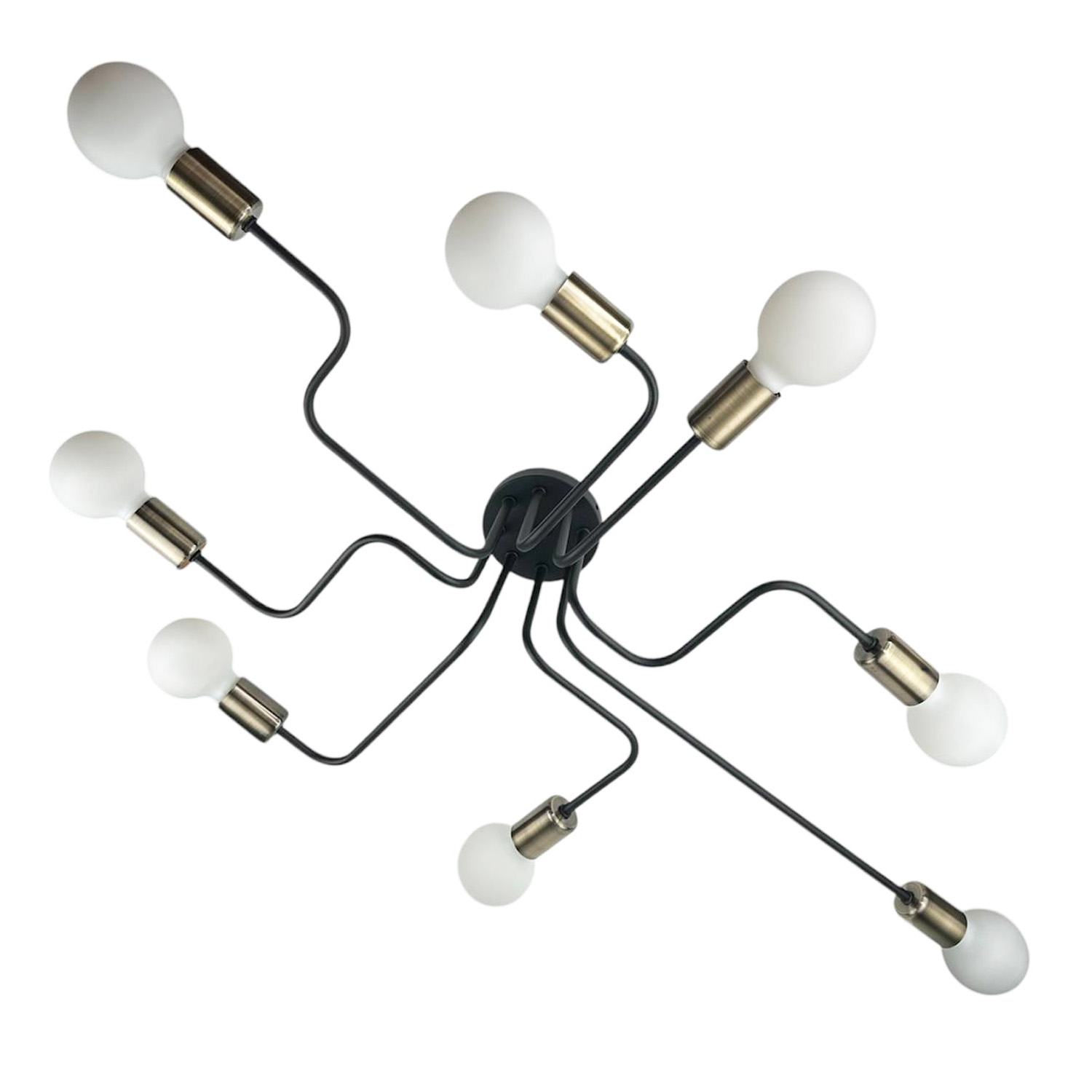 Оригинальный потолочный светильник, выполненный в индустриальном стиле. Композиция из черного металлического основания и восьми расходящихся в разные стороны трубок с бронзовыми патронами