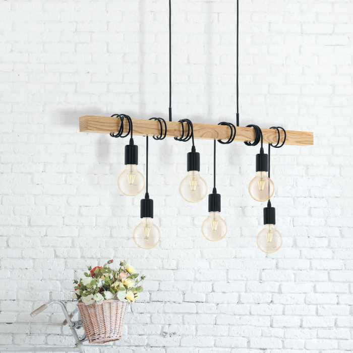 Люстра в скандинавском стиле Wood 1.2.6 на 6 ламп, черная с планкой из натурального дерева.