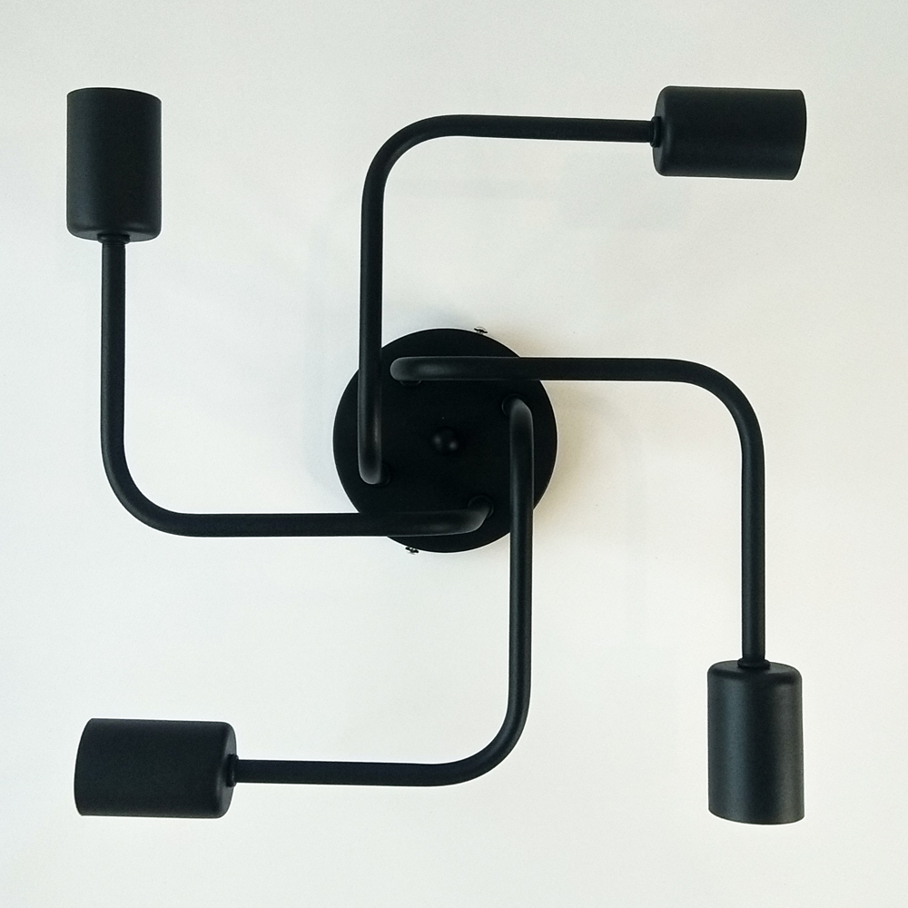 Металлическическая потолочная люстра Коловрат реализована в виде диска - потолочного крепления с размещённими на нём изогнутыми под прямыми углами одинаковыми ножками каждая из которых заканчивается патроном E27. Простота и функциональность этого светильника прекрасно сочетаются с интерьерами лофт.