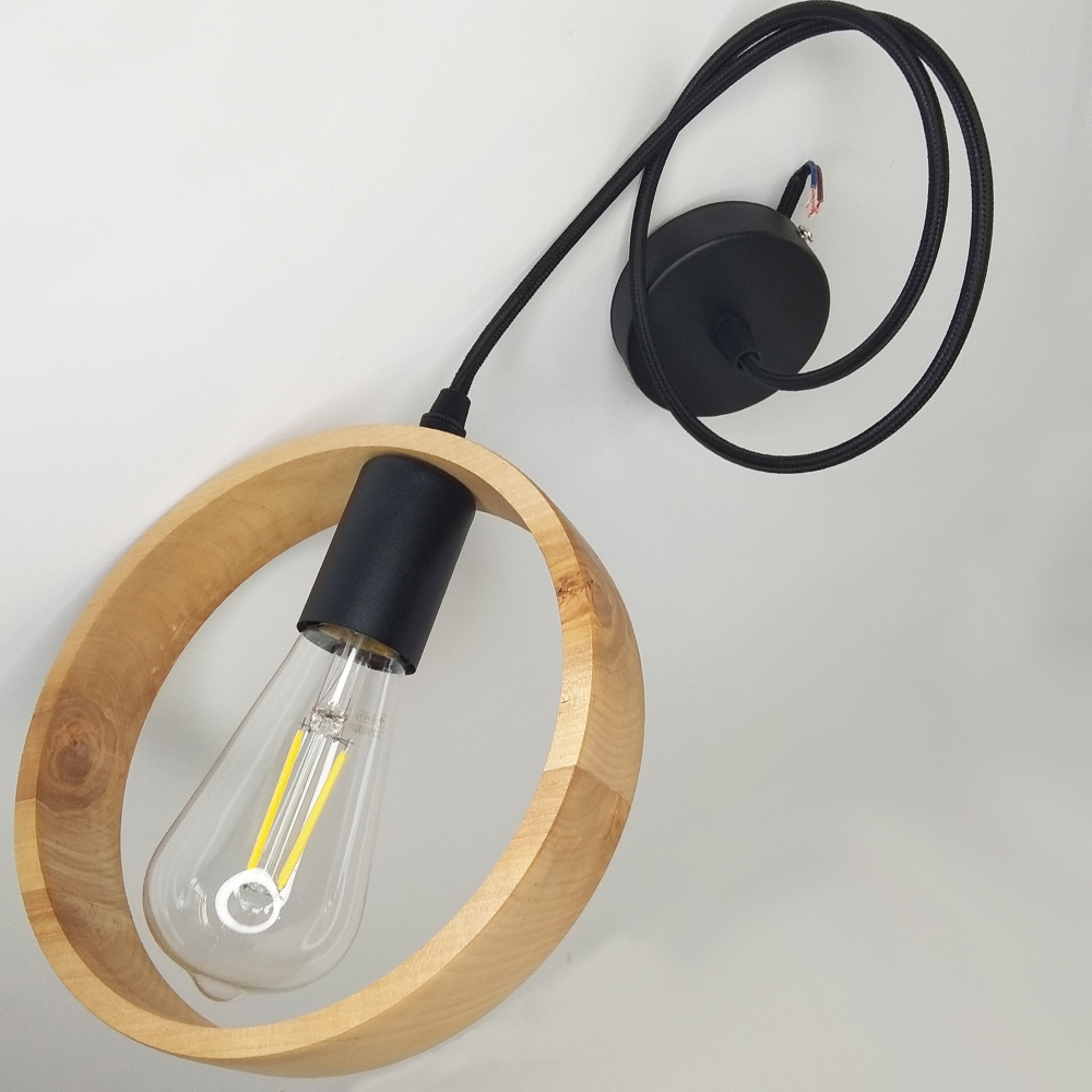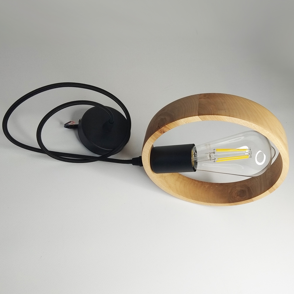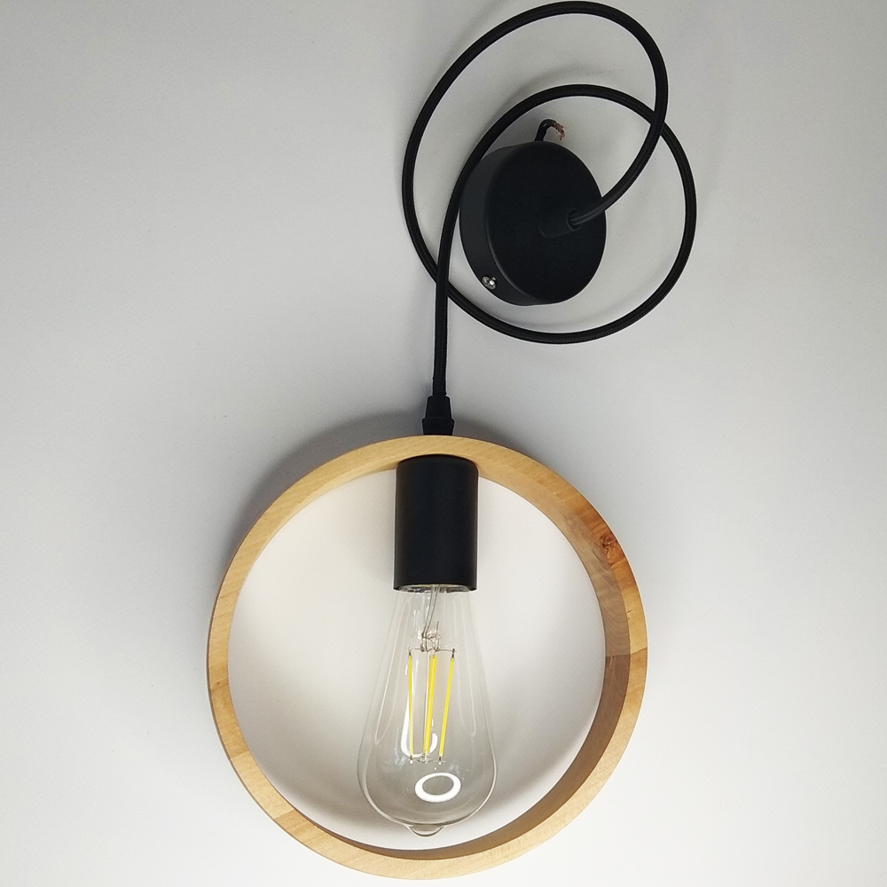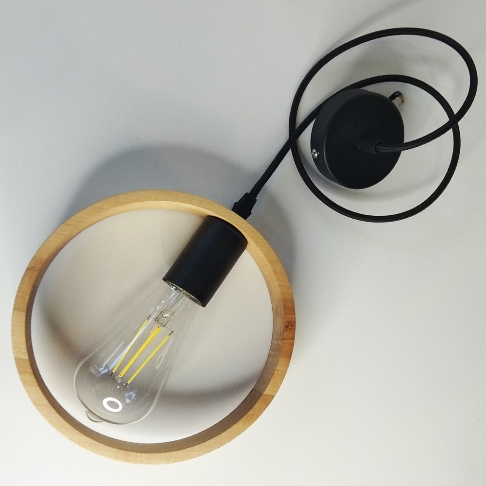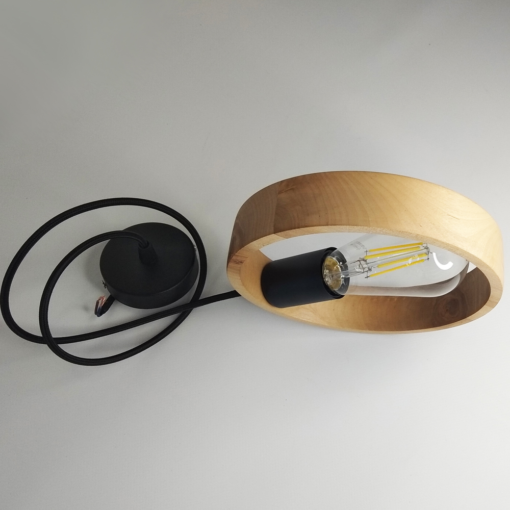 Светильник изготовлен в скандинавском стиле, с деревянной рамкой из ясеня в виде круга, которая используются вместо традиционного плафона. Деревянные части светильника обработаны на профессиональных станках и покрыты качественным лаком. Комплектующие из металла могут использоваться в черном или белом цвете по желанию заказчика.