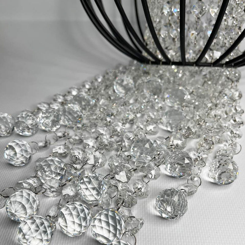 Основу светильника составляет крепкий металлический каркас, внутри которого размещены каскадом хрустальные подвесы. Свет отражается от бусин и рассеивается множеством лучей.