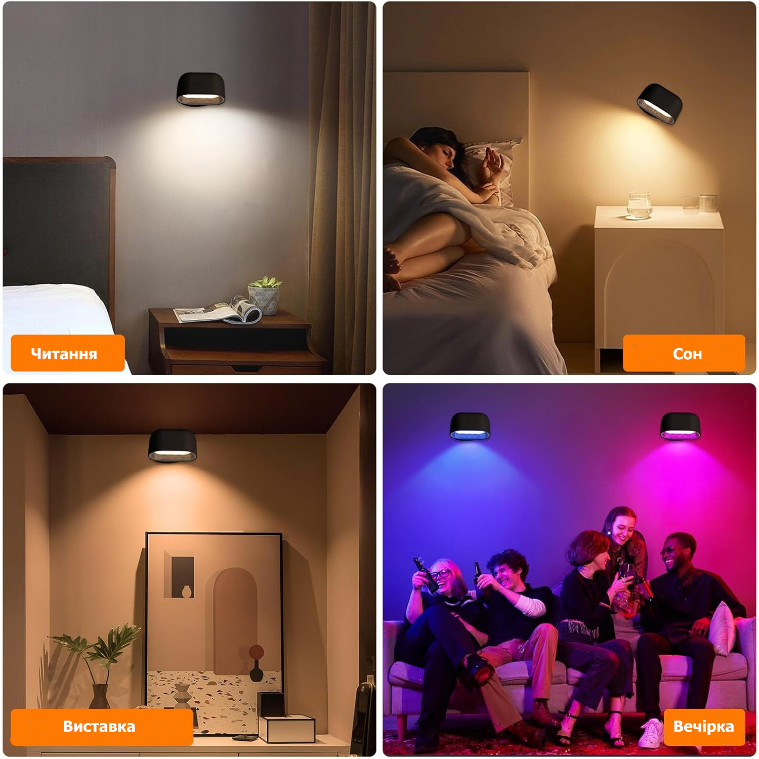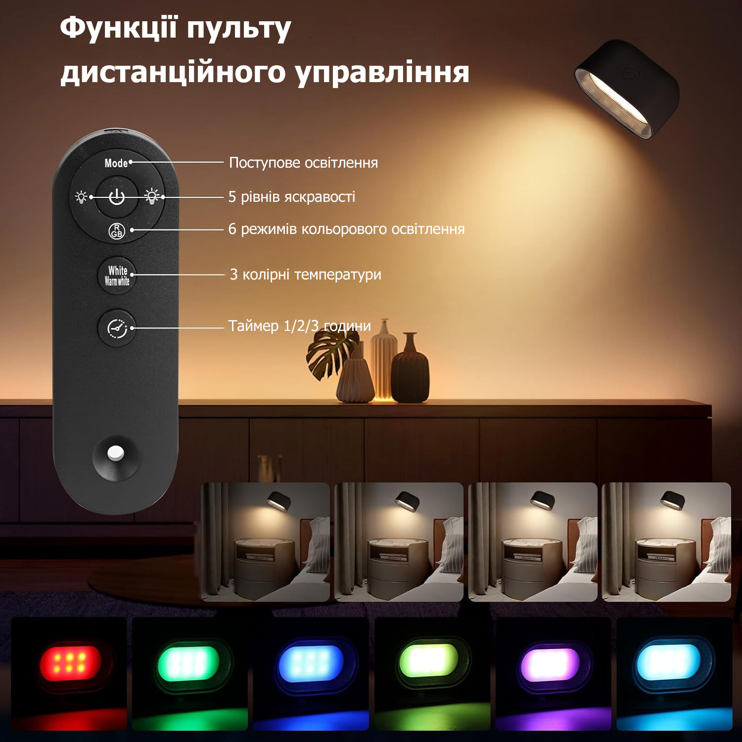 Настінний світлодіодний світильник з акумуляторною батареєю, сенсорним керуванням, обертанням на 360°, 3 режимами яскравості + RGB з пультом дистанційного керування.