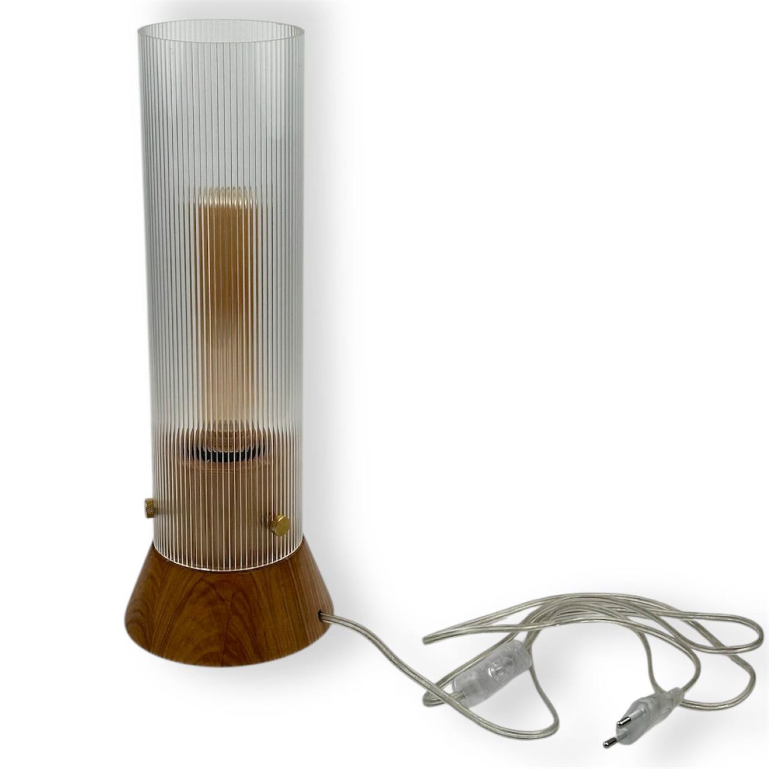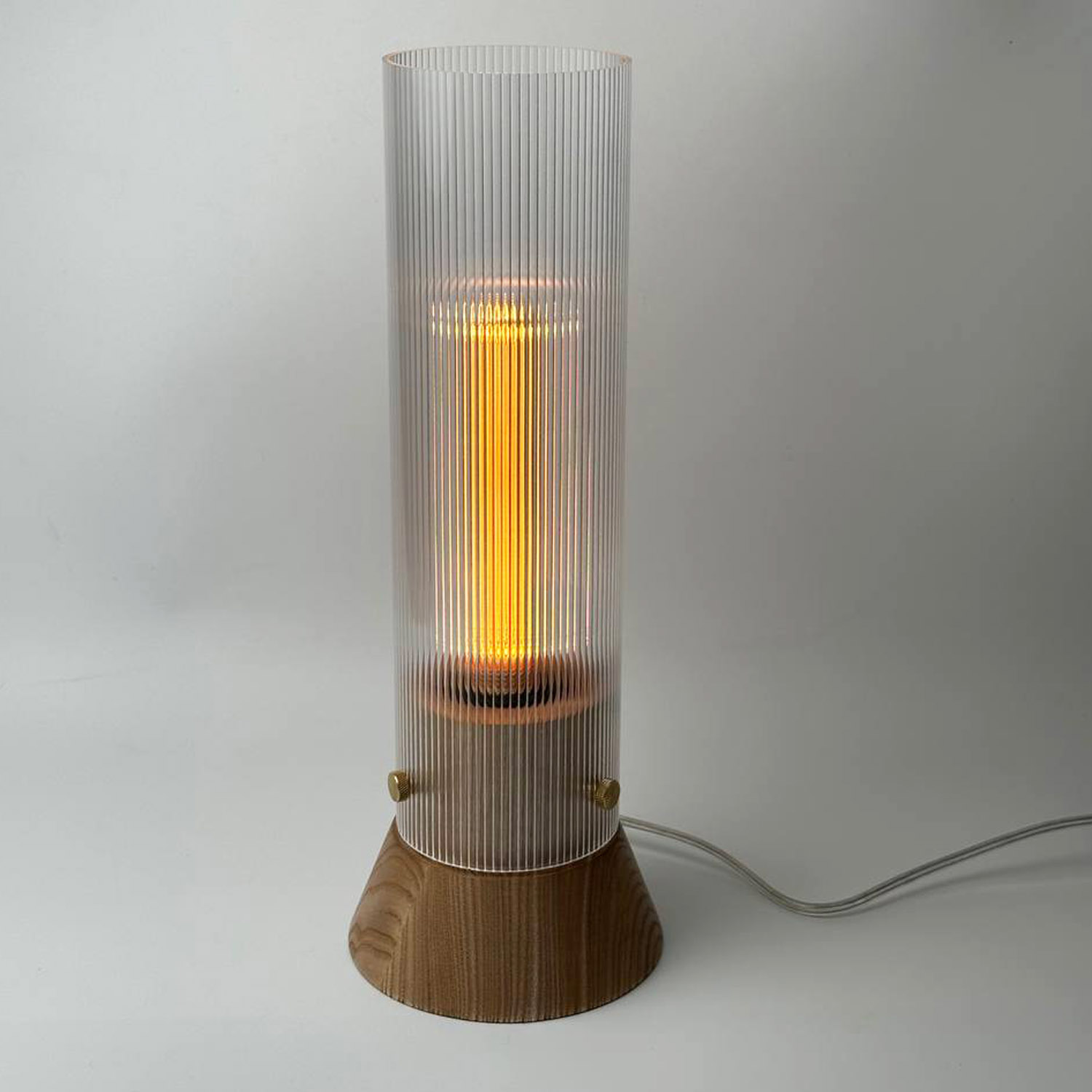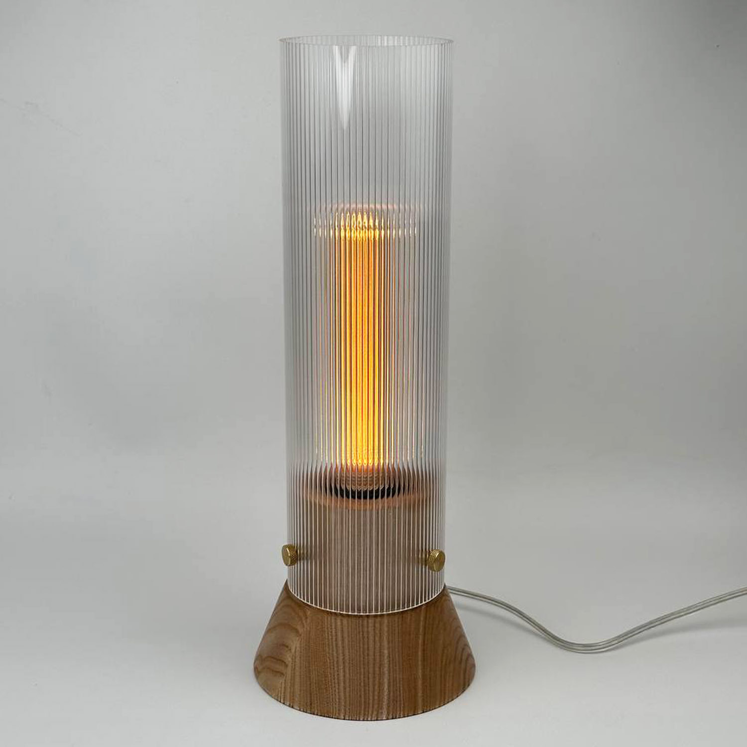 Елегантний настільний світильник із рифленої акрилової труби – це поєднання сучасного стилю та витонченості. Завдяки прозорій текстурі він створює м'яке розсіяне світло, надаючи інтер'єру легкість. Основа з натурального дерева додає теплоти та затишку. Світильник чудово впишеться в інтер'єр, оформлений у сучасному чи скандинавському стилі.