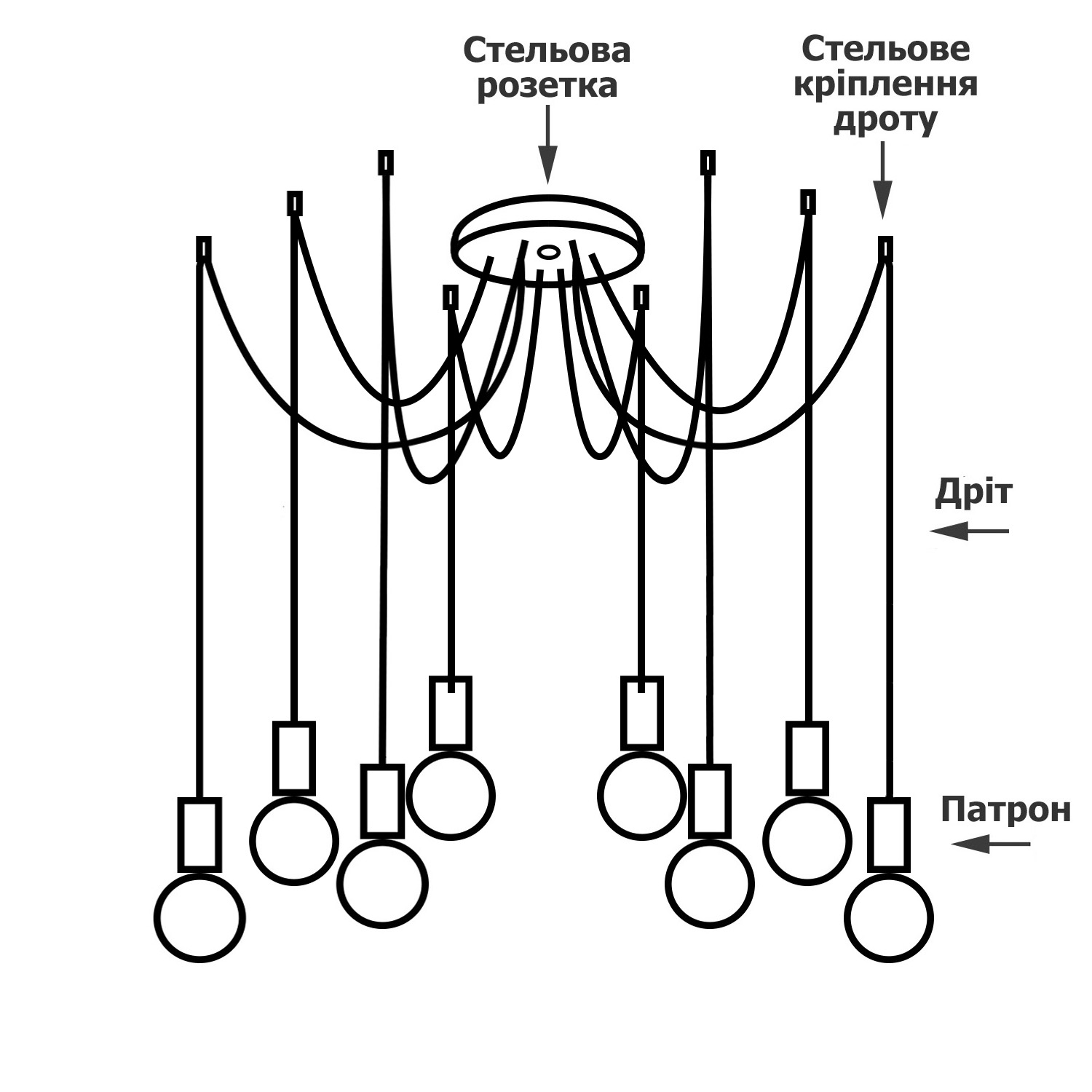 Чорна люстра-павук із металевими на 8 ламп Едісона кріпиться на фігурній стельовій розетці діаметром 200 мм стандартними фіксаторами дроту. До кожної "лапи-підвісу" на металевому патроні Е27 веде чорний ретро дріт у тканинному обплетенні довжиною 1500 мм, який підвішується на чорний пластиковий гачок до стелі на потрібній відстані для надання форми. Без ламп у комплекті.