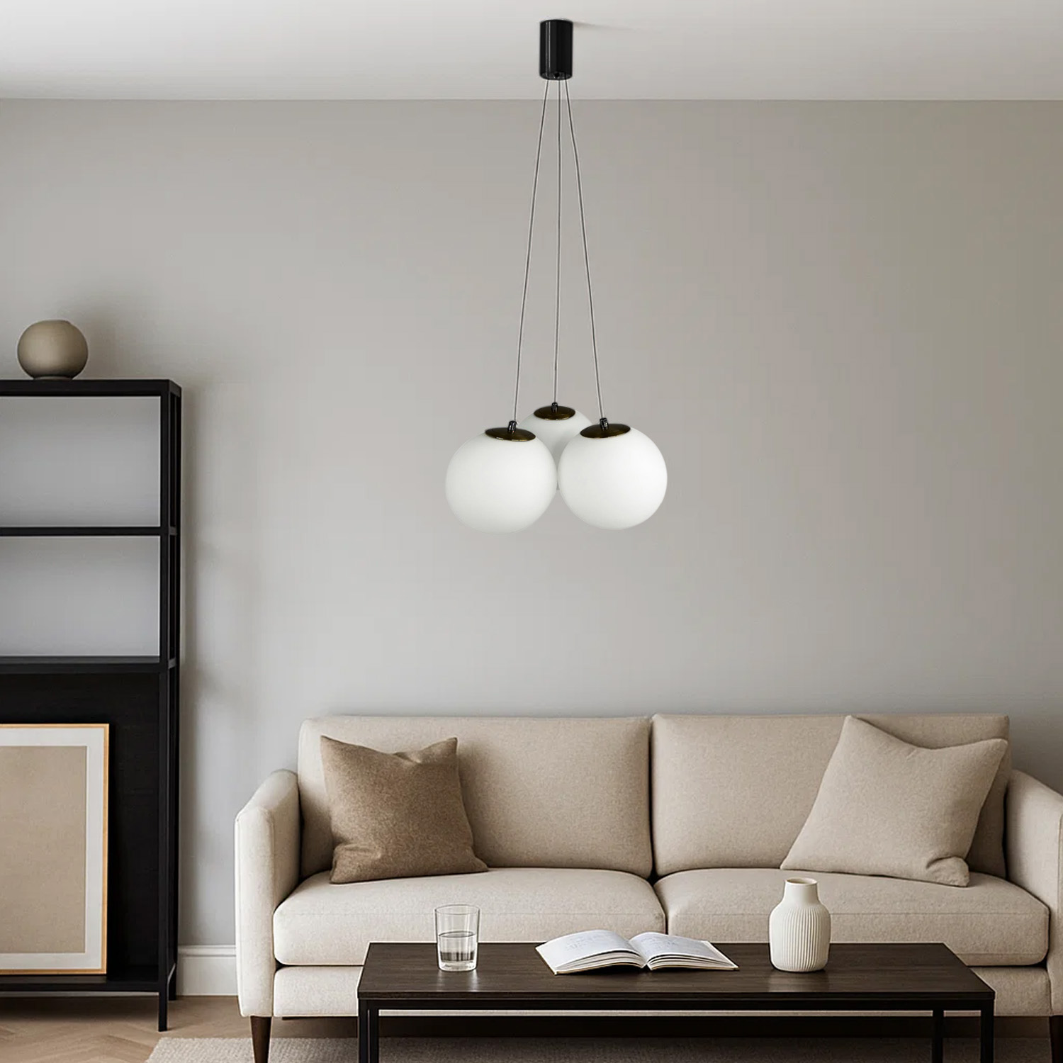 Сучасна дизайнерська люстра з трьома скляними кулями створює відчуття легкості та невагомості завдяки прозорим проводам. Кулі утворюють гармонійну композицію, яка підходить як для просторих віталень, так і стильних холів або столових зон. Діаметр одного плафона – 130см, що робить люстру помітним акцентом в інтер'єрі.