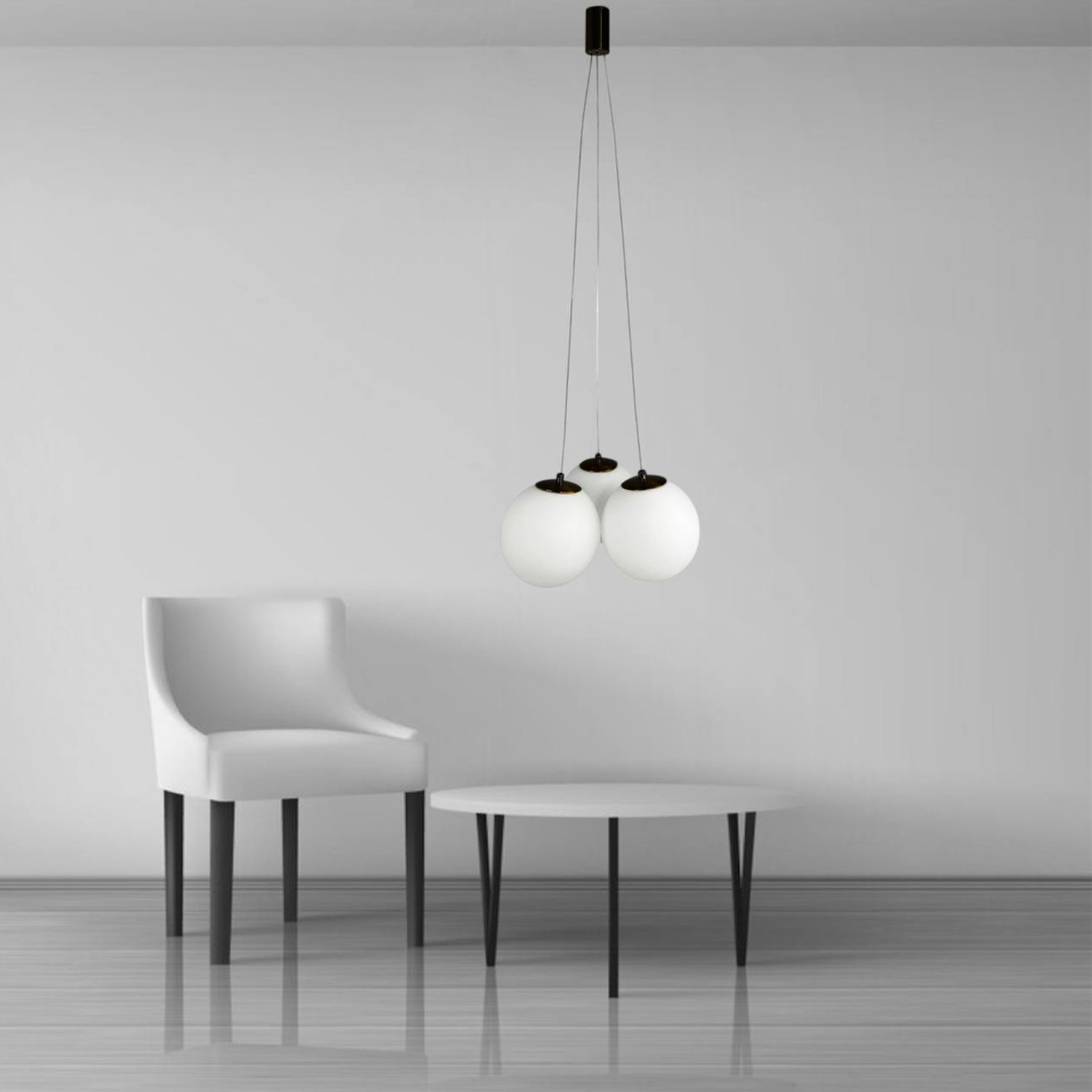 Сучасна дизайнерська люстра з трьома скляними кулями створює відчуття легкості та невагомості завдяки прозорим проводам. Кулі утворюють гармонійну композицію, яка підходить як для просторих віталень, так і стильних холів або столових зон. Діаметр одного плафона – 150 см, що робить люстру помітним акцентом в інтер'єрі.