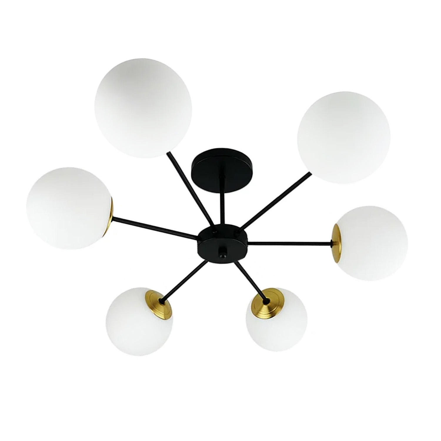Сучасна люстра з вісьма матовими скляними плафонами – це вдале поєднання мінімалізму та елегантності. Чорні металеві промені рівномірно розходяться від центральної основи, створюючи ефектну симетрію та візуальну легкість.Плафони з матового скла м'яко розсіюють світло, роблячи освітлення затишним та рівномірним.