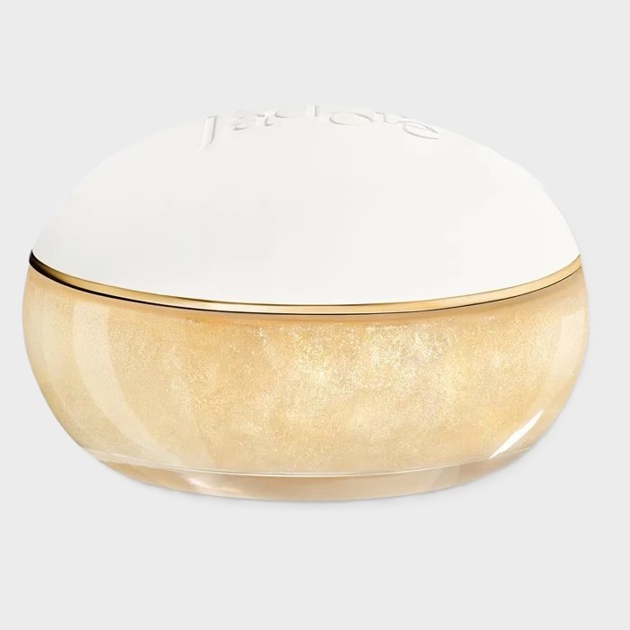 Гель виблискує золотистим кольором у тонкій скляній банці, вигини якої нагадують перлину на флаконі J'adore.